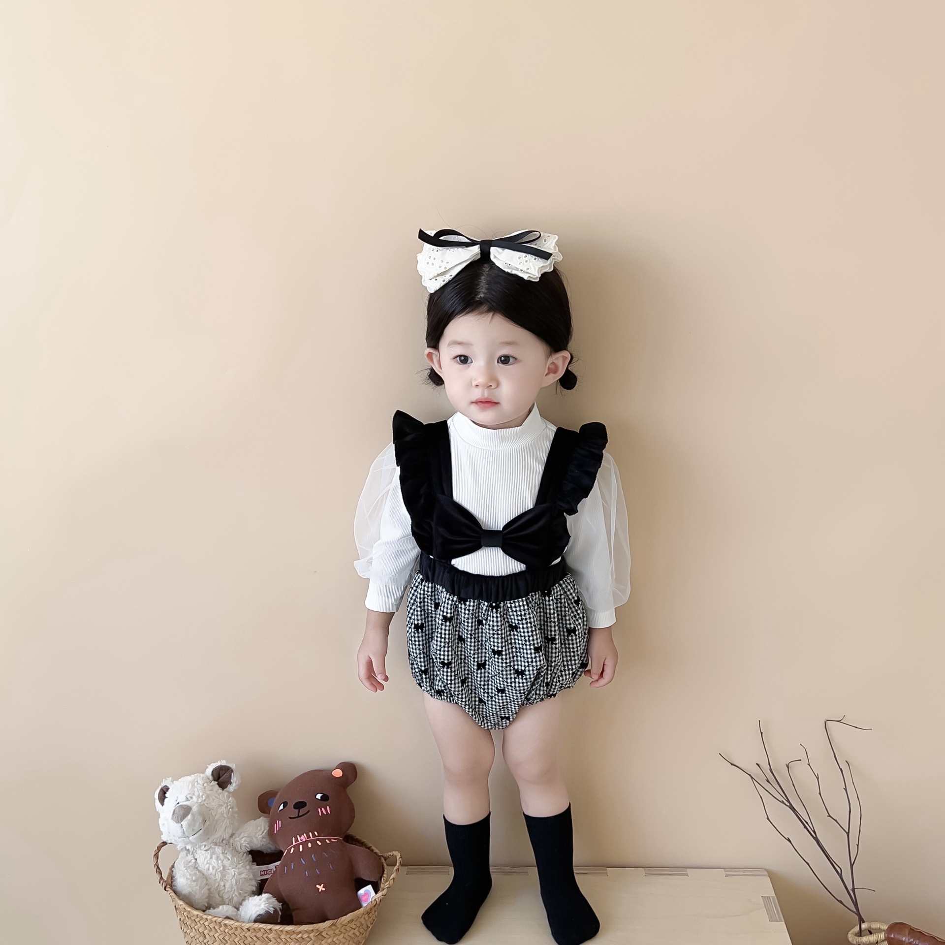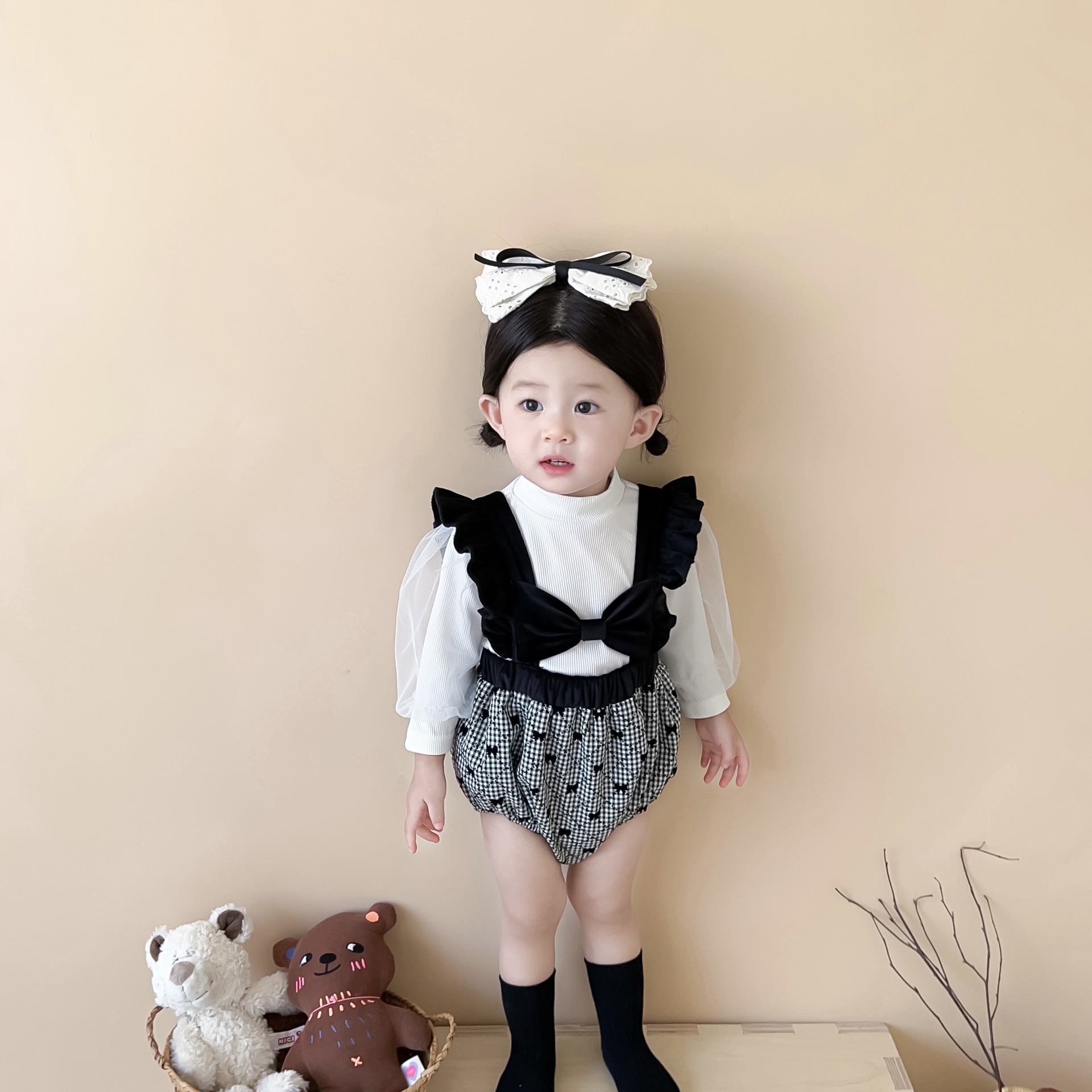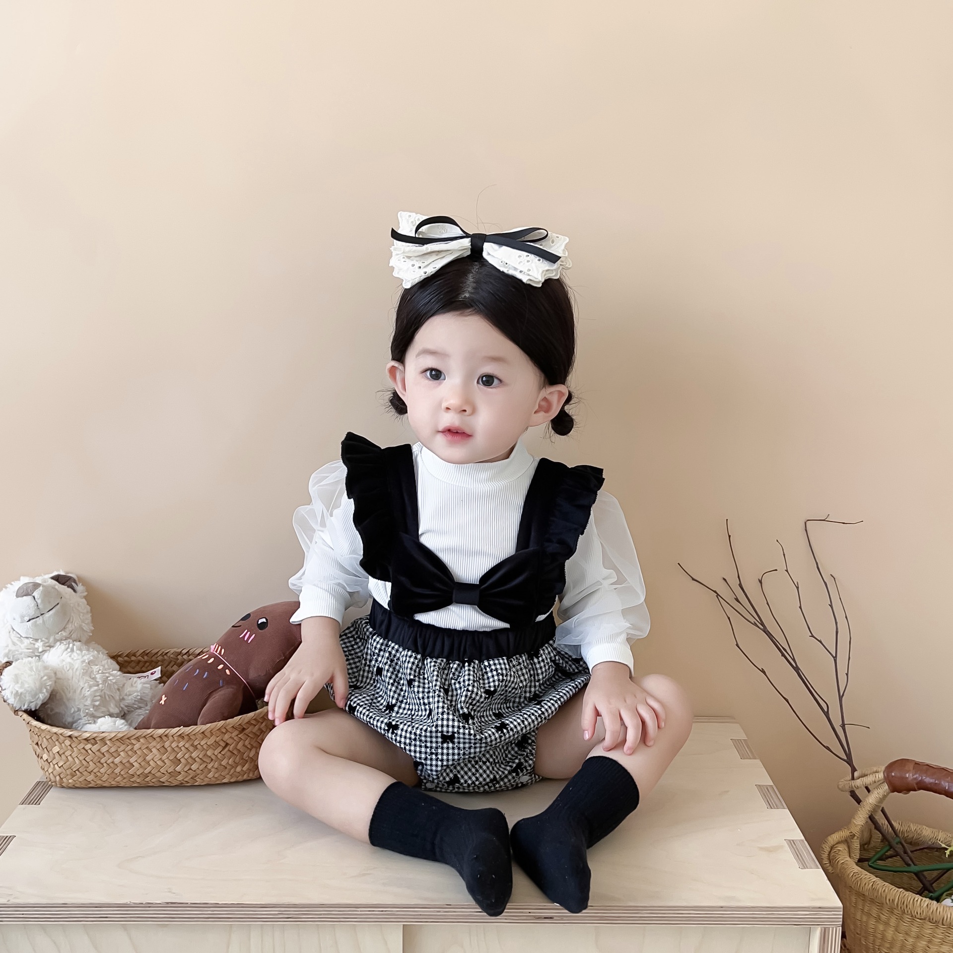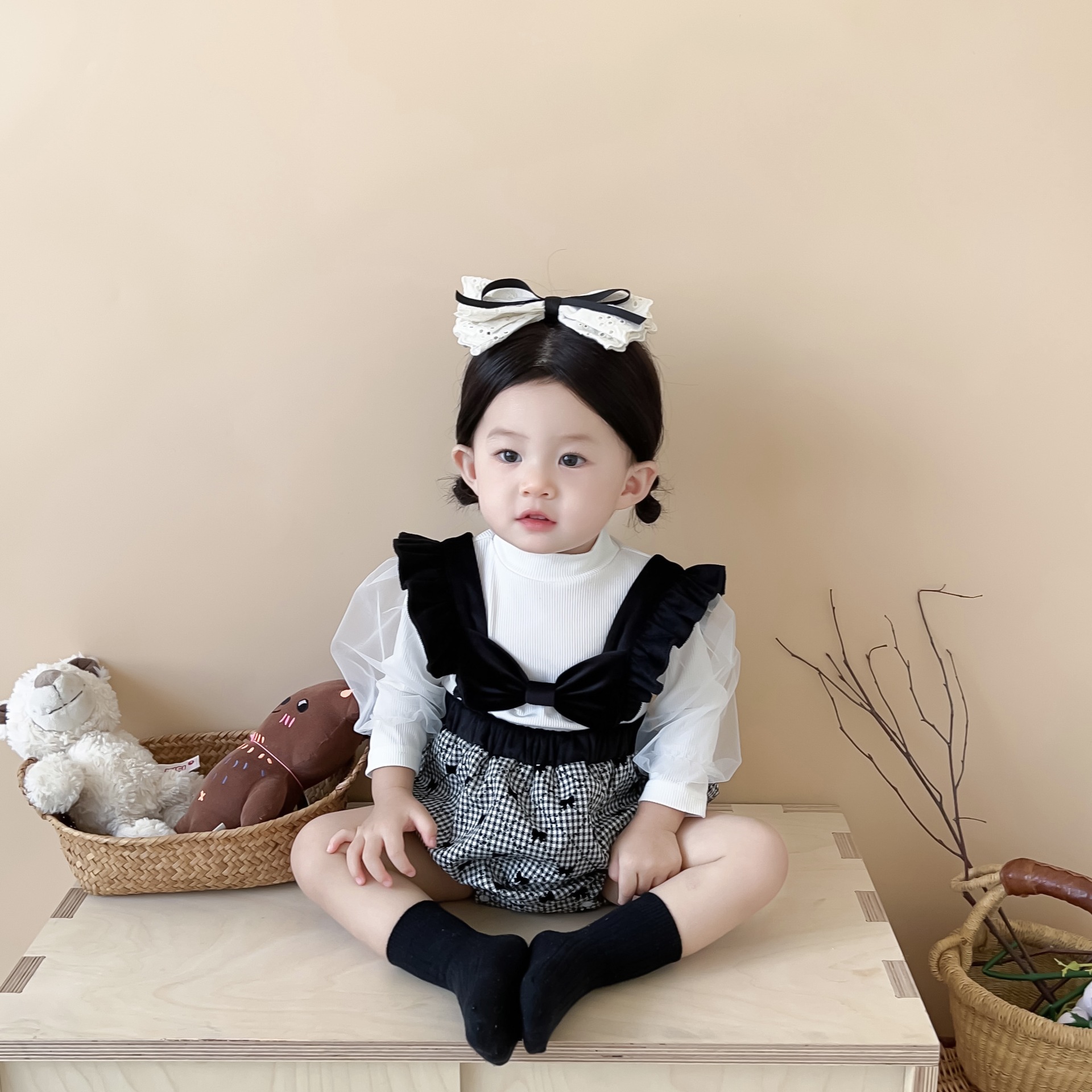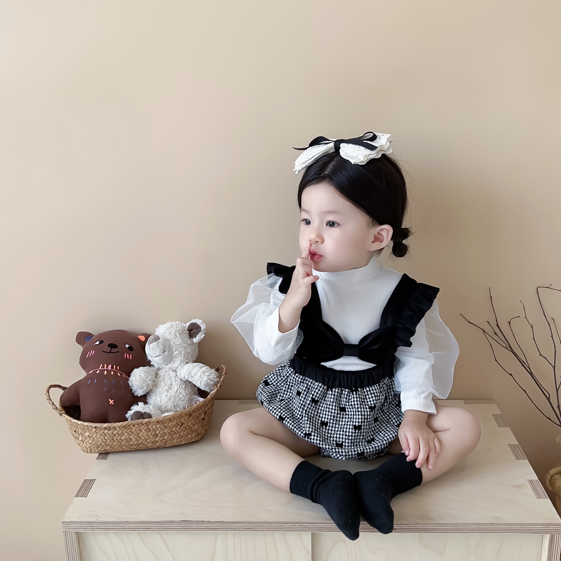 【柔软的面料,亲肤般的触感!】婴儿衣服秋款千鸟格蝴蝶结背带包屁哈衣套装婴儿泡泡袖打底两件套
