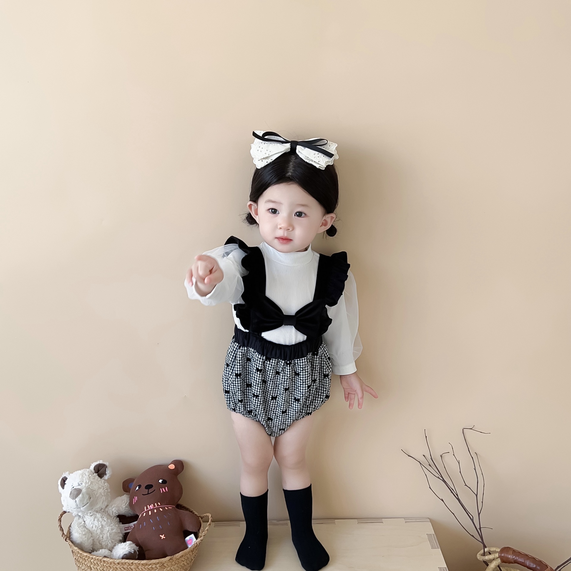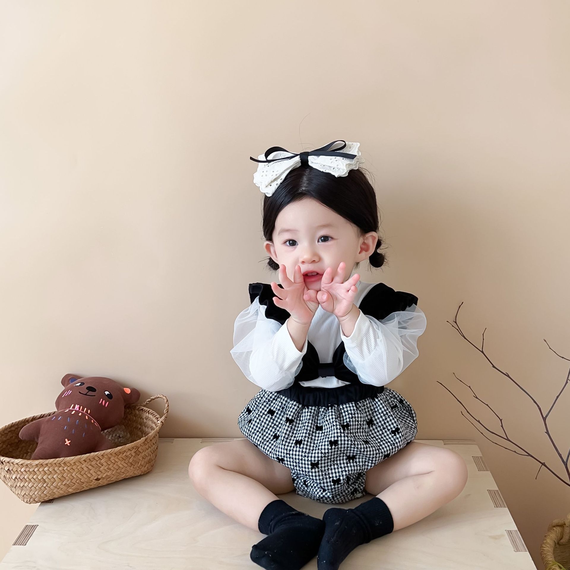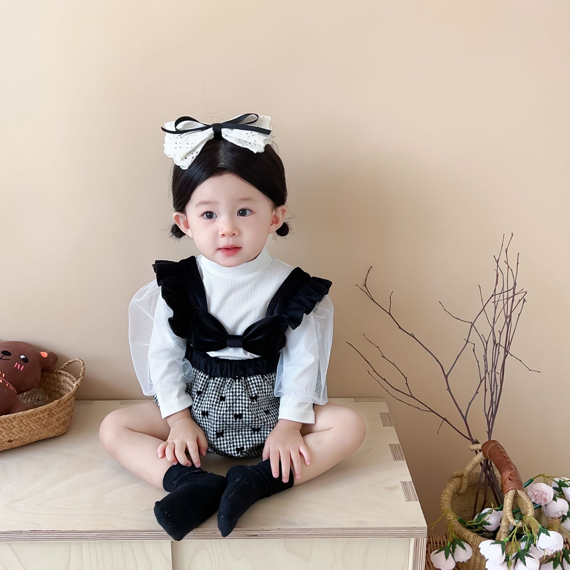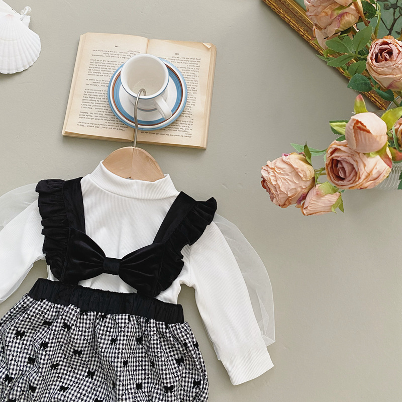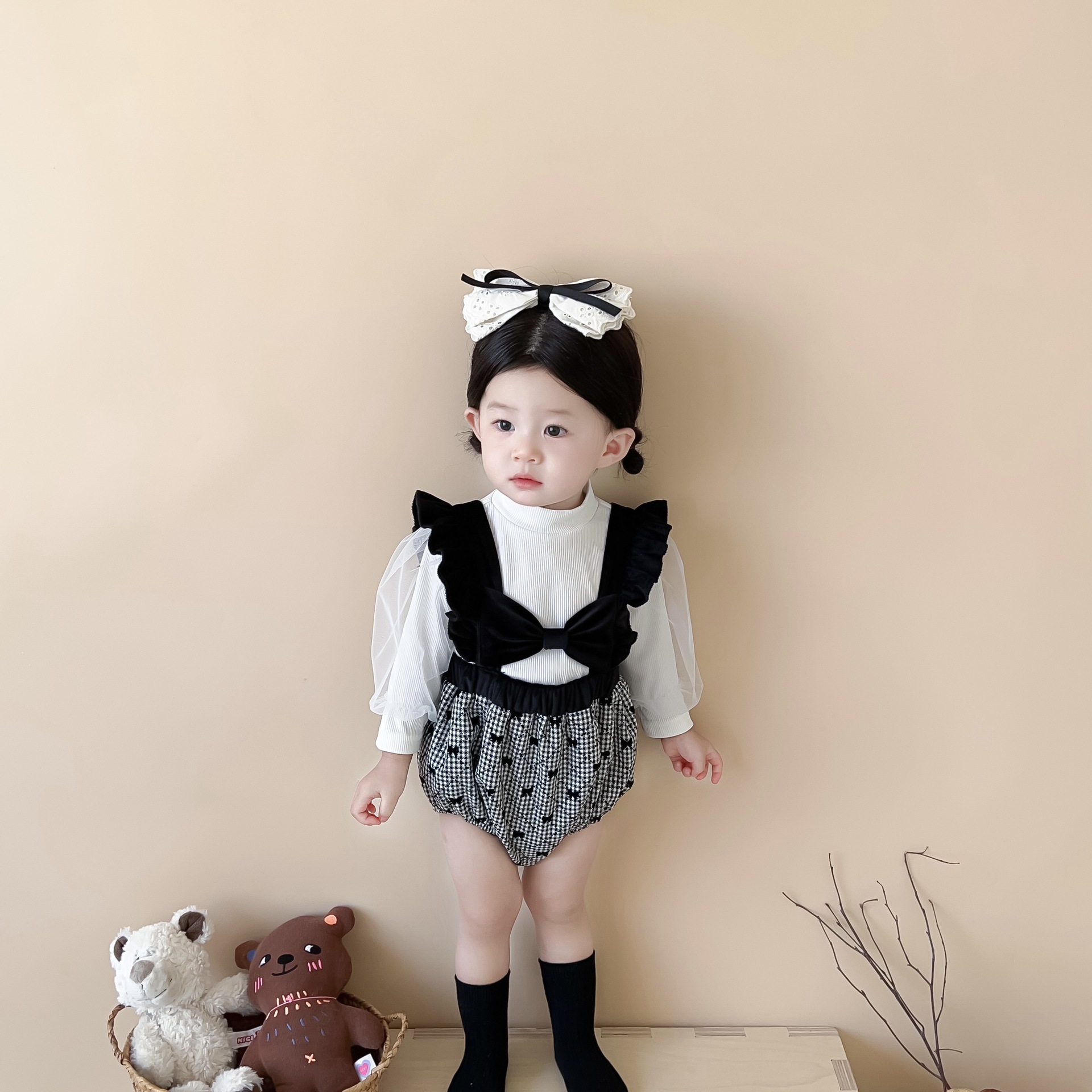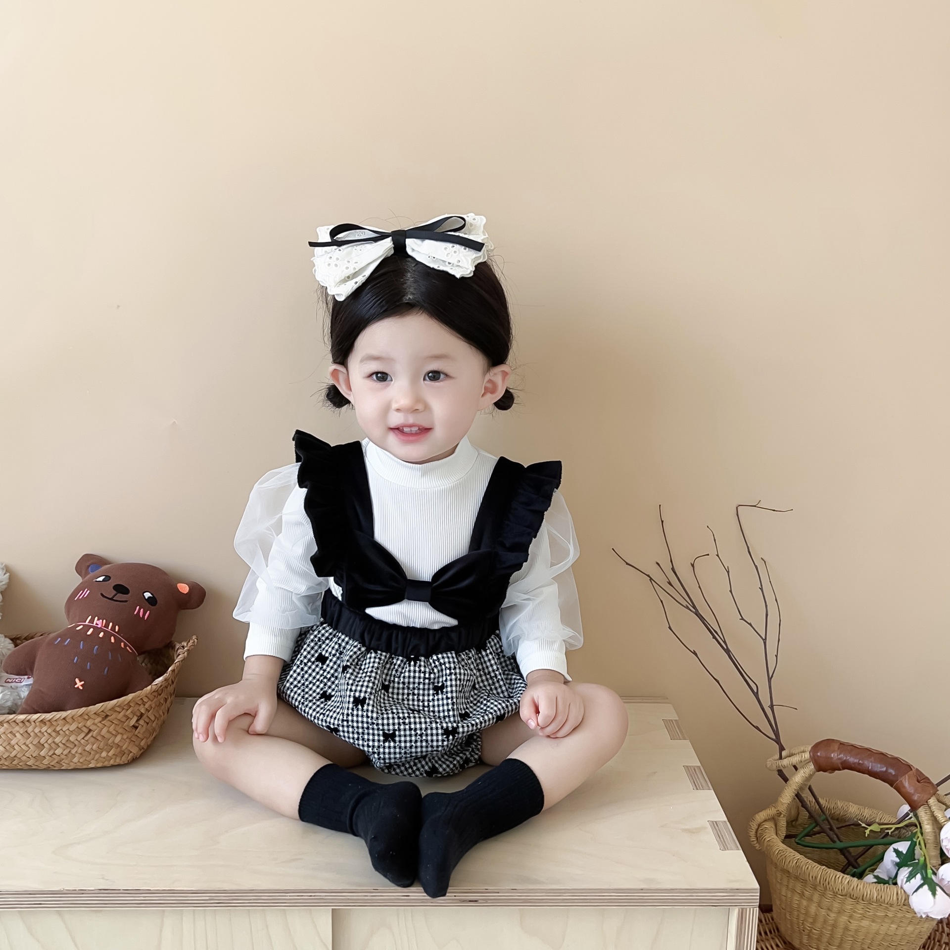 【柔软的面料,亲肤般的触感!】婴儿衣服秋款千鸟格蝴蝶结背带包屁哈衣套装婴儿泡泡袖打底两件套