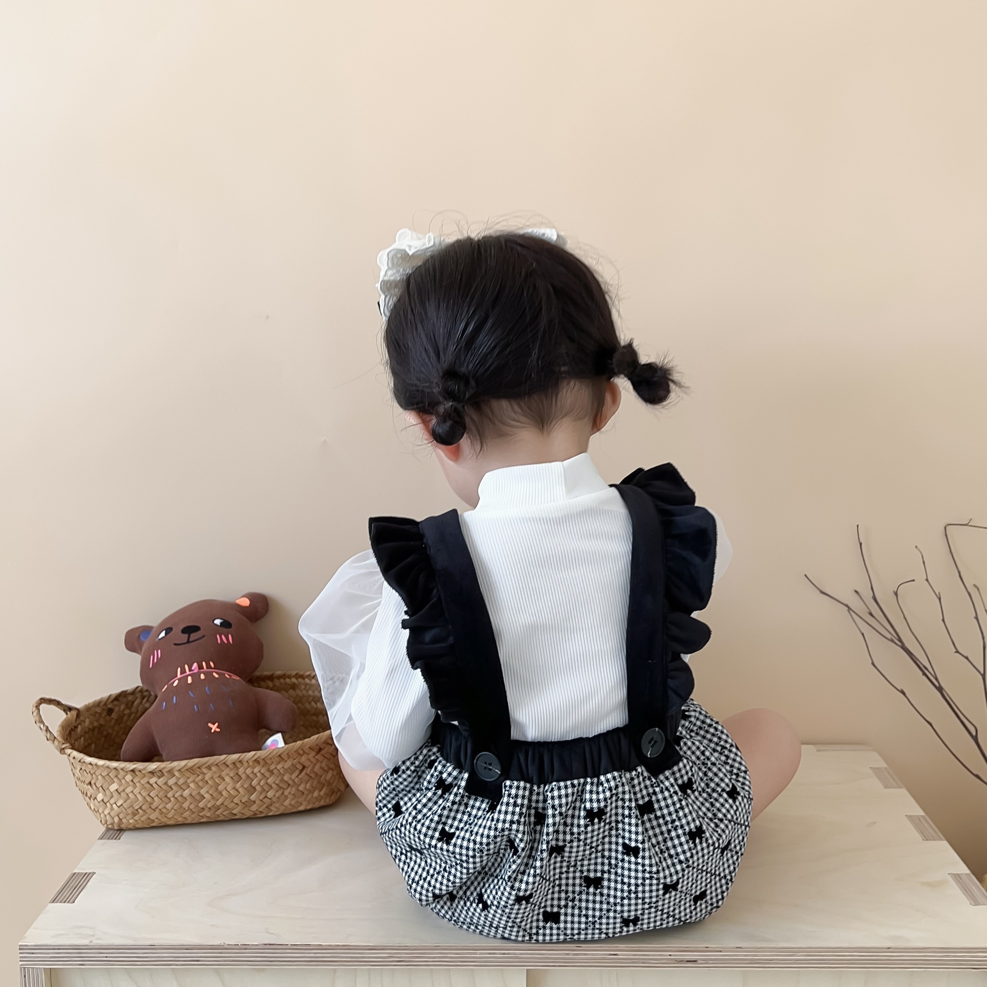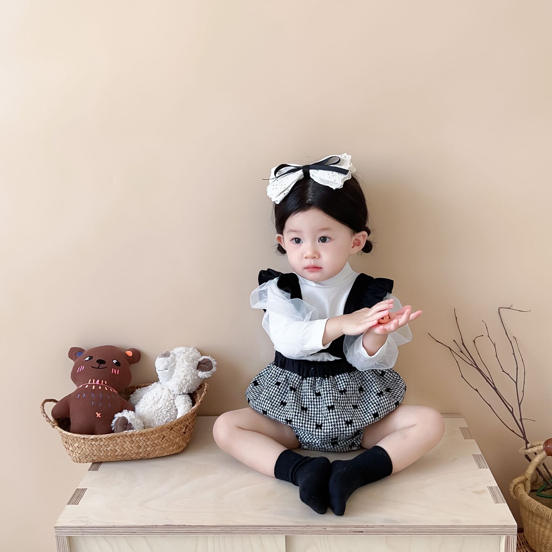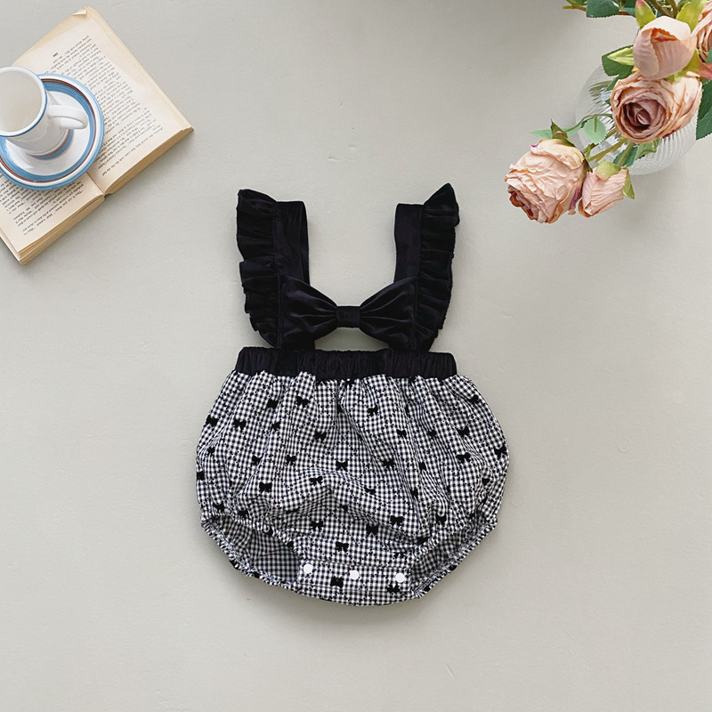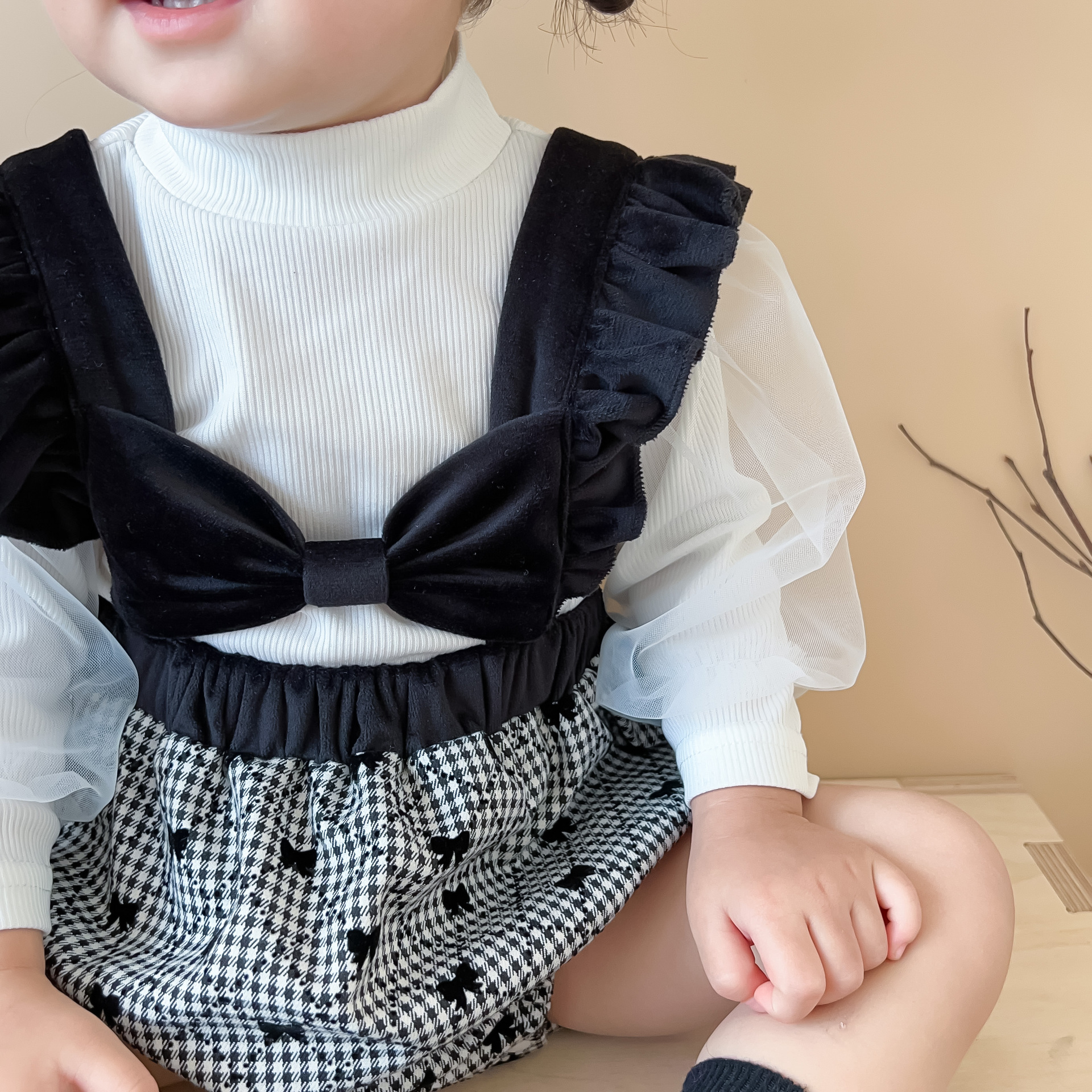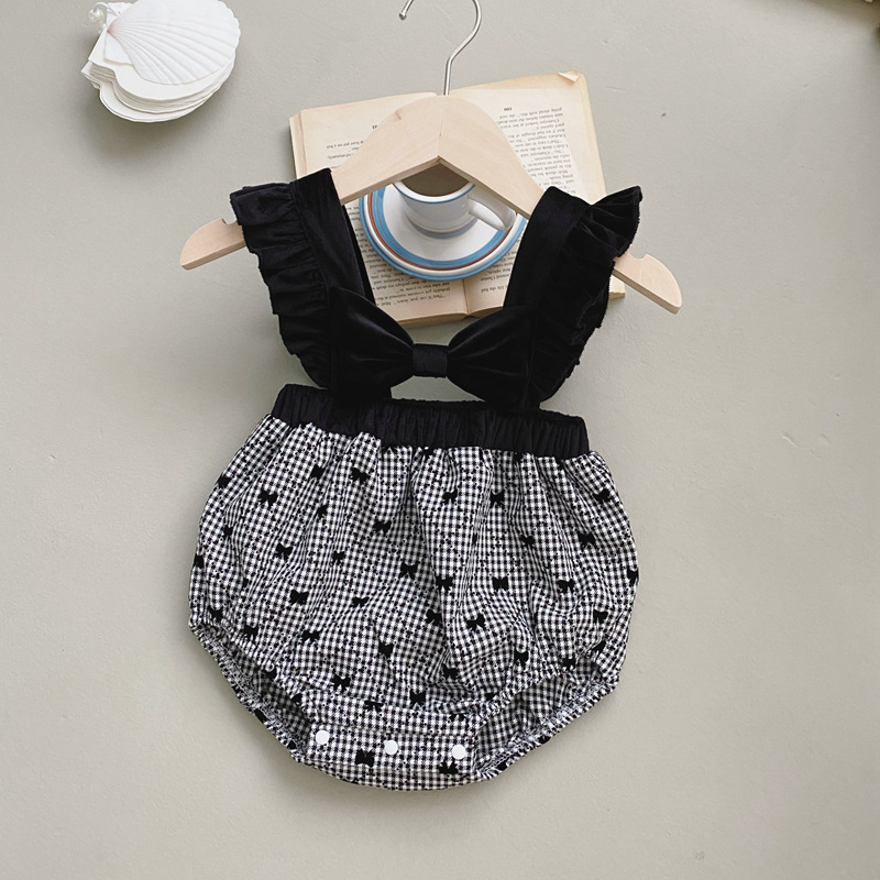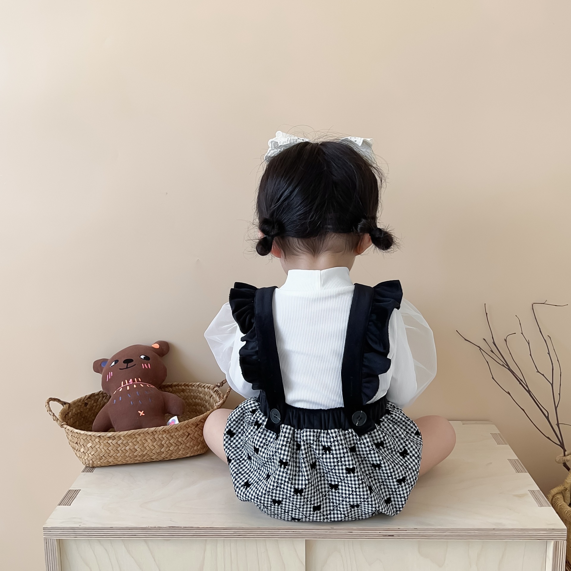 【柔软的面料,亲肤般的触感!】婴儿衣服秋款千鸟格蝴蝶结背带包屁哈衣套装婴儿泡泡袖打底两件套