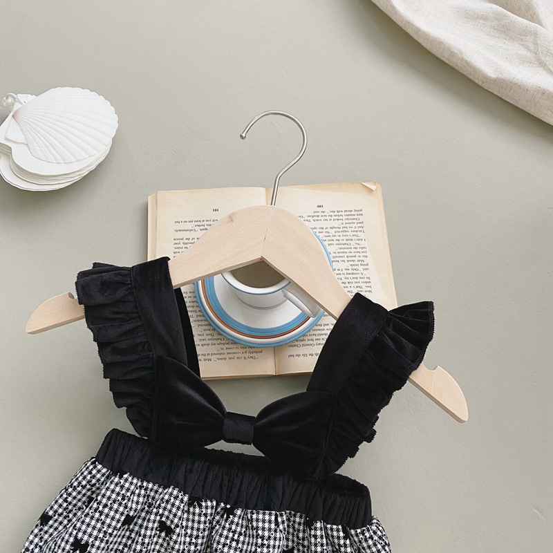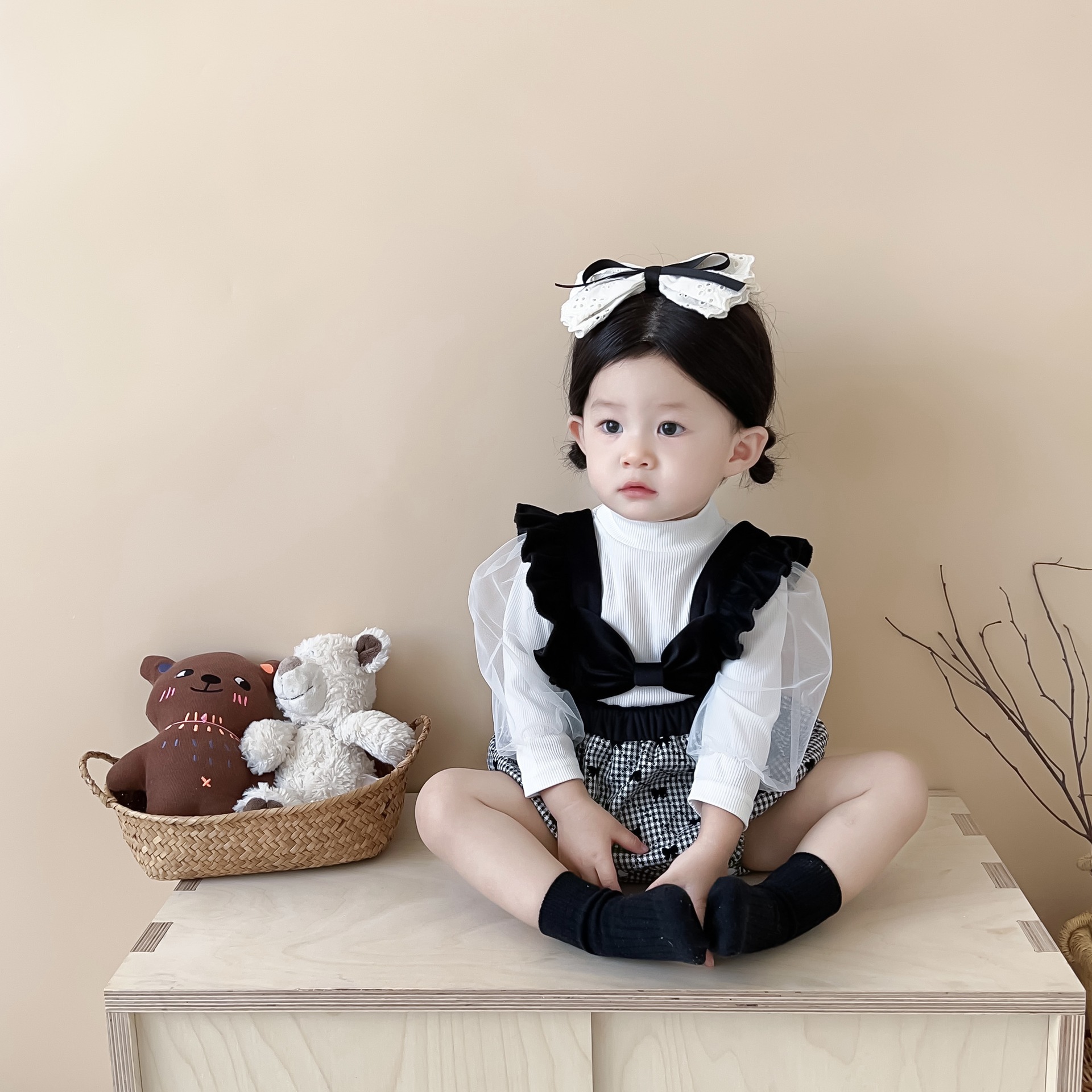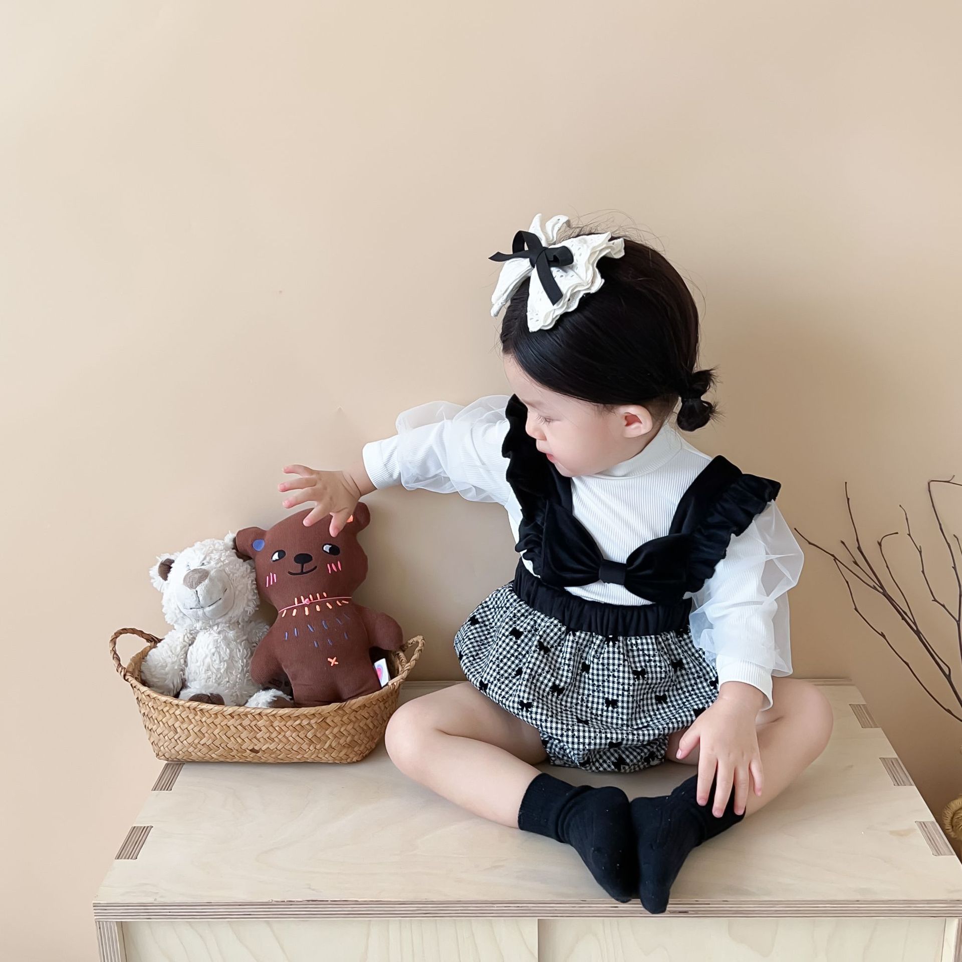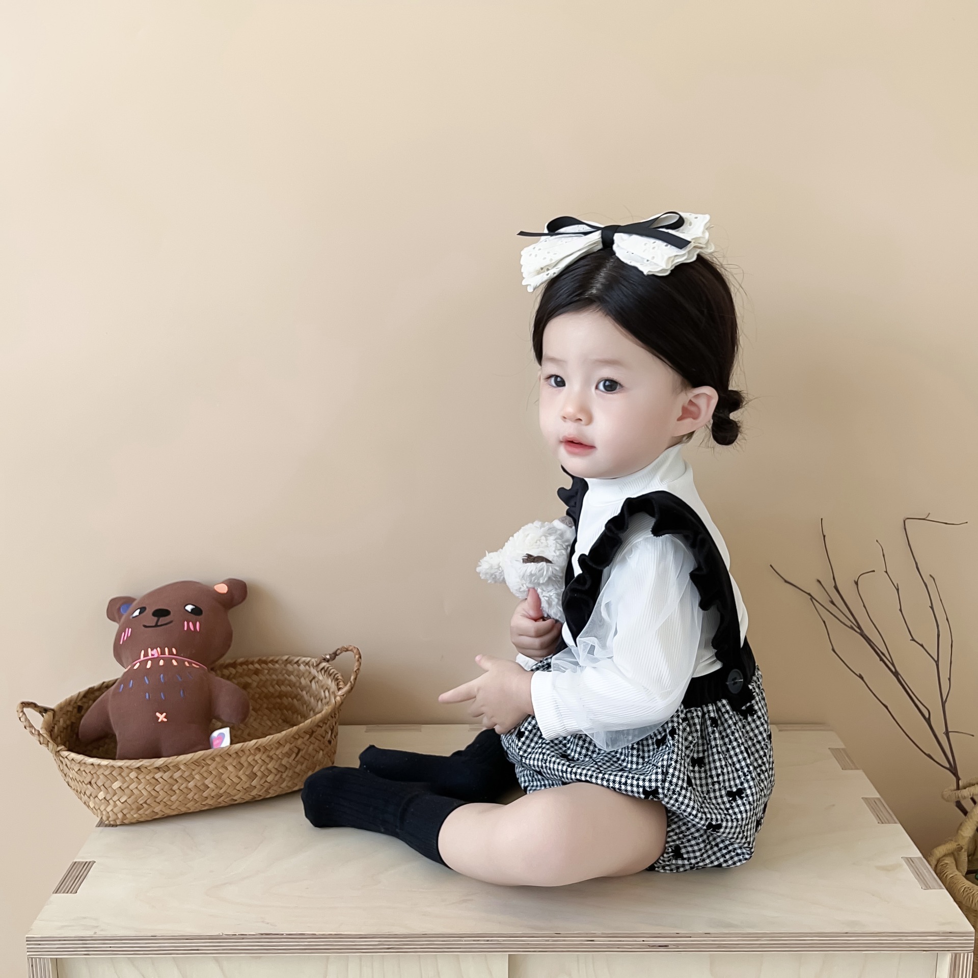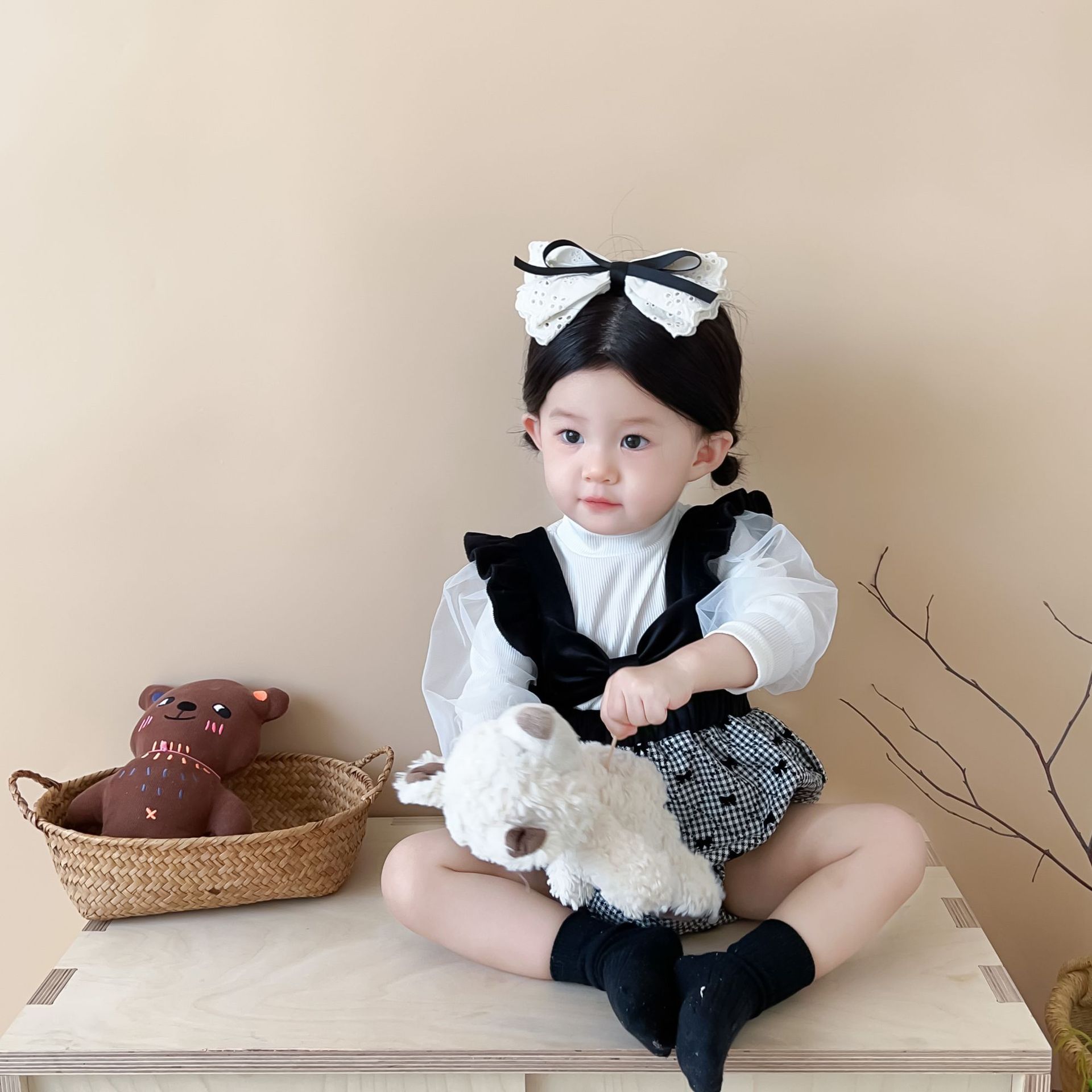 【柔软的面料,亲肤般的触感!】婴儿衣服秋款千鸟格蝴蝶结背带包屁哈衣套装婴儿泡泡袖打底两件套