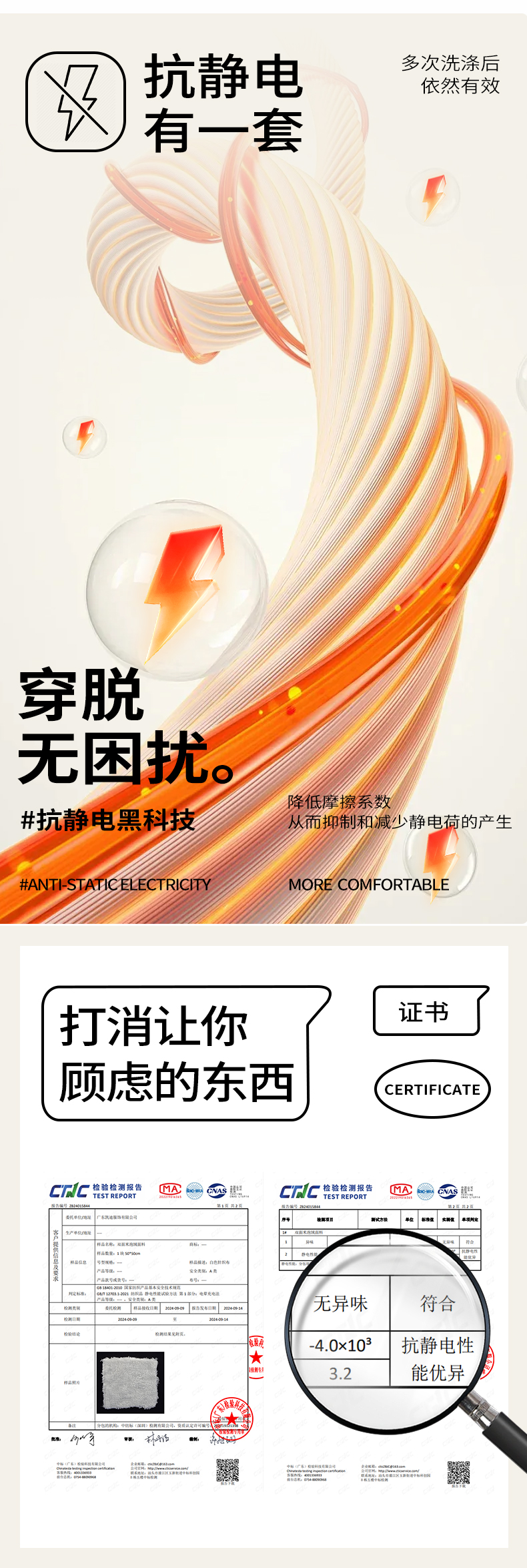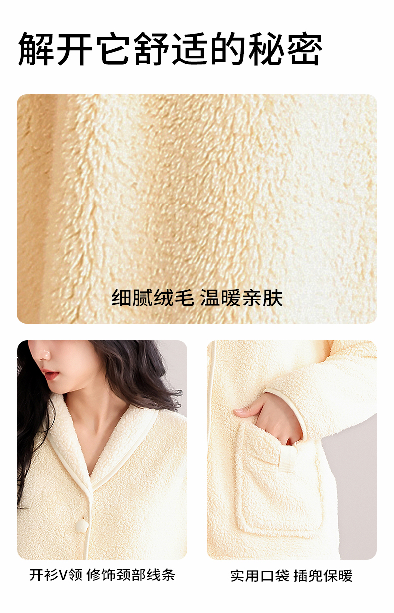 1.优质面料:将温暖治愈锁在身上的一款仿半边米泡绒+导电丝面料,一件专门为寒冷天气设计的双面绒家居服,外观自带半边绒的轻盈细腻慵懒感,内层仿羊羔绒蓄温保暖,添加的导电纤维,让整个肌肤与这个冬天亲密无间,减少静电的烦扰,还可以随意机洗,不需特殊打理,光是面料就已经扛打了,您还有什么顾虑呢?