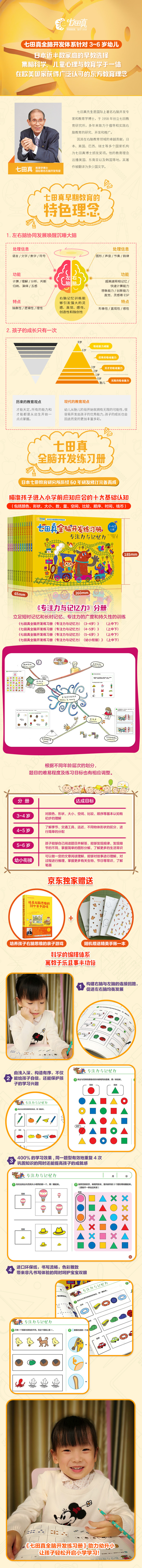 《七田真全脑开发练习册》是日本七田教育研究所历经60年不断研发修订完善而成的,本套系着重训练孩子的专注力与记忆力,包含3~4岁、4~5岁、5~6岁、幼小衔接四个分册。