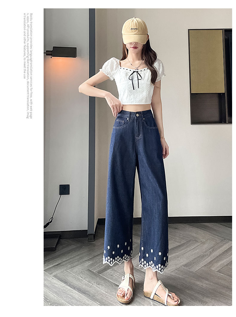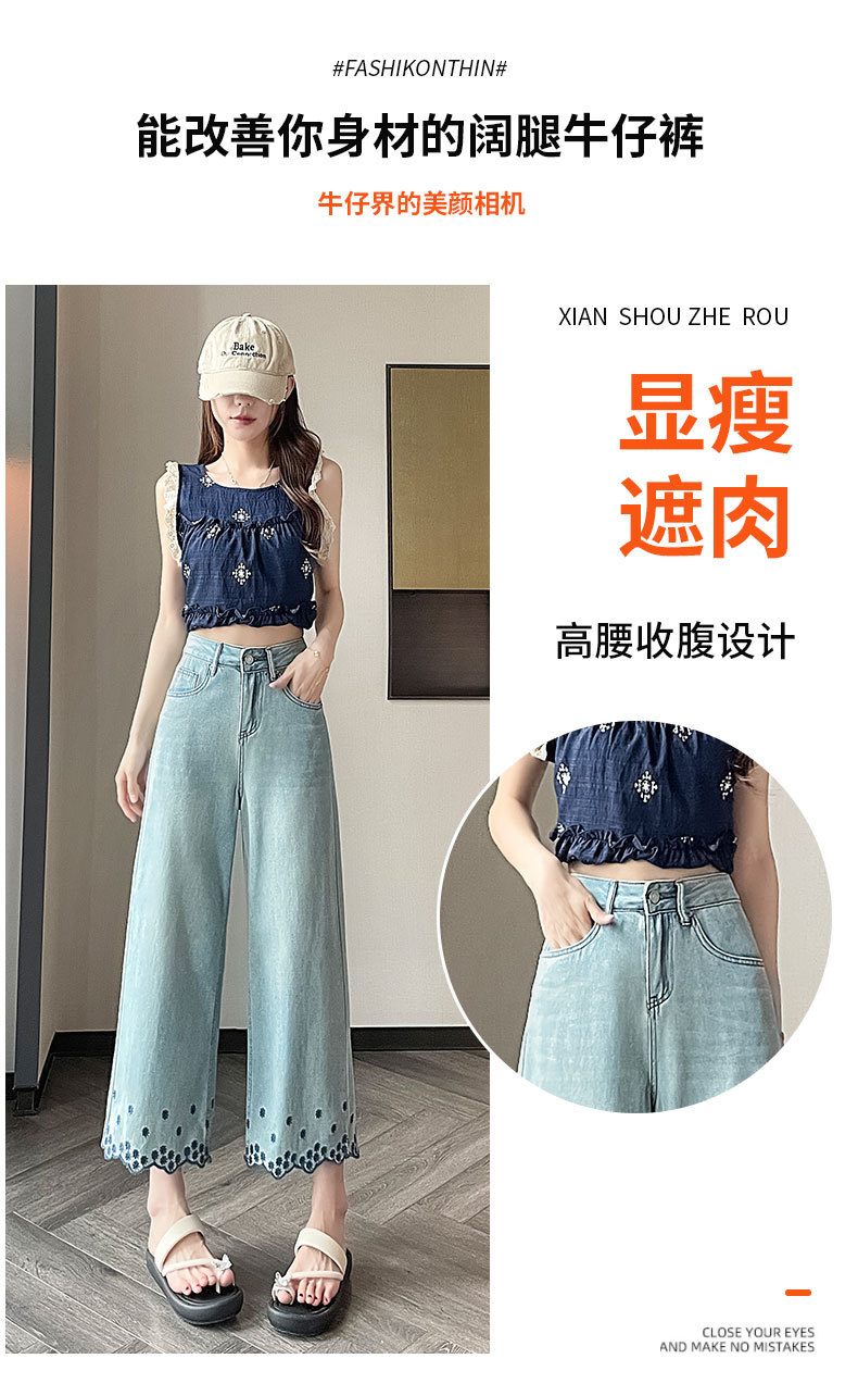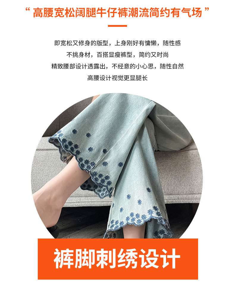 雀说蓝国风刺绣牛仔裤新款减龄高腰宽松直筒裤AL8922