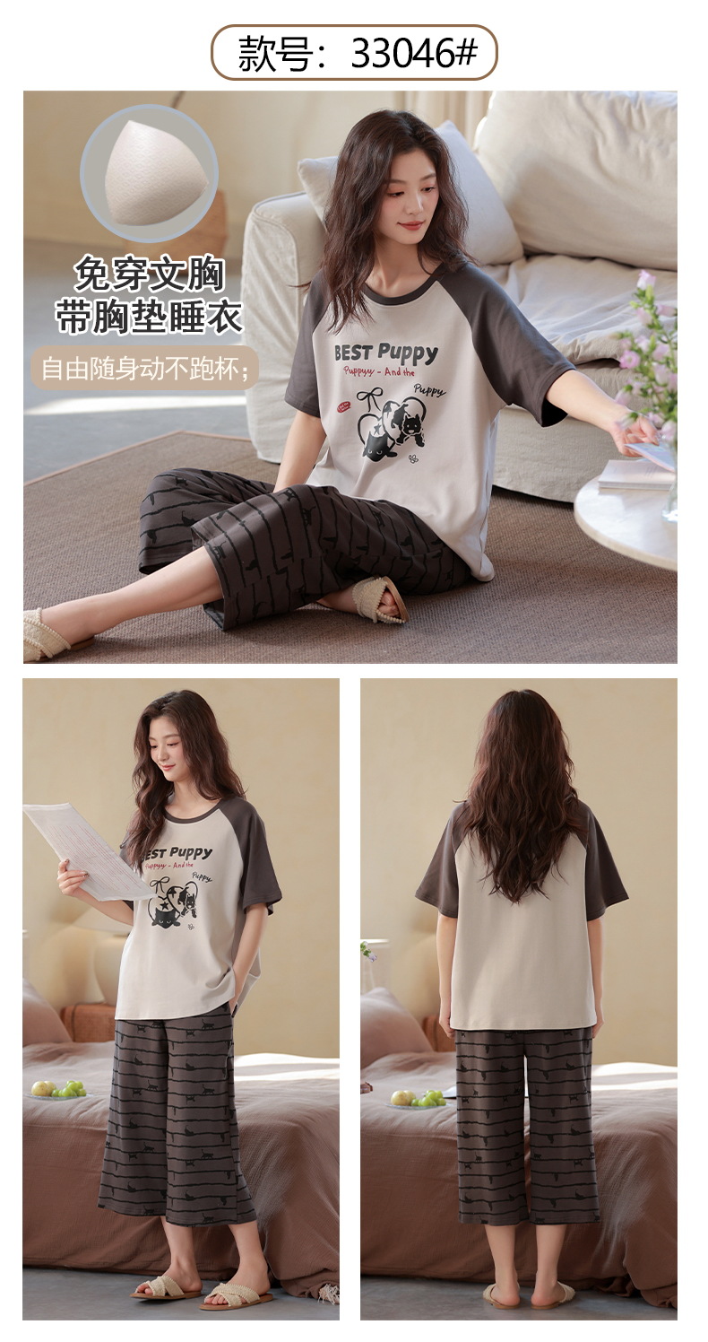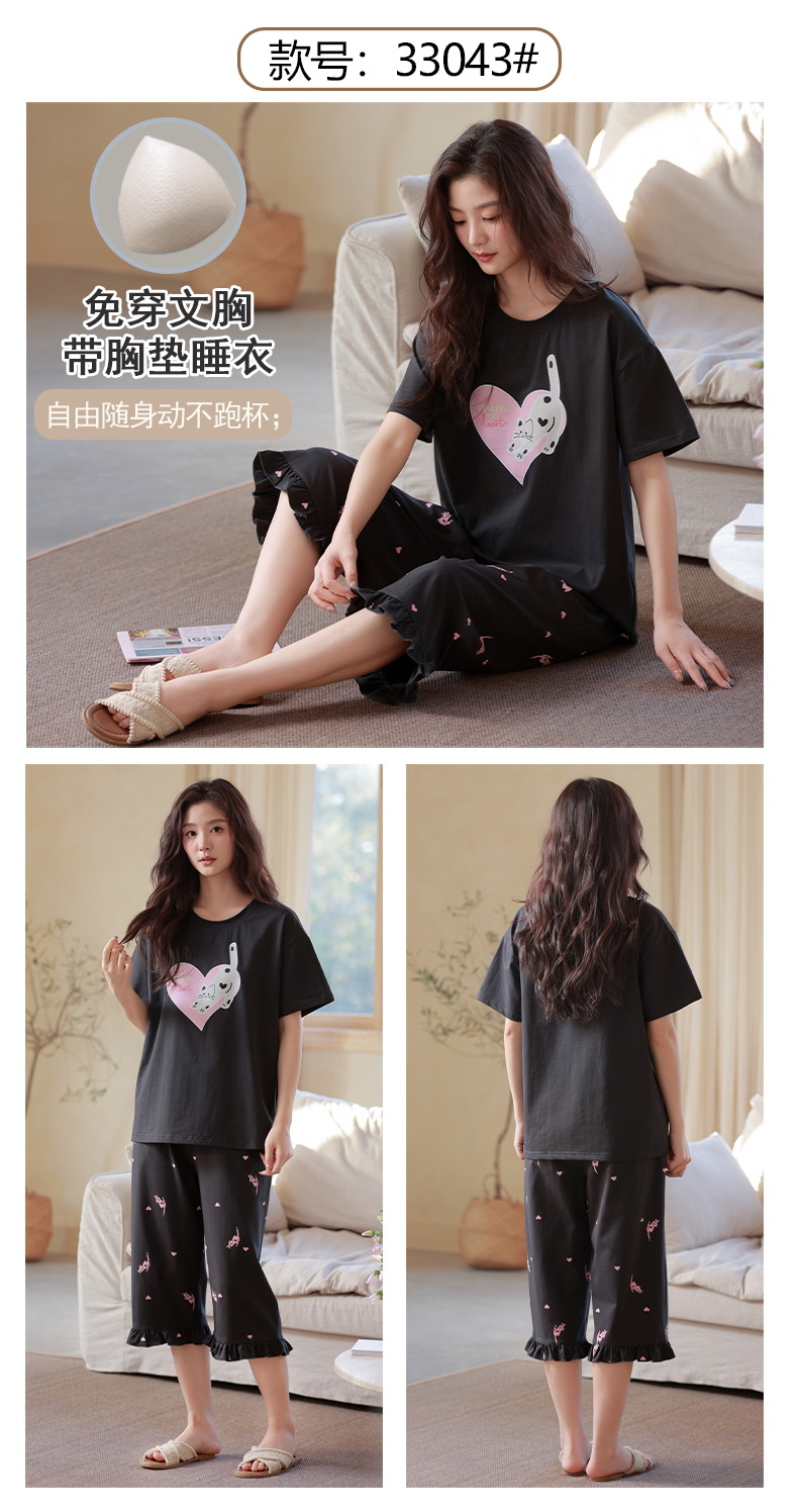 雀说 【带胸垫】纯棉睡衣女薄款短袖七分裤两件套 商品图3