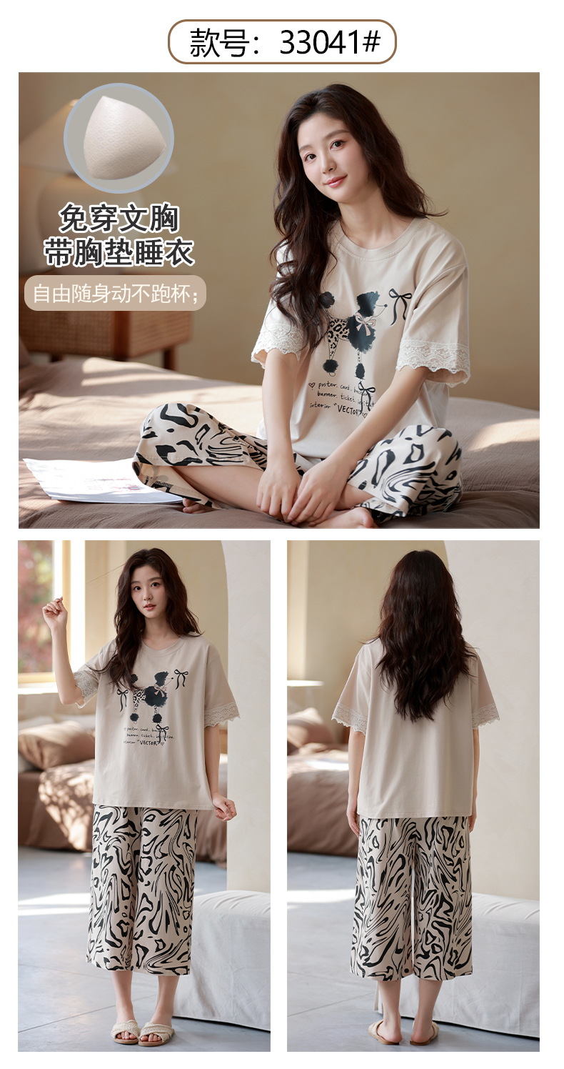 雀说 【带胸垫】纯棉睡衣女薄款短袖七分裤两件套 商品图1