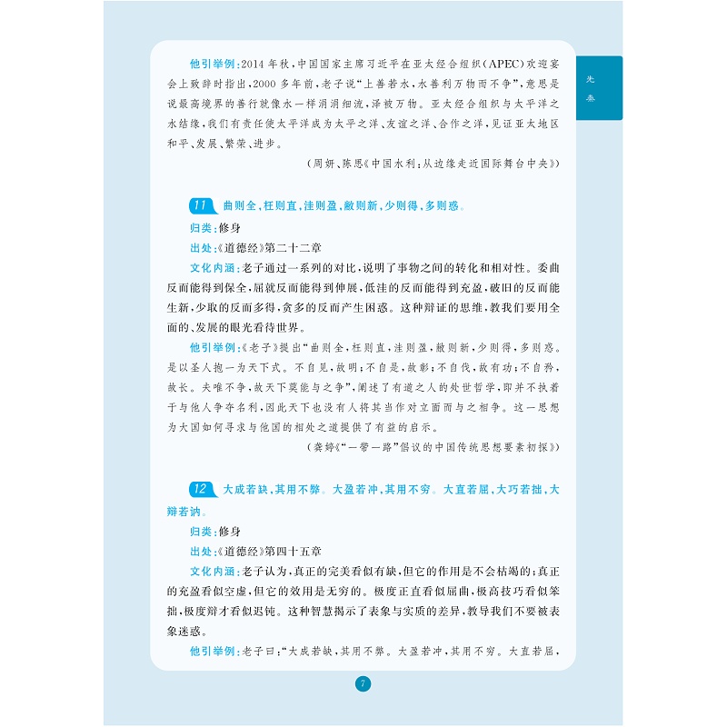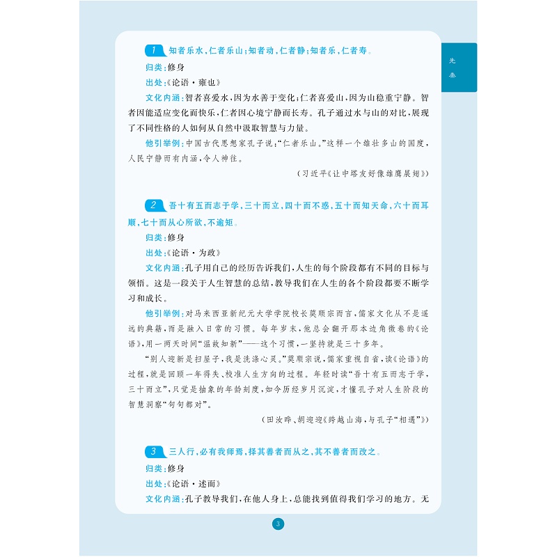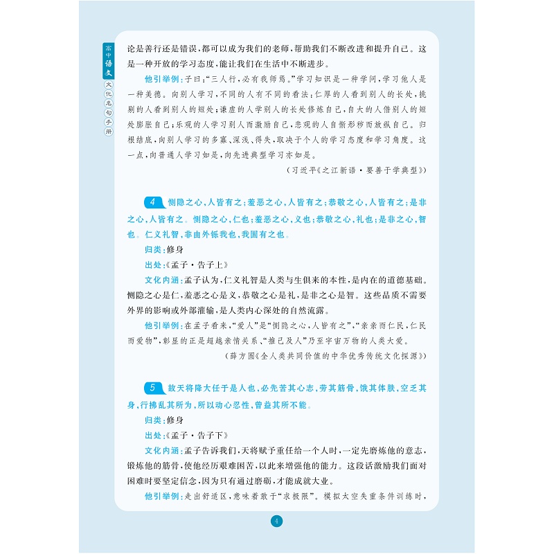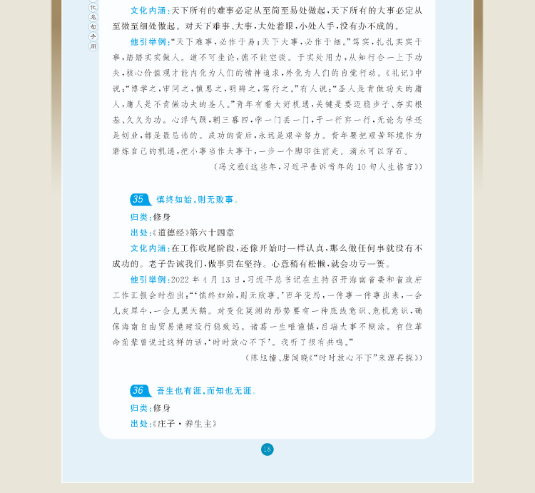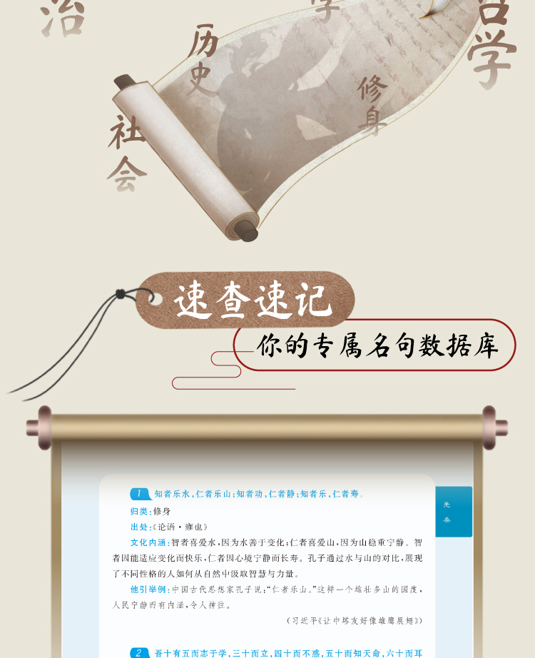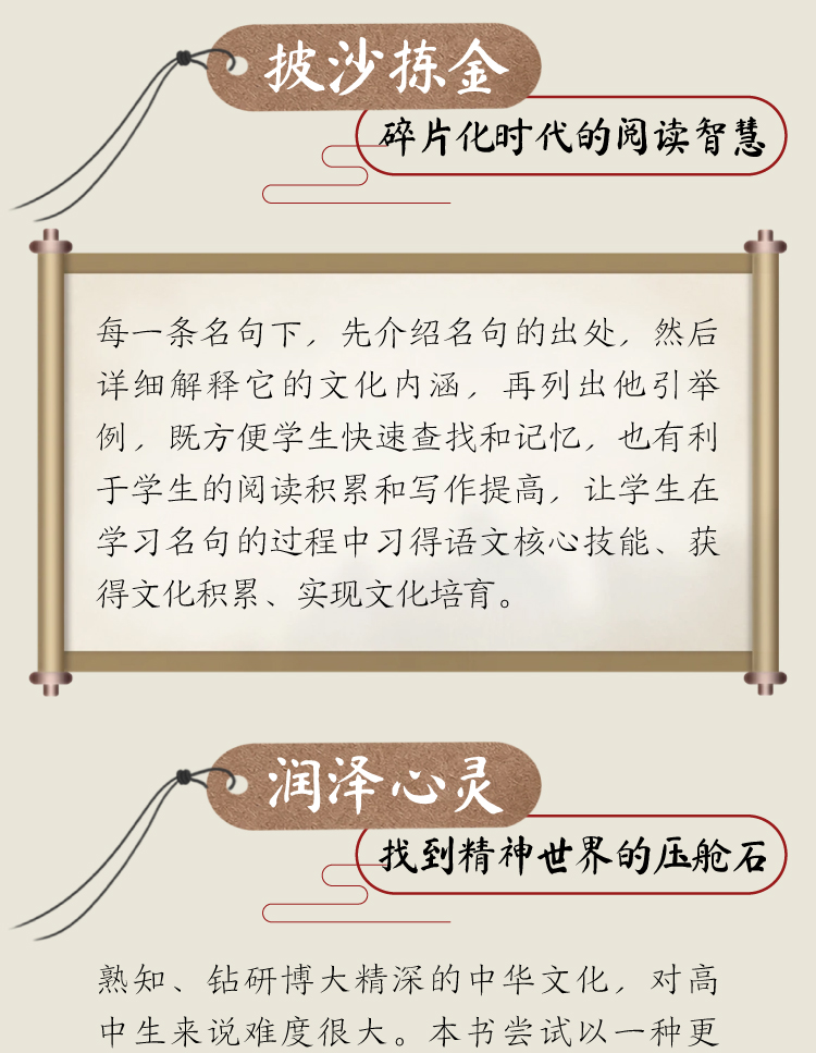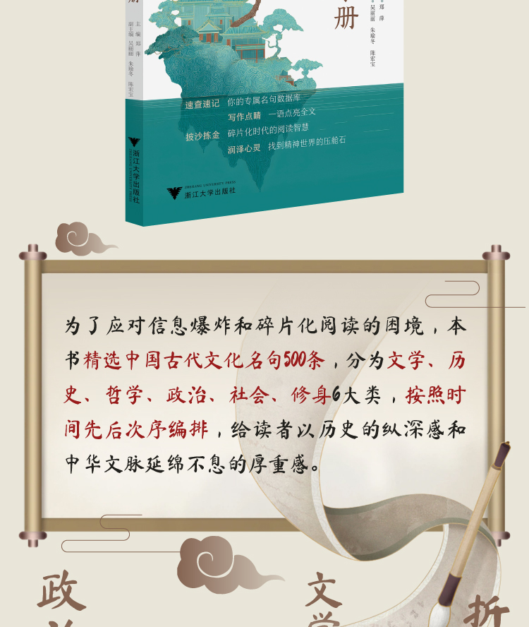 书稿主体内容为500句(段)名句,主要选自我国的古代名家名篇。名句分为文学、历史、哲学、政治、社会、修身共六大类。每一条名句下,先介绍名句的出处,然后解释它的文化内涵,再做他引举例。每类名句按照时间先后次序编排,分为先秦、秦汉、三国两晋南北朝、唐五代、两宋、元明清,给读者以历史的纵深感,和中华文脉延绵不息的厚重感。在学习名句的过程中获得中华文化的积累,在碎片化的名句学习中构造文化的整体理解,获得文化的熏陶。