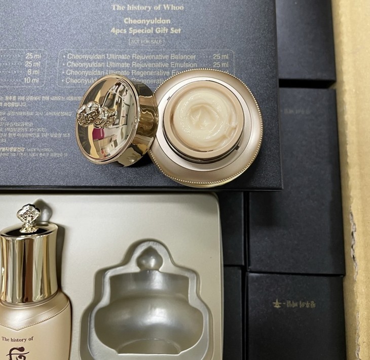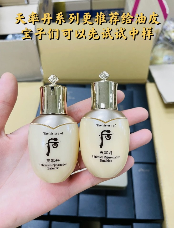 👑WHOO天率丹中样四件套 👍 天率丹在天气丹基础上添加了“还幼精华成分”✨! 💯而且还是Whoo后高端奢华抗衰老系列!专门针对亚洲女性的皮肤特点打造。 🌿除了还幼精华,还有“铁皮石斛”以及9大神仙草之首的皇室药材🌈。 ❤️主打:抗衰老、全面修护、滋润皮肤🙌。 👏更适合28岁以上想要抗初老的女性。 🐛想知道是否符合自己皮肤,不妨入手中样试一试! 【套盒包括】:水25ml+乳25ml+精华8ml+面霜10ml