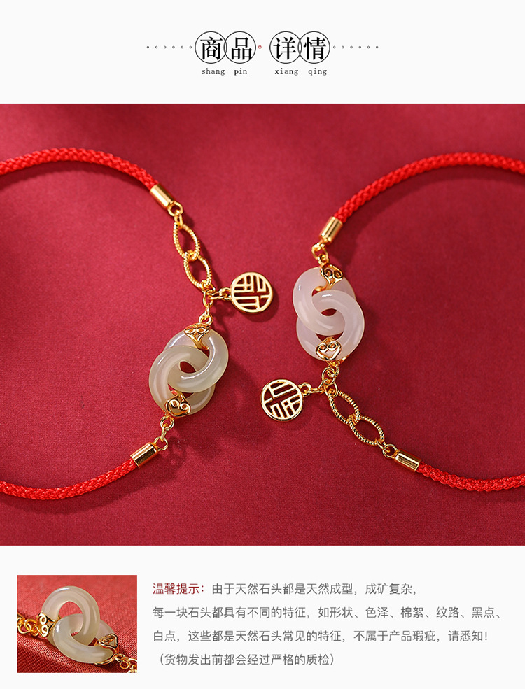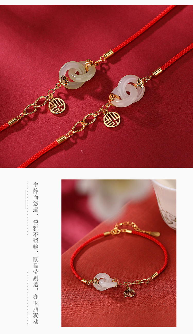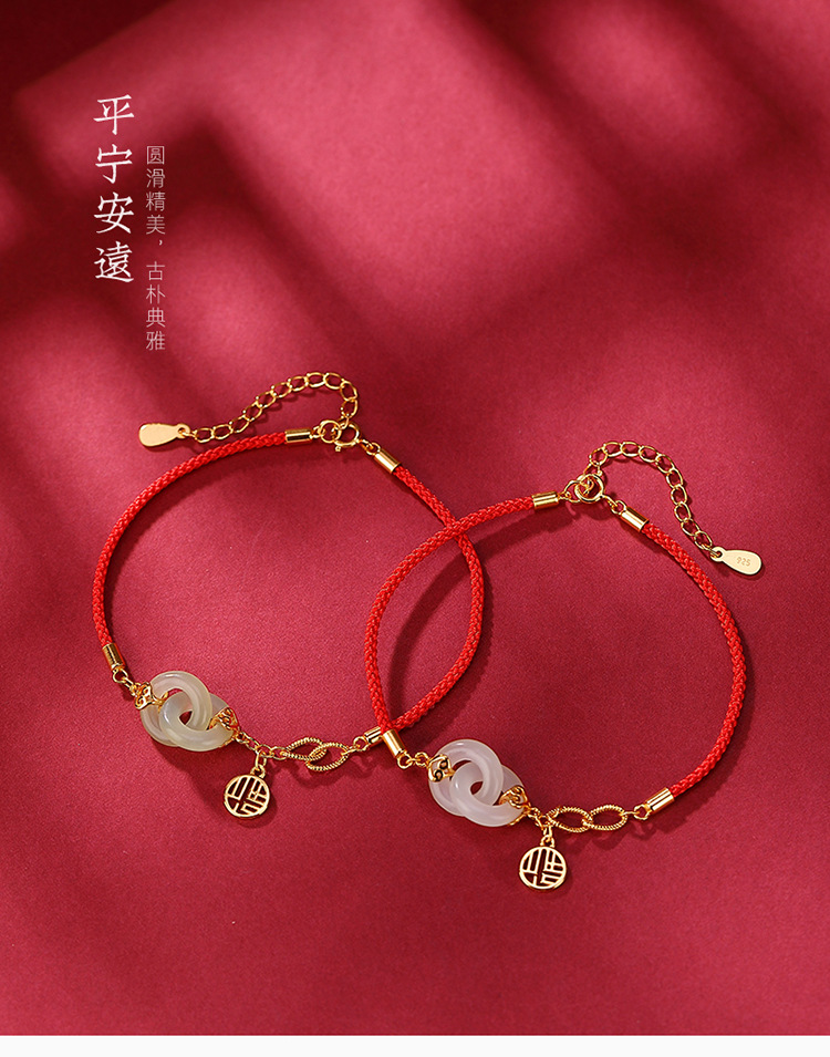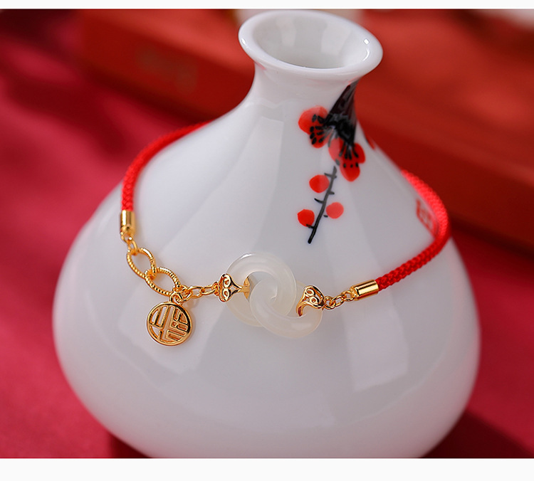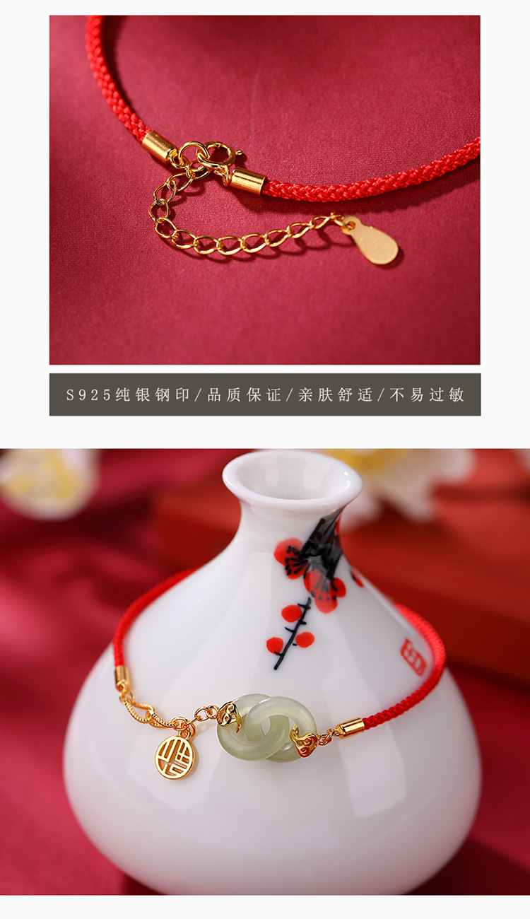 S925纯银镀金和田白玉青玉平安扣红绳福字手链手饰 CW