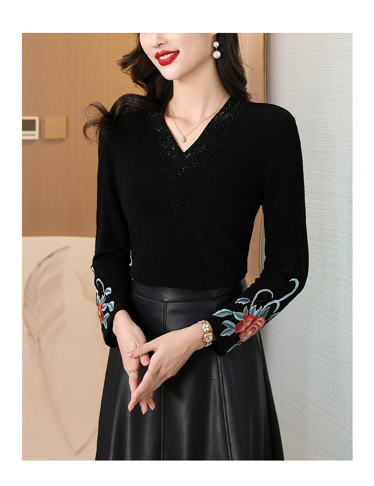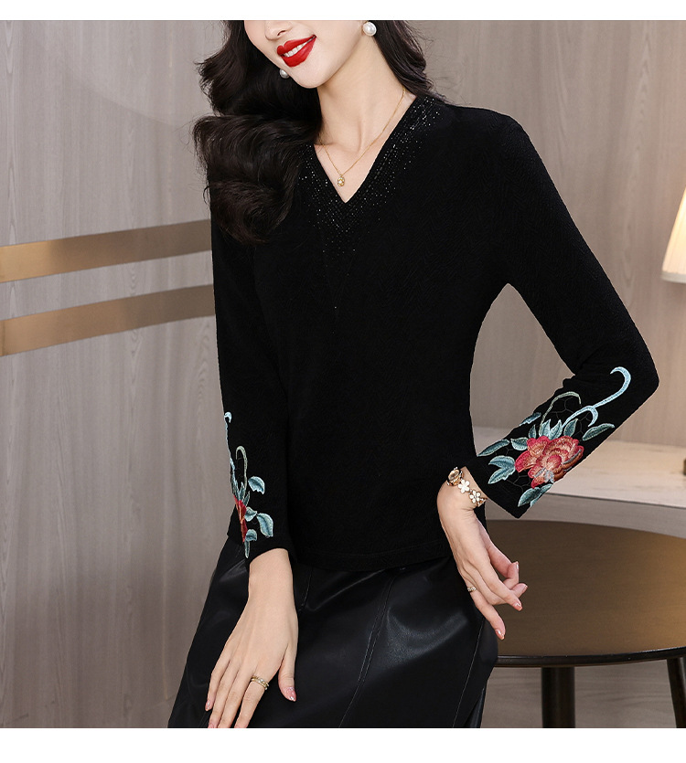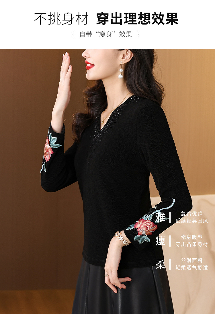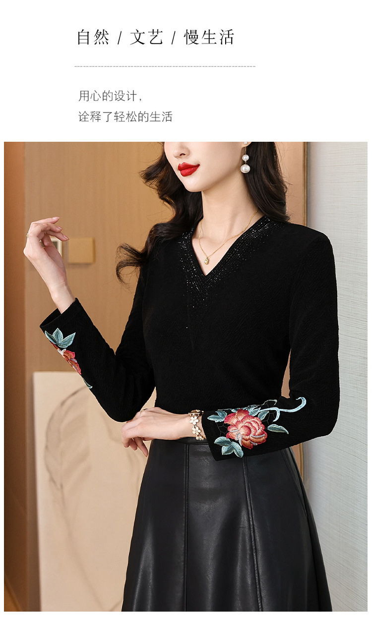 AHM yqwl6956国风V领长袖打底衫复古刺绣印花上衣 商品图3