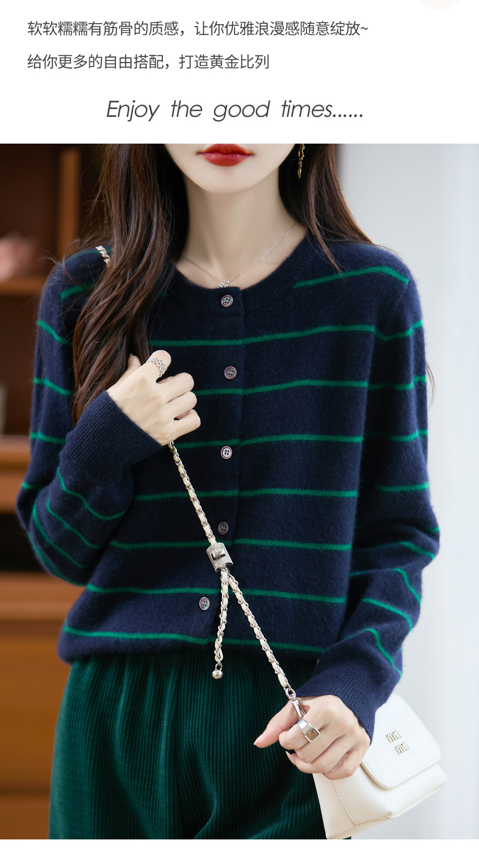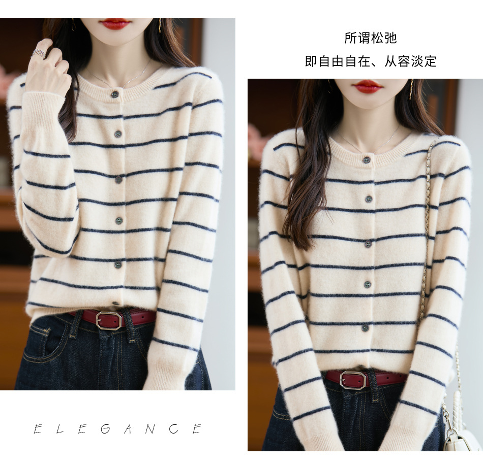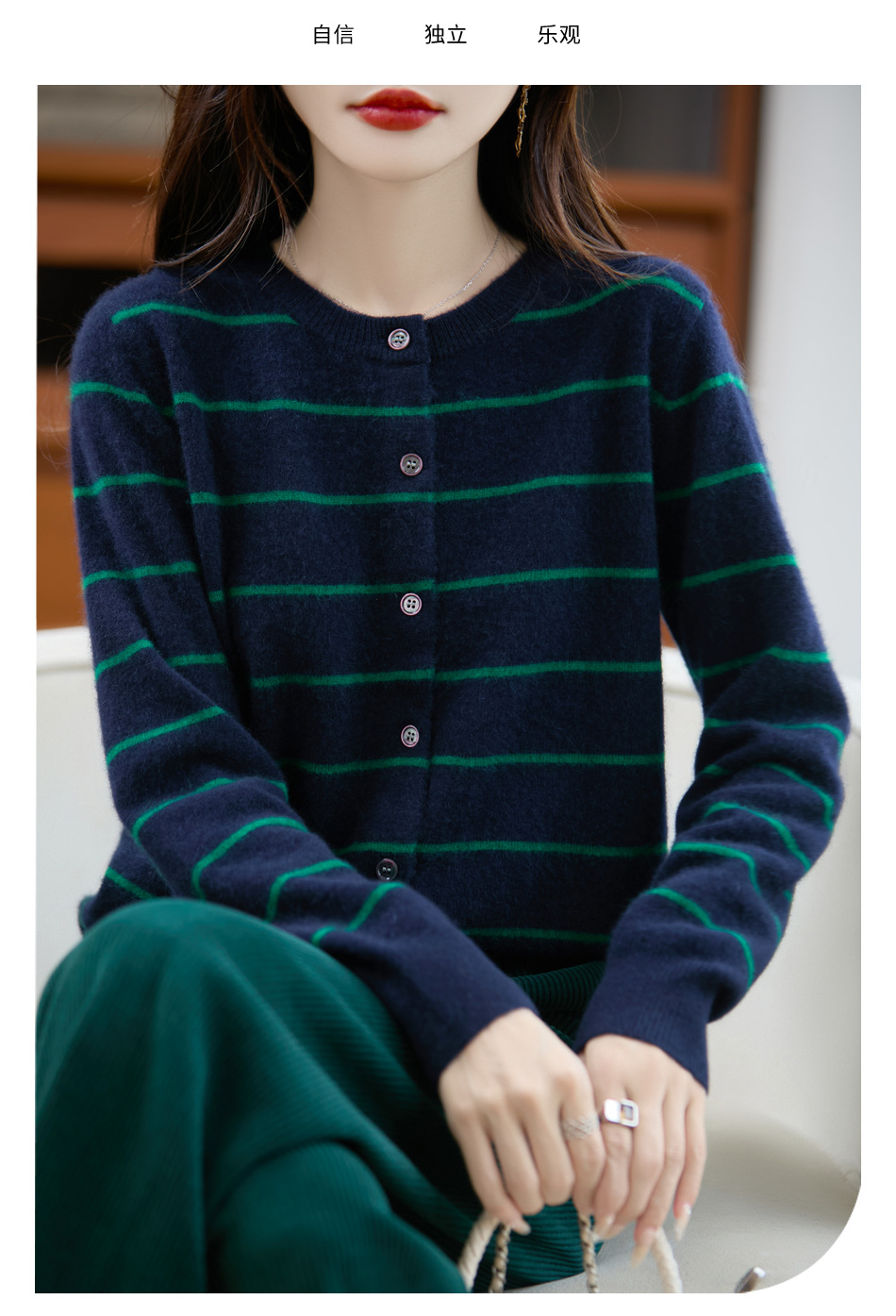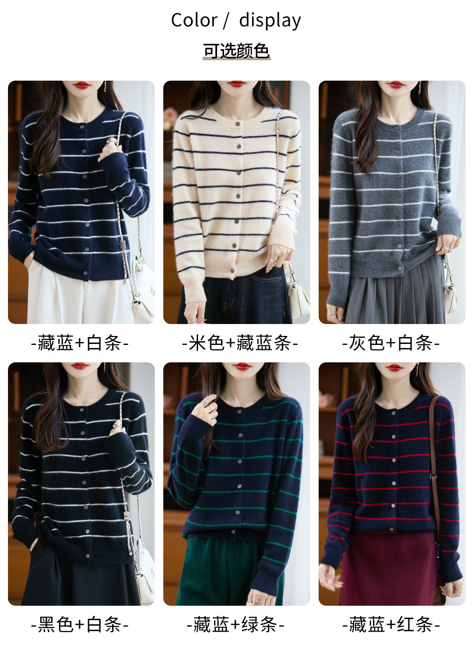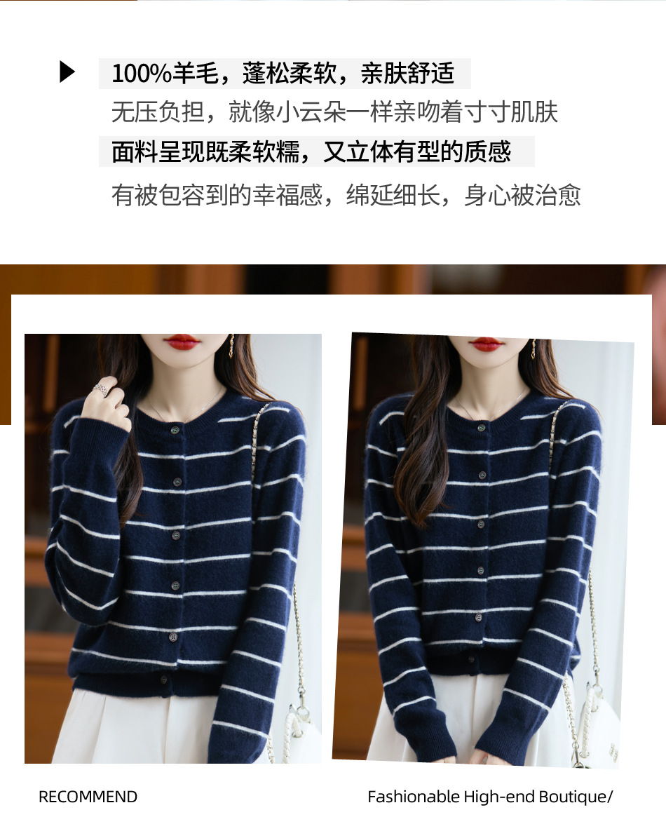 丁摩 100%纯羊毛春季新女式圆领条纹拼色宽松系扣打底针织开衫外套6ZF-299