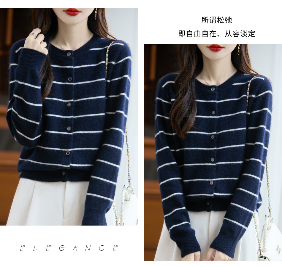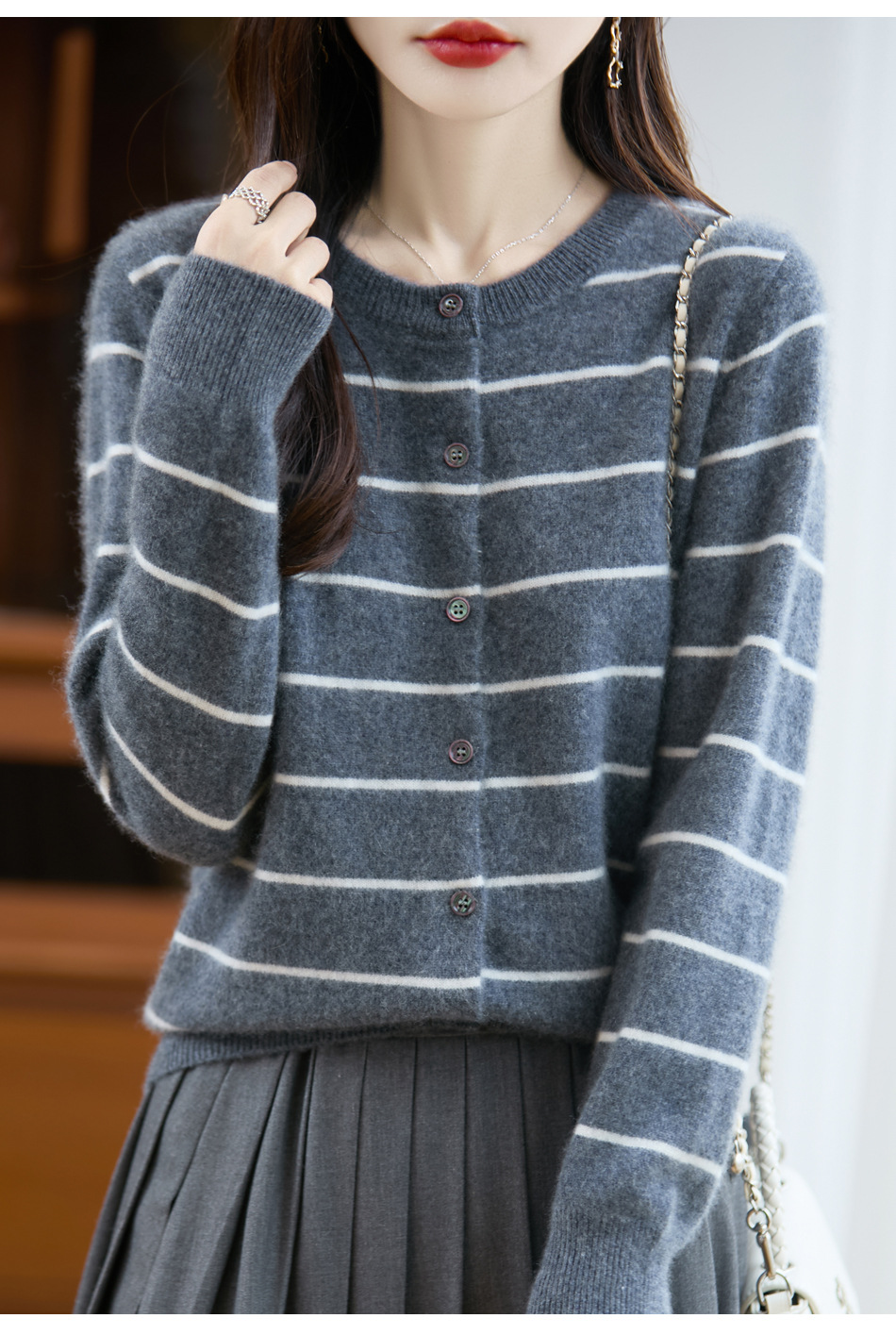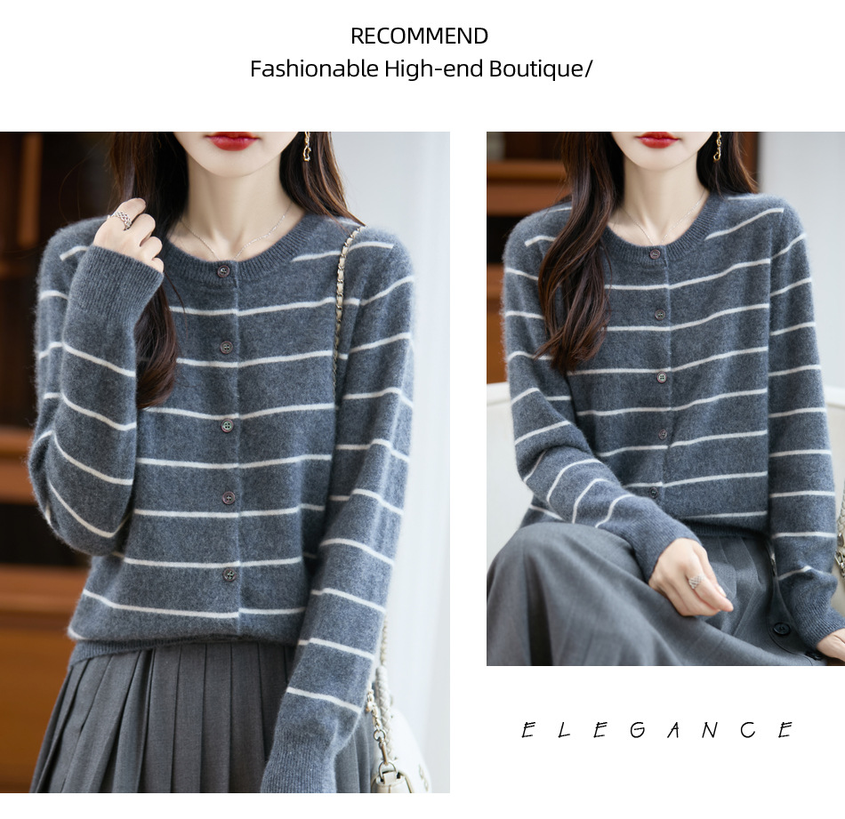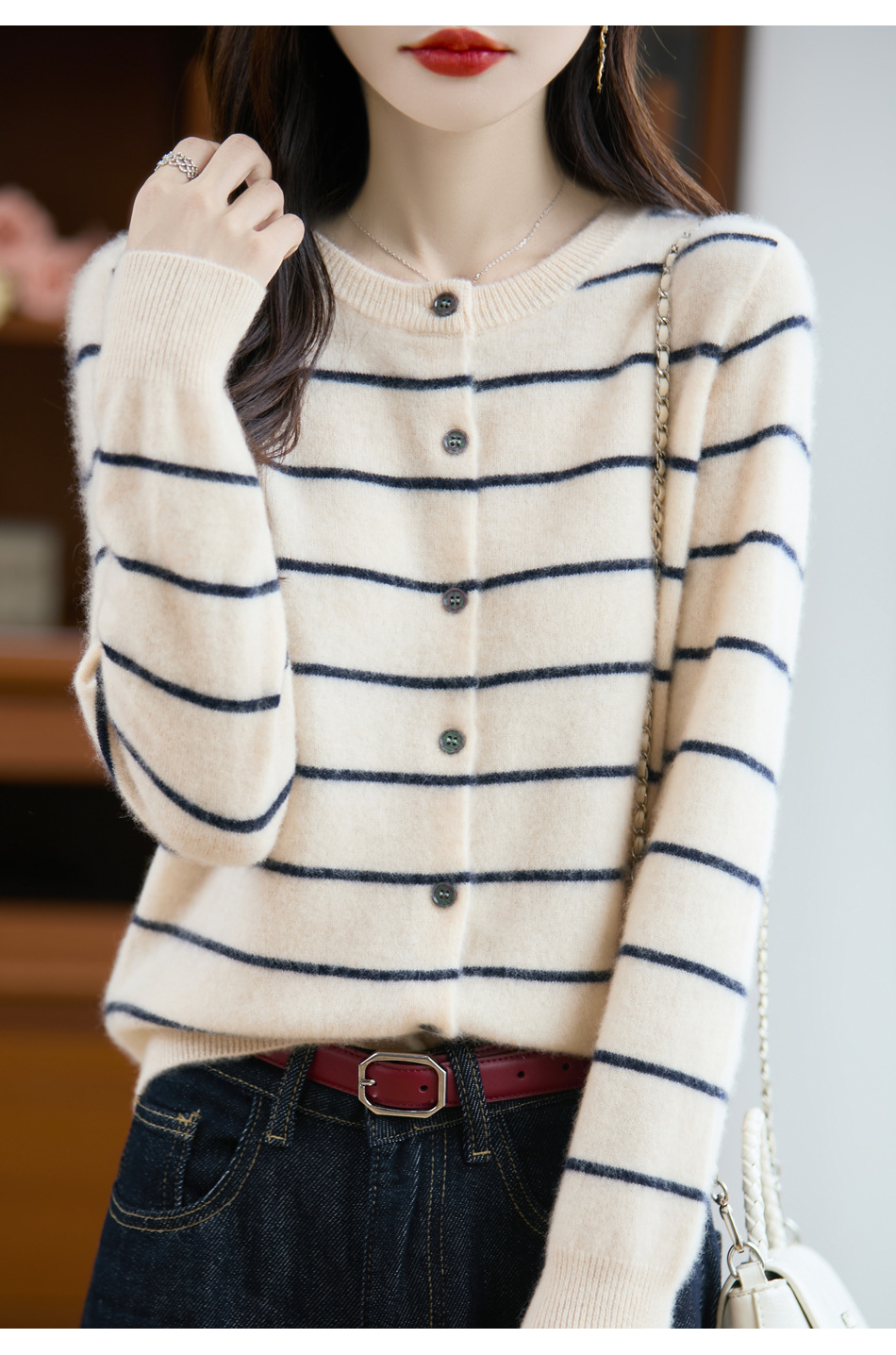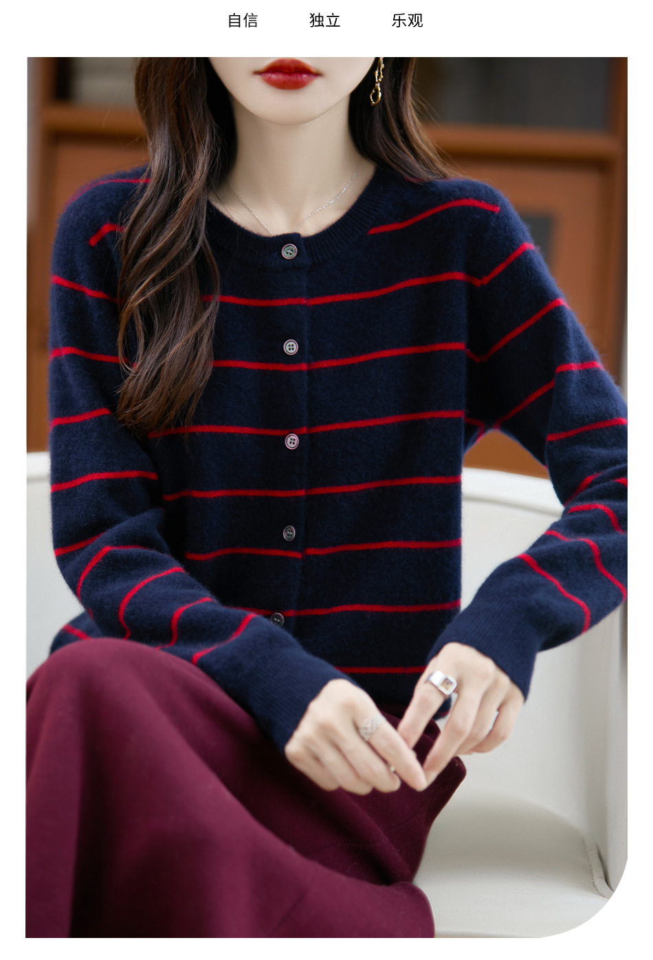 丁摩 100%纯羊毛春季新女式圆领条纹拼色宽松系扣打底针织开衫外套6ZF-299