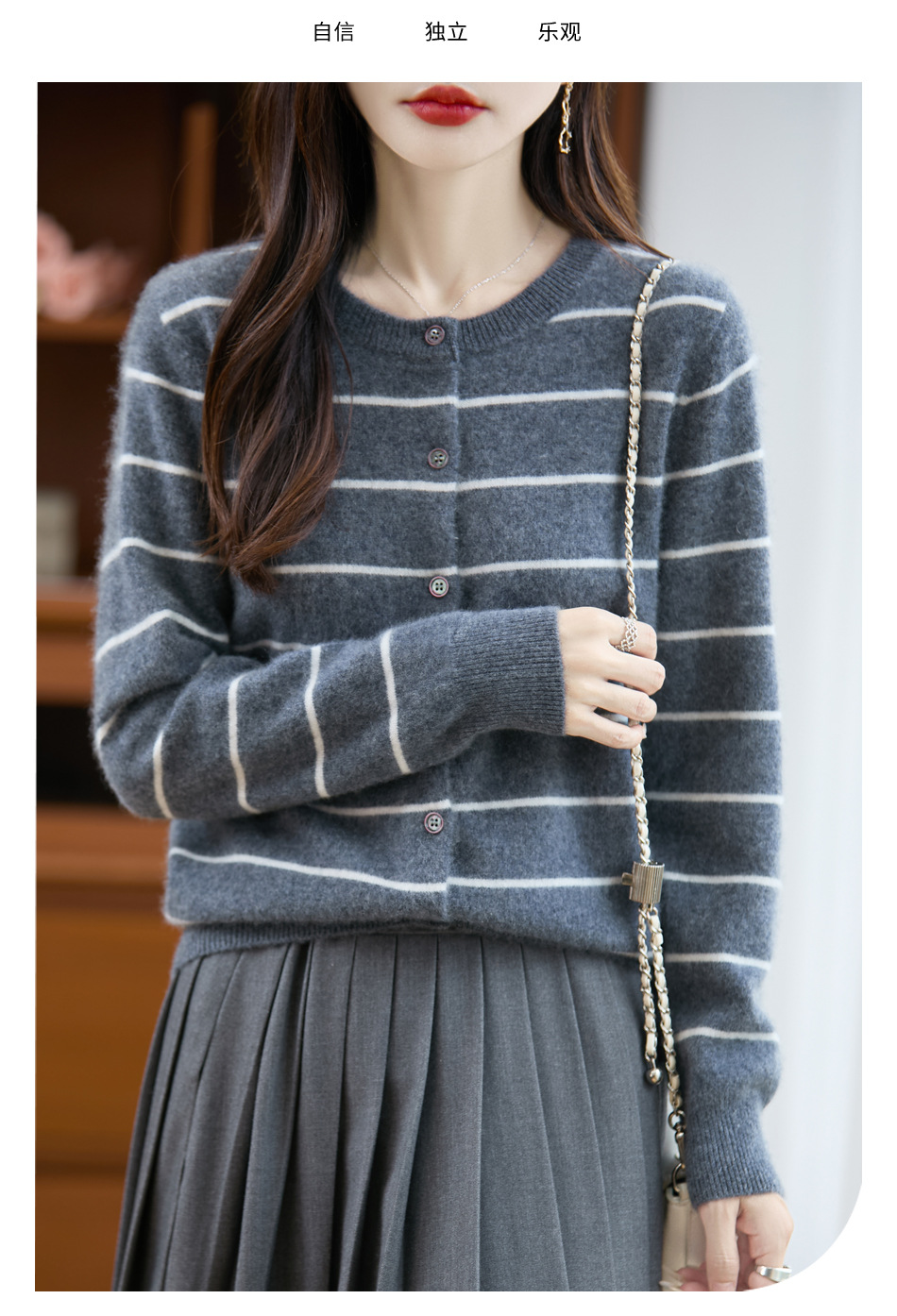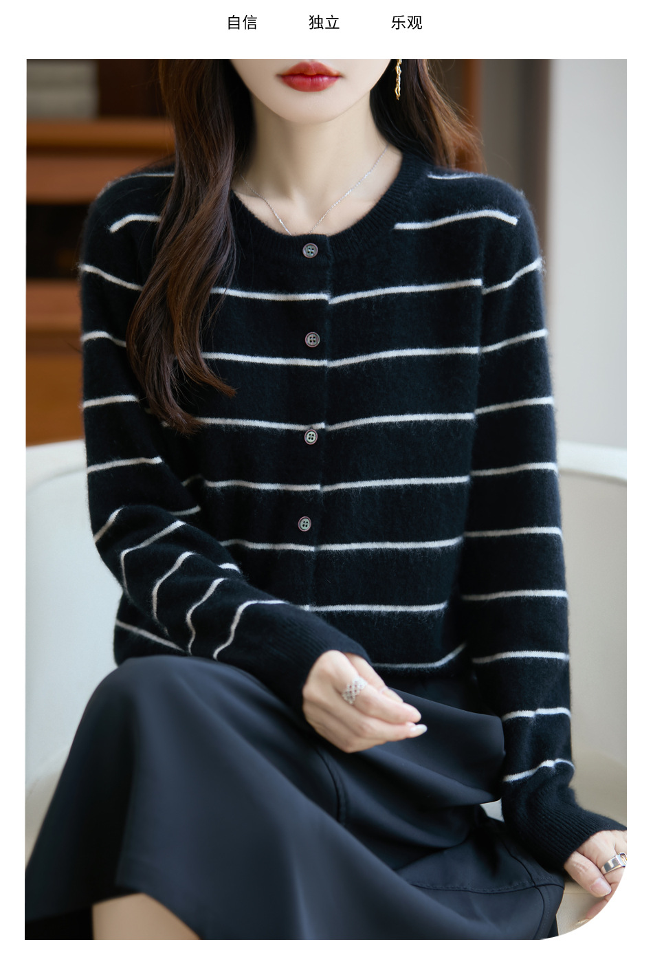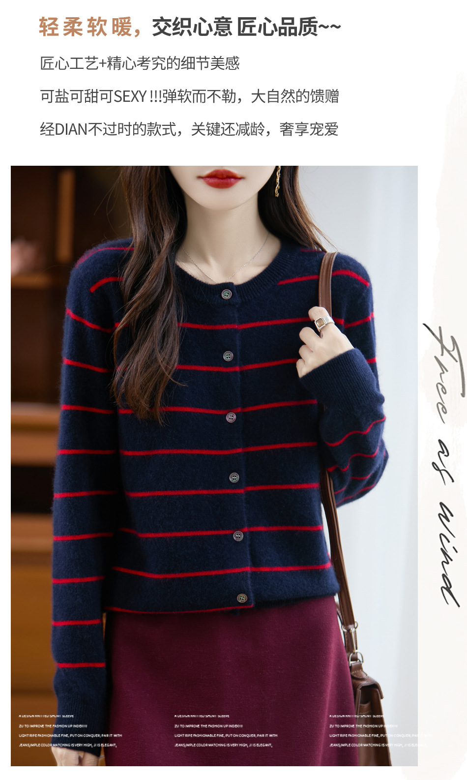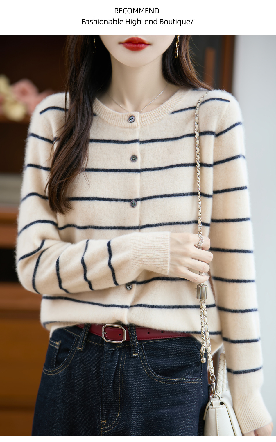 丁摩 100%纯羊毛春季新女式圆领条纹拼色宽松系扣打底针织开衫外套6ZF-299