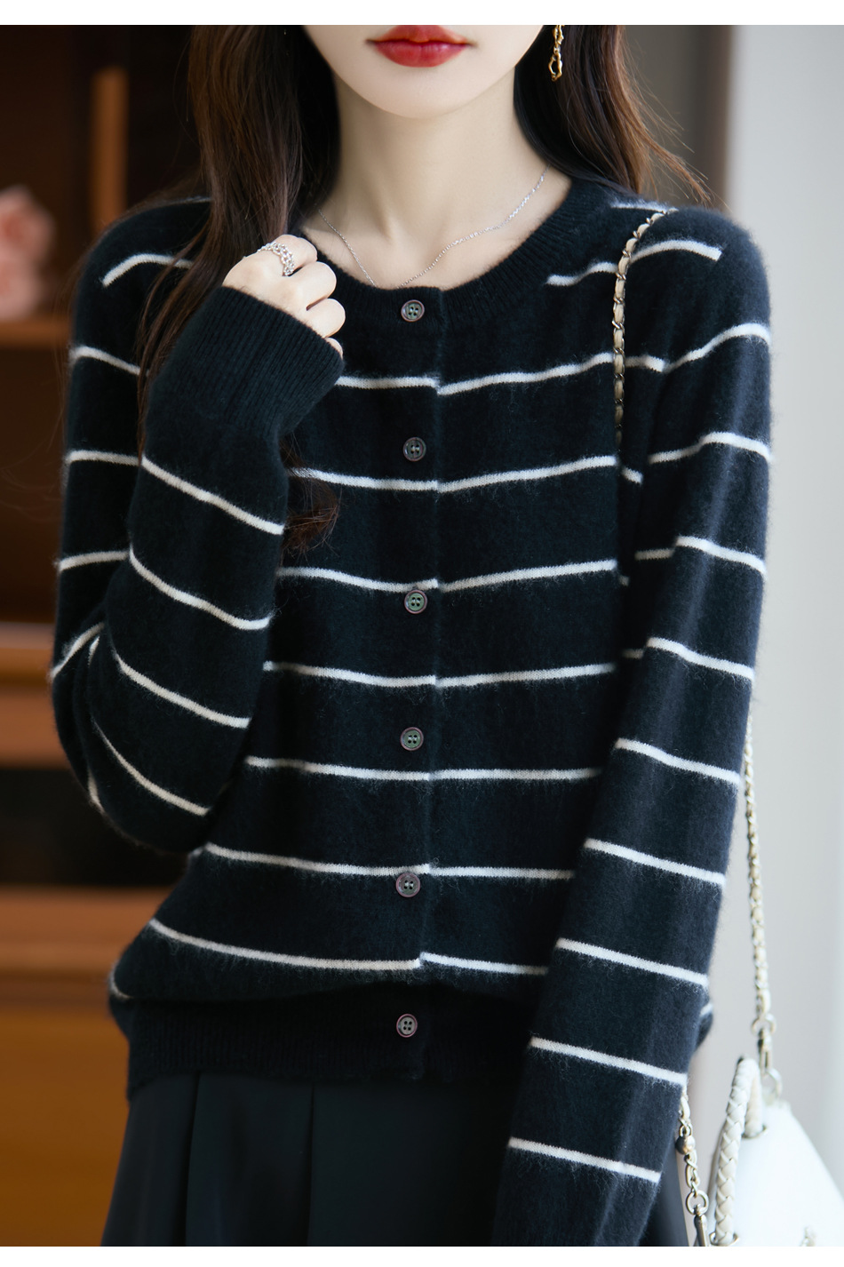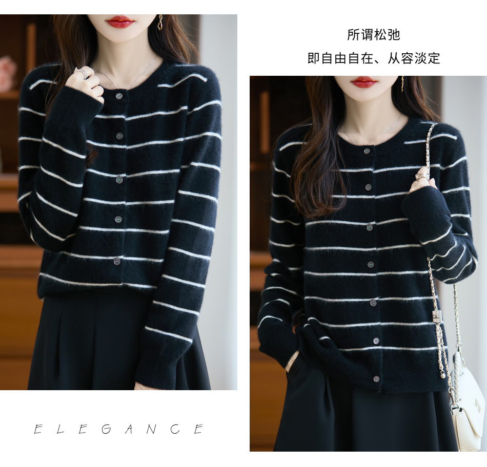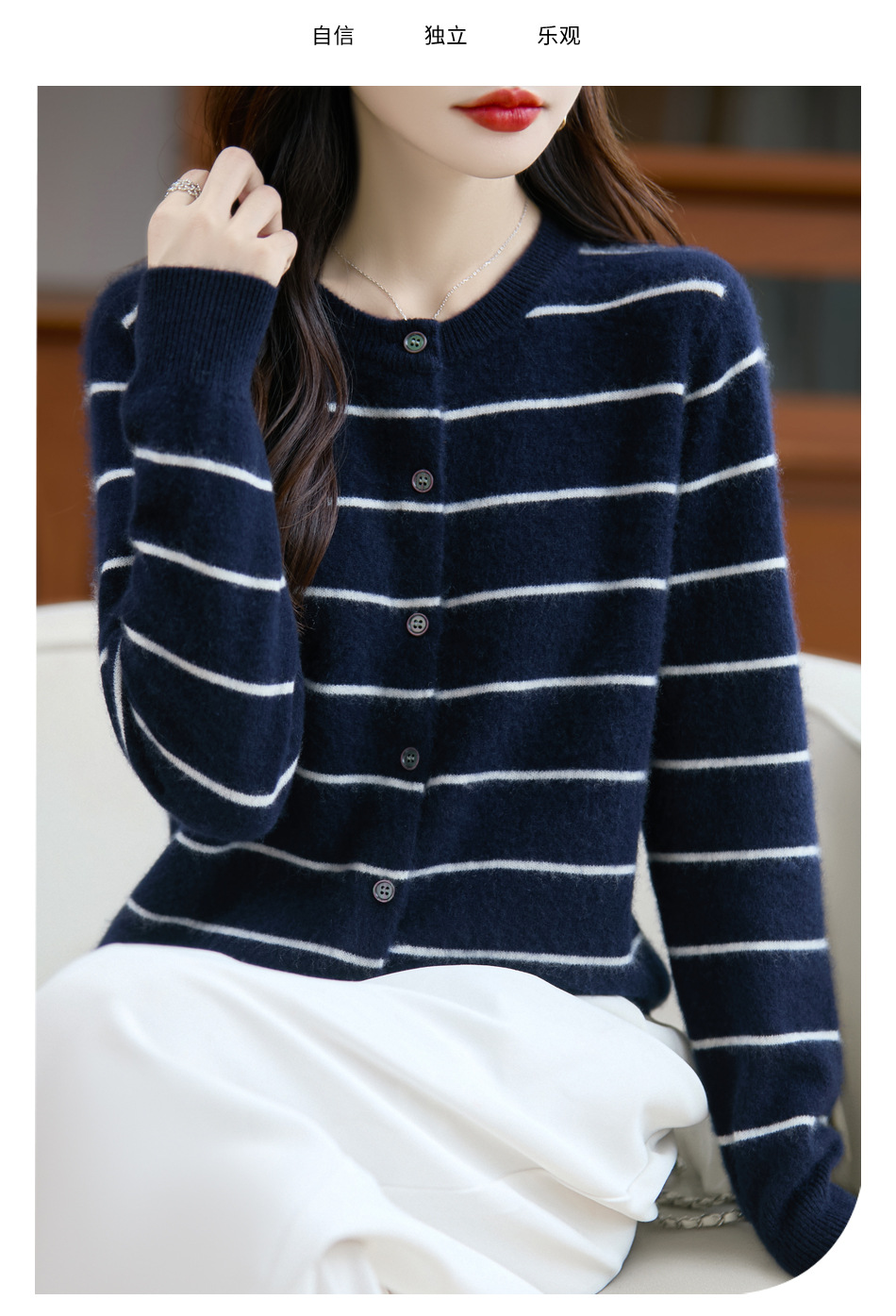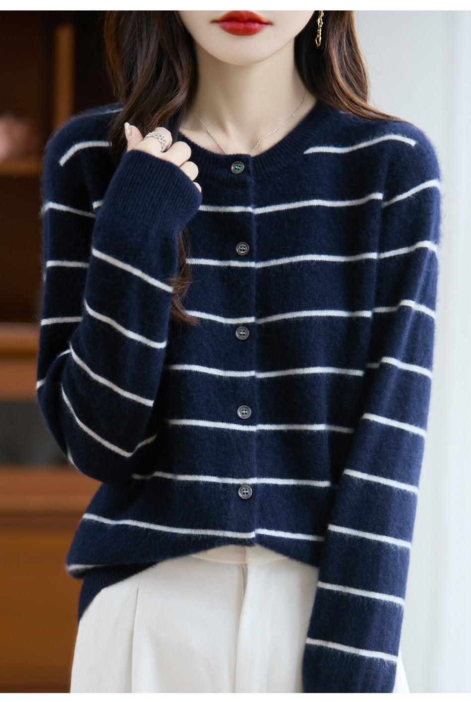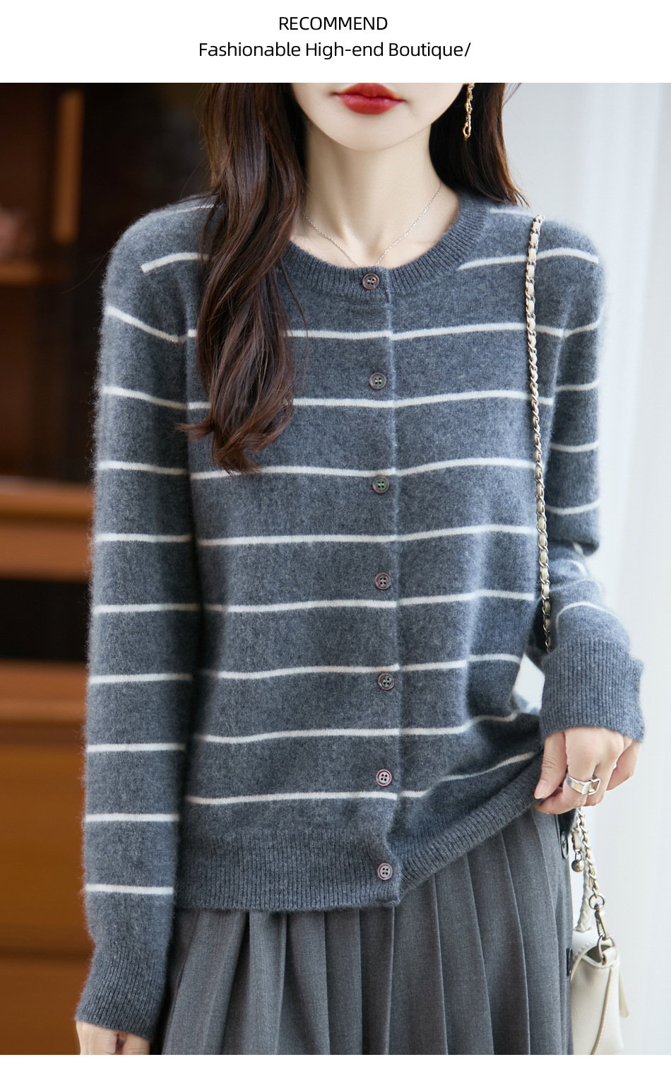丁摩 100%纯羊毛春季新女式圆领条纹拼色宽松系扣打底针织开衫外套6ZF-299