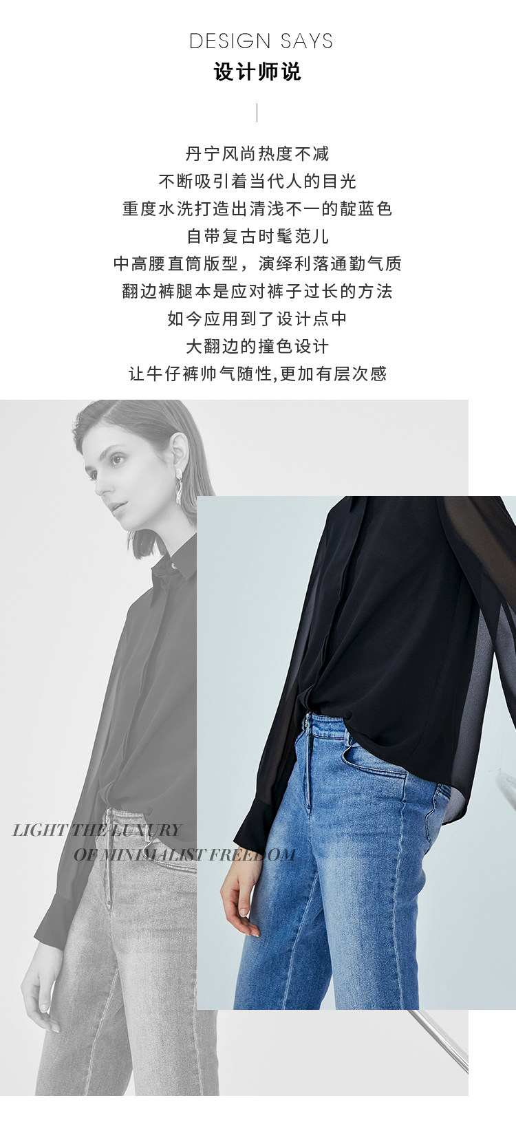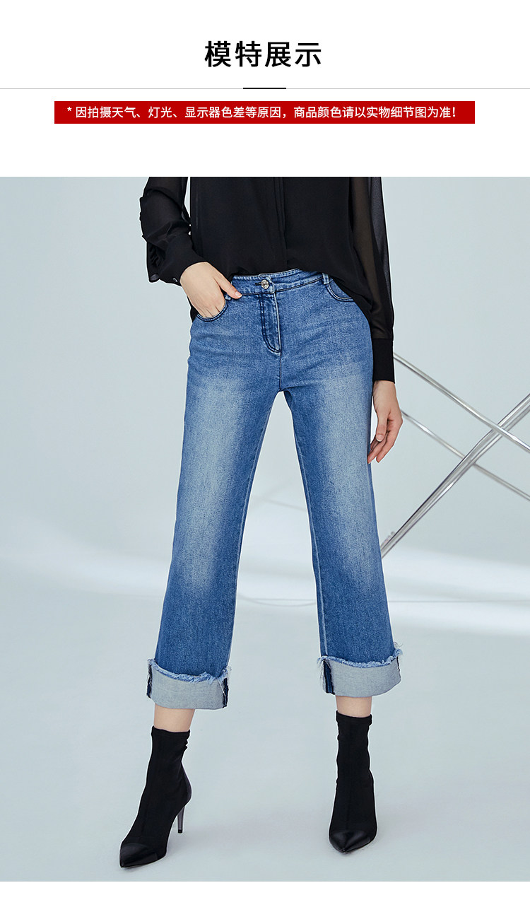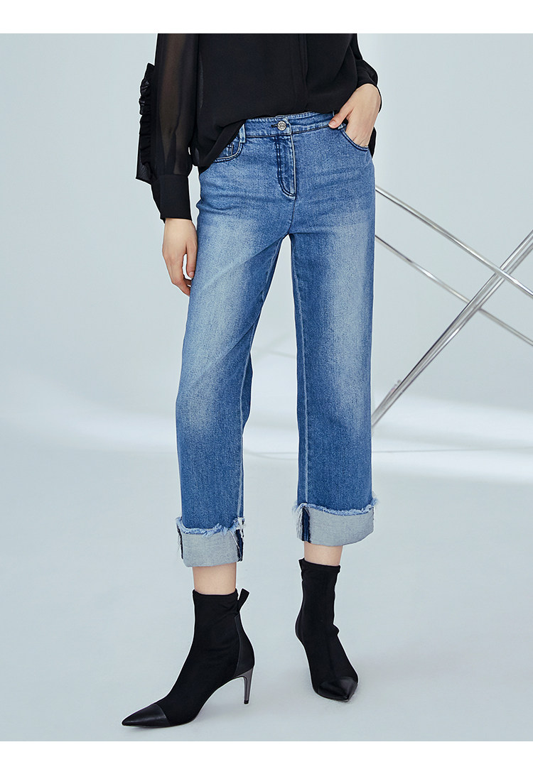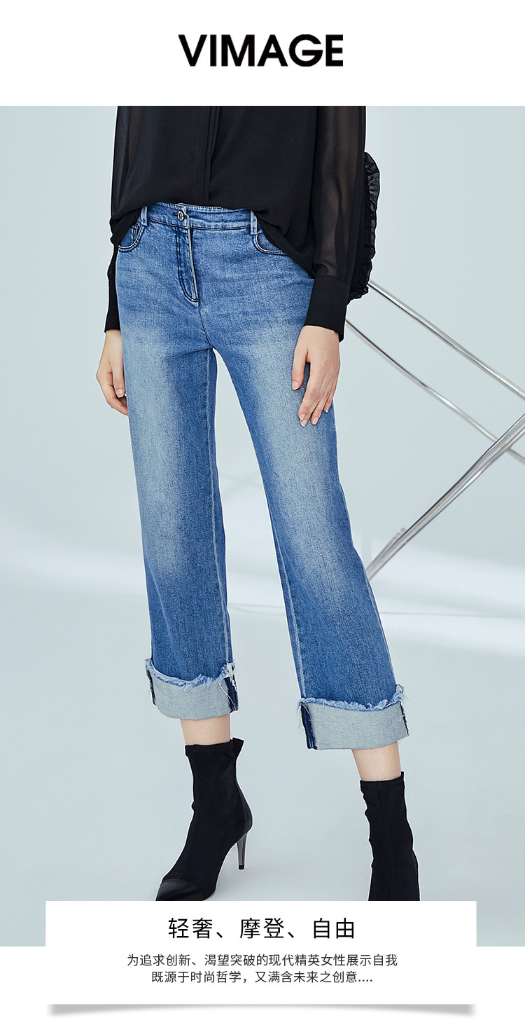 VIMAGE纬漫纪女装秋季新款显瘦直筒卷边日常休闲浅蓝色牛仔裤V1205801