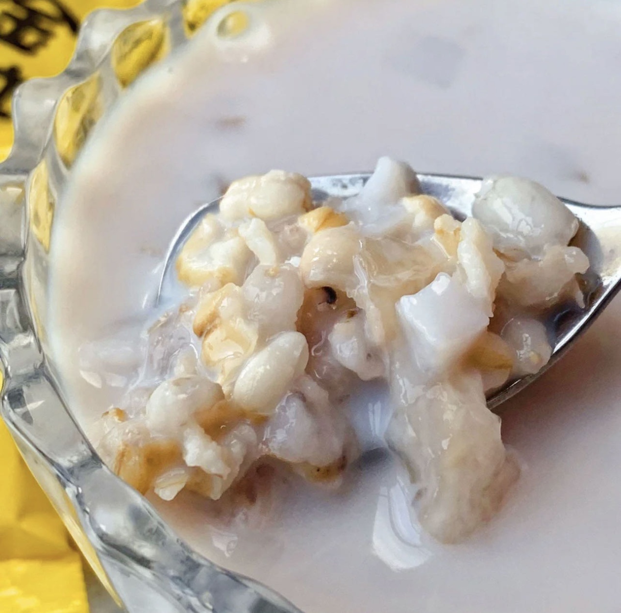 燕麦米,虽被泡过但骨气尚在,椰奶里的燕麦第一次觉得这么有嚼头,泡了那么久,完全不绵口,吃起来软糯有嚼劲!