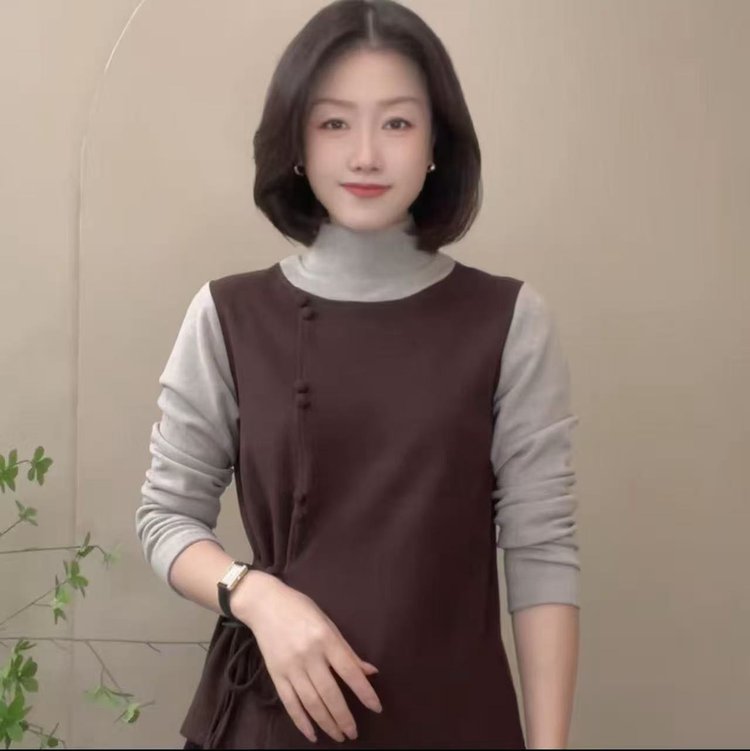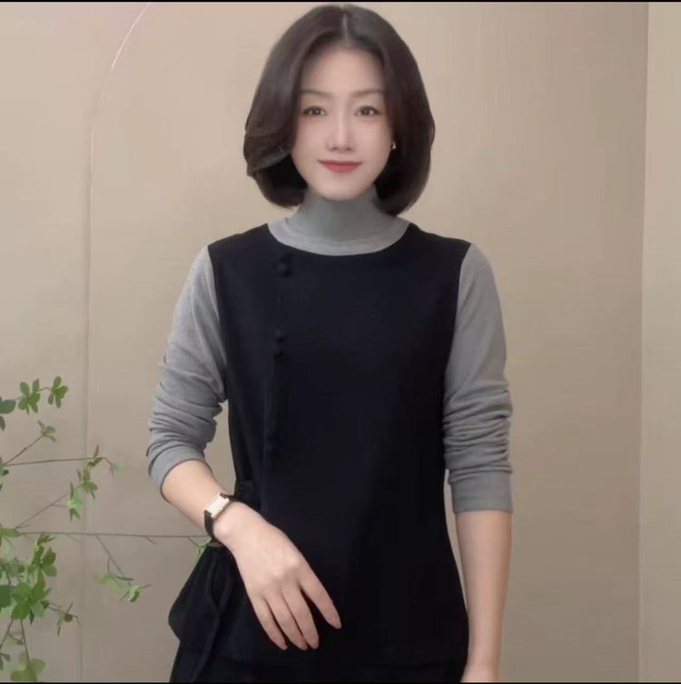A8-1175 半高领假两件拼色T恤衫秋冬款休闲宽松女装减龄设计感打底衫上衣