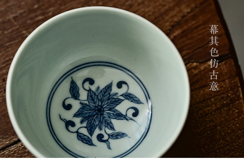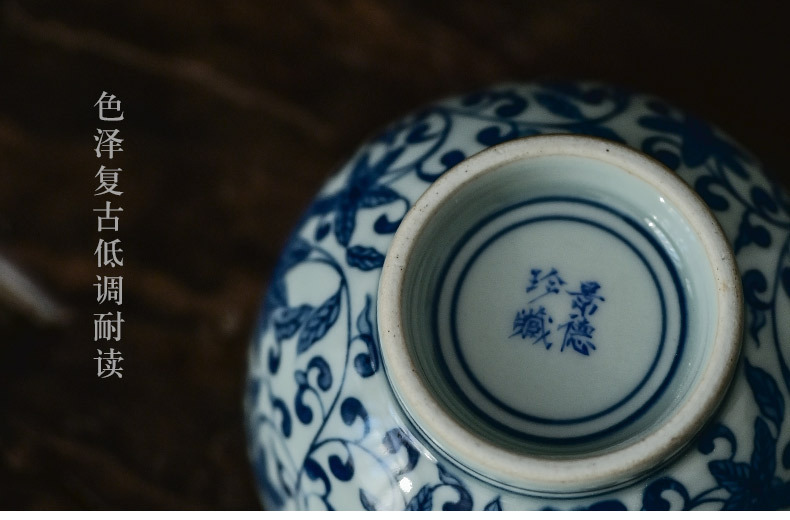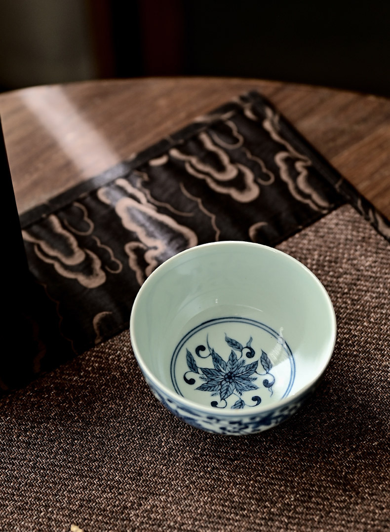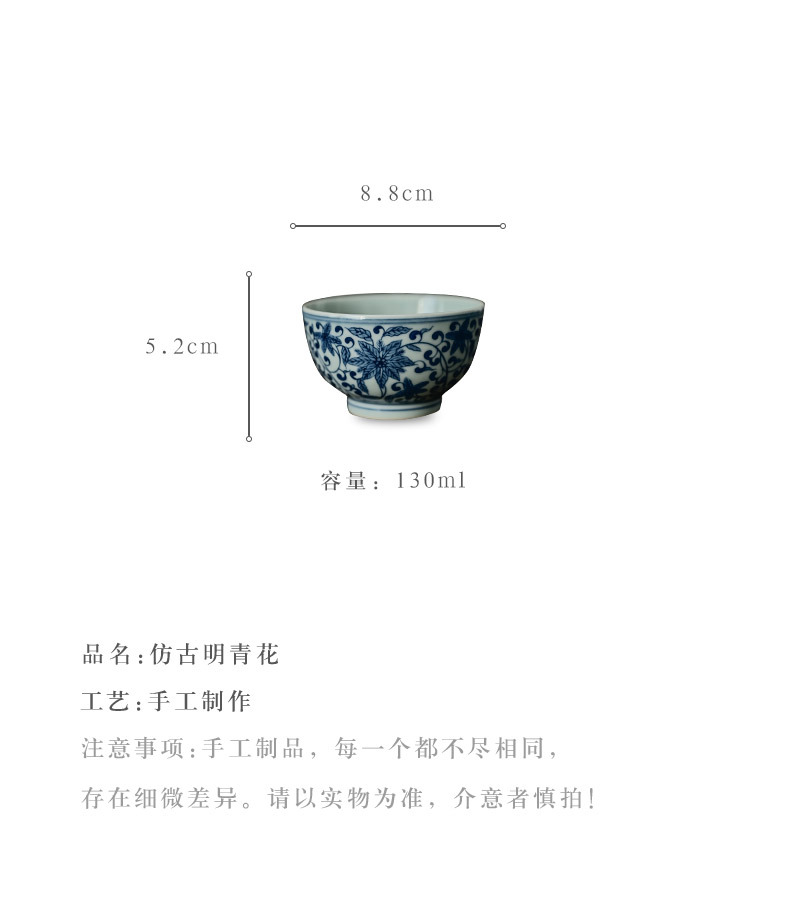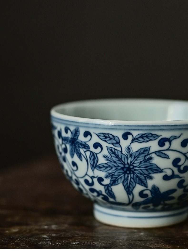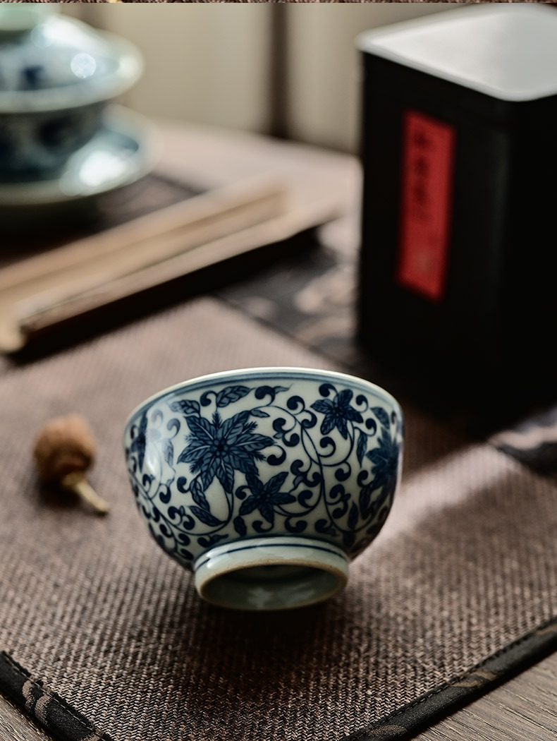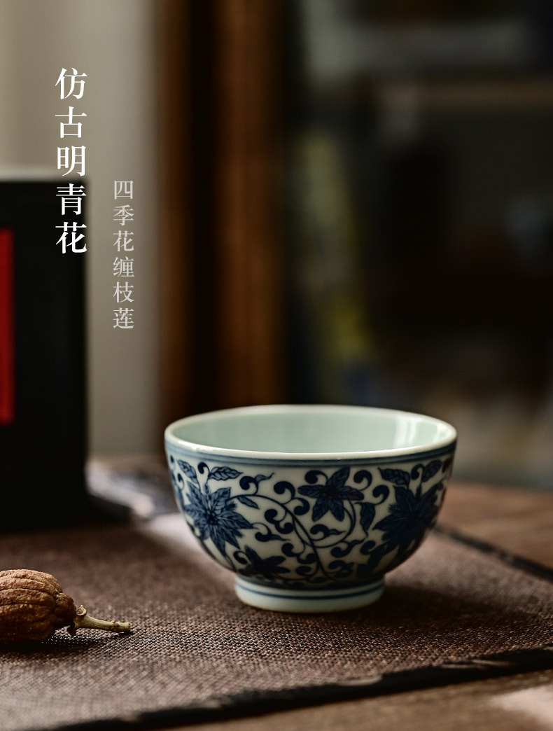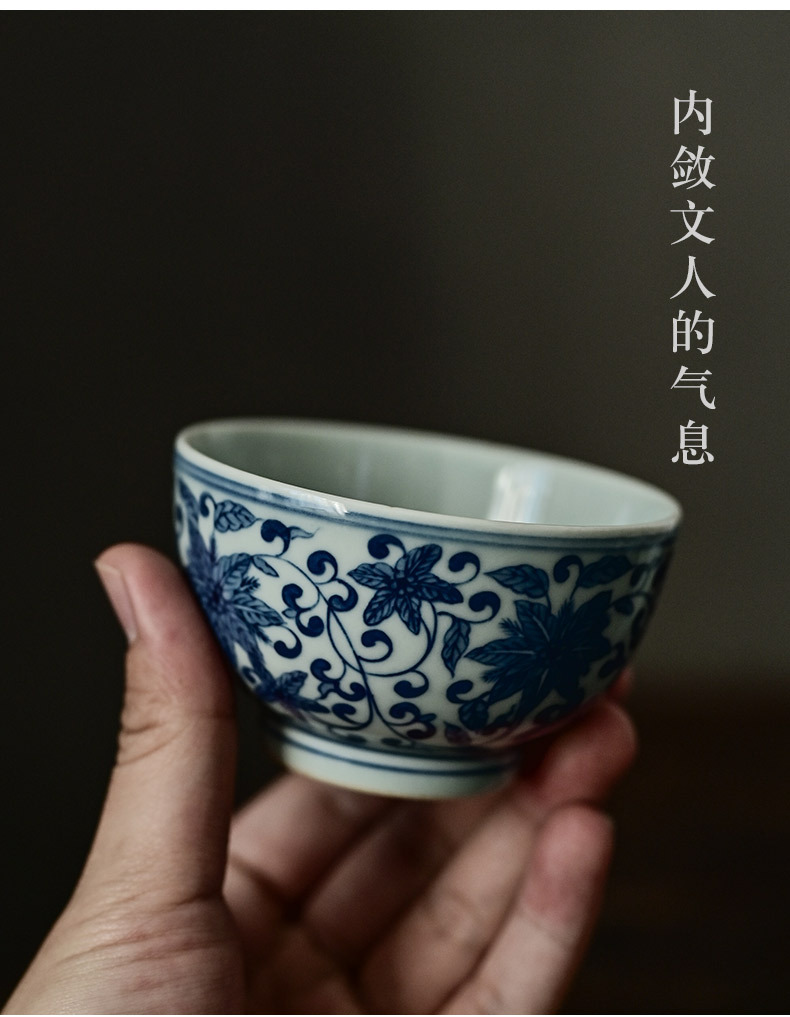 「景德镇手绘复古缠枝四季花仿明青花陶瓷品茗杯」功夫茶杯大号茶盏 主人杯