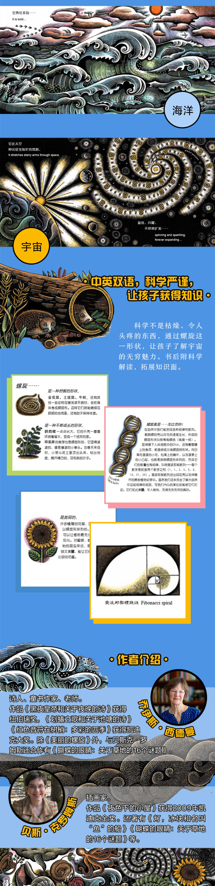 从环衬上的书中所有螺旋的集合,到版权页上排列成螺旋形状的文字,都可以看出这本书的巧妙构思和优雅的结构,作为诗歌、绘本或是科普散文,都***成功。——《号角图书》