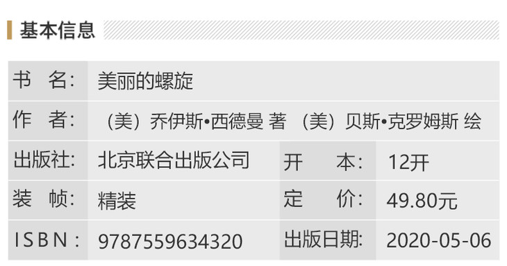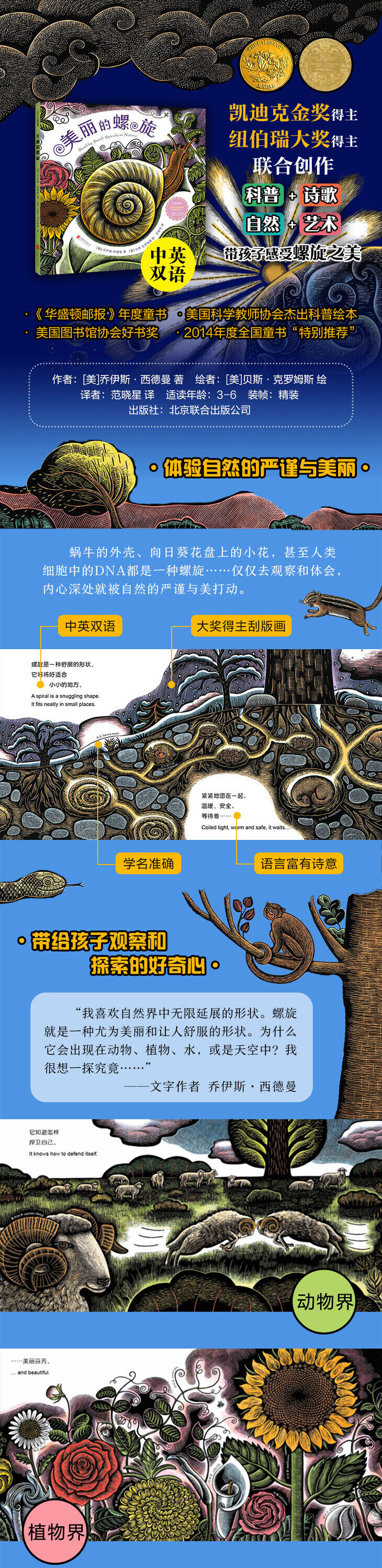 蜗牛的壳,园蛛结的网,向日葵的花盘,潮汐产生的漩涡,甚至是人的耳蜗……仔细观察就会发现,自然界中有许许多多的东西都是呈螺旋形存在的。螺旋这种形状为什么如此常见?它有什么***?作者用精炼优美的诗文,极富韵味的刮版画,将螺旋世界的美丽与奇妙展现在我们眼前,带我们感受蕴涵于大自然中的无限美感与力量。