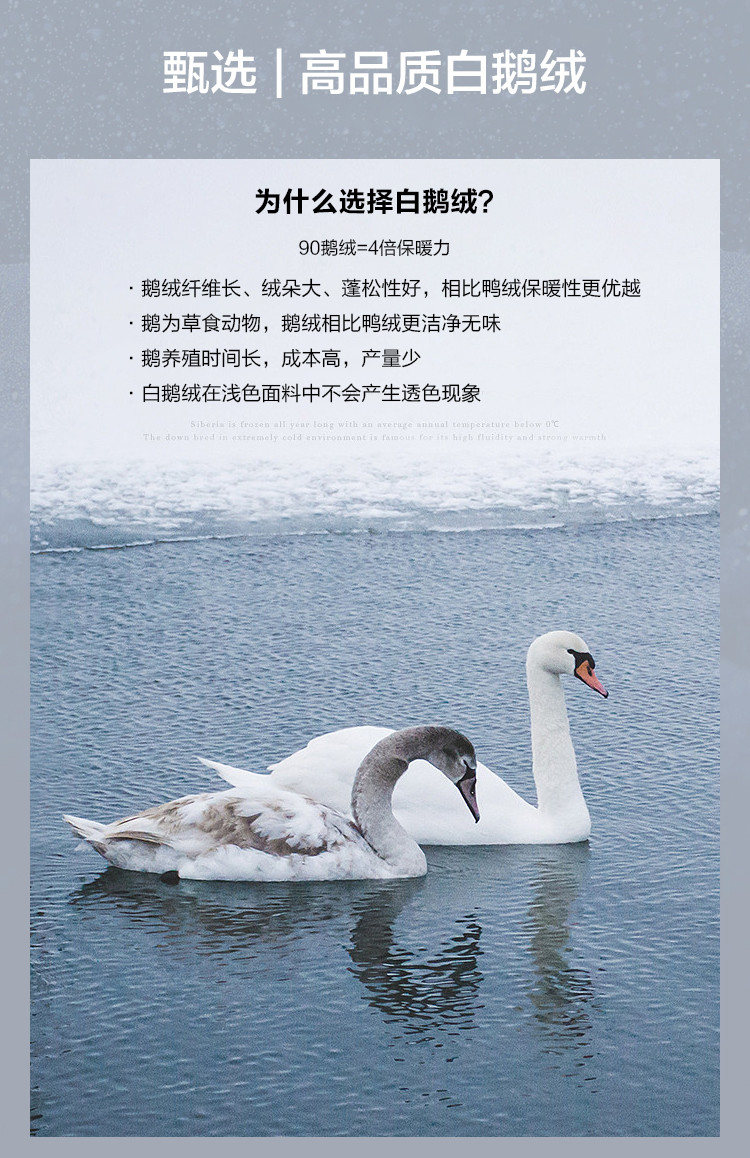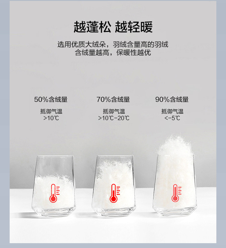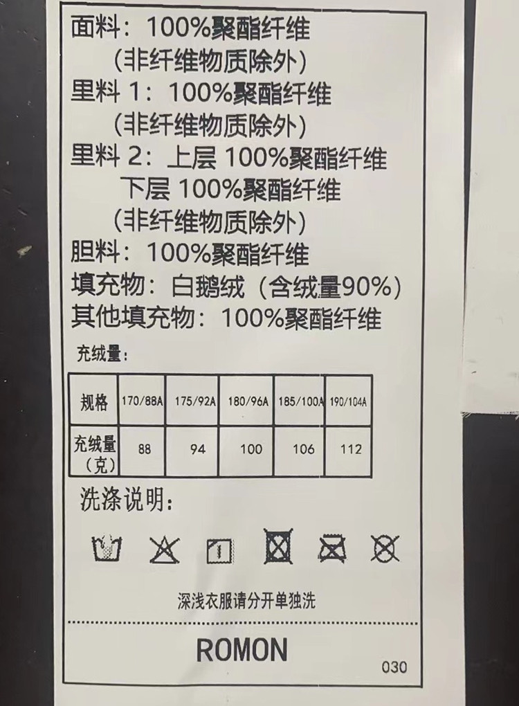 胆料:100%聚酯纤维 填充物:白鹅绒(含绒量90%)其他填充物:100%聚酯纤维