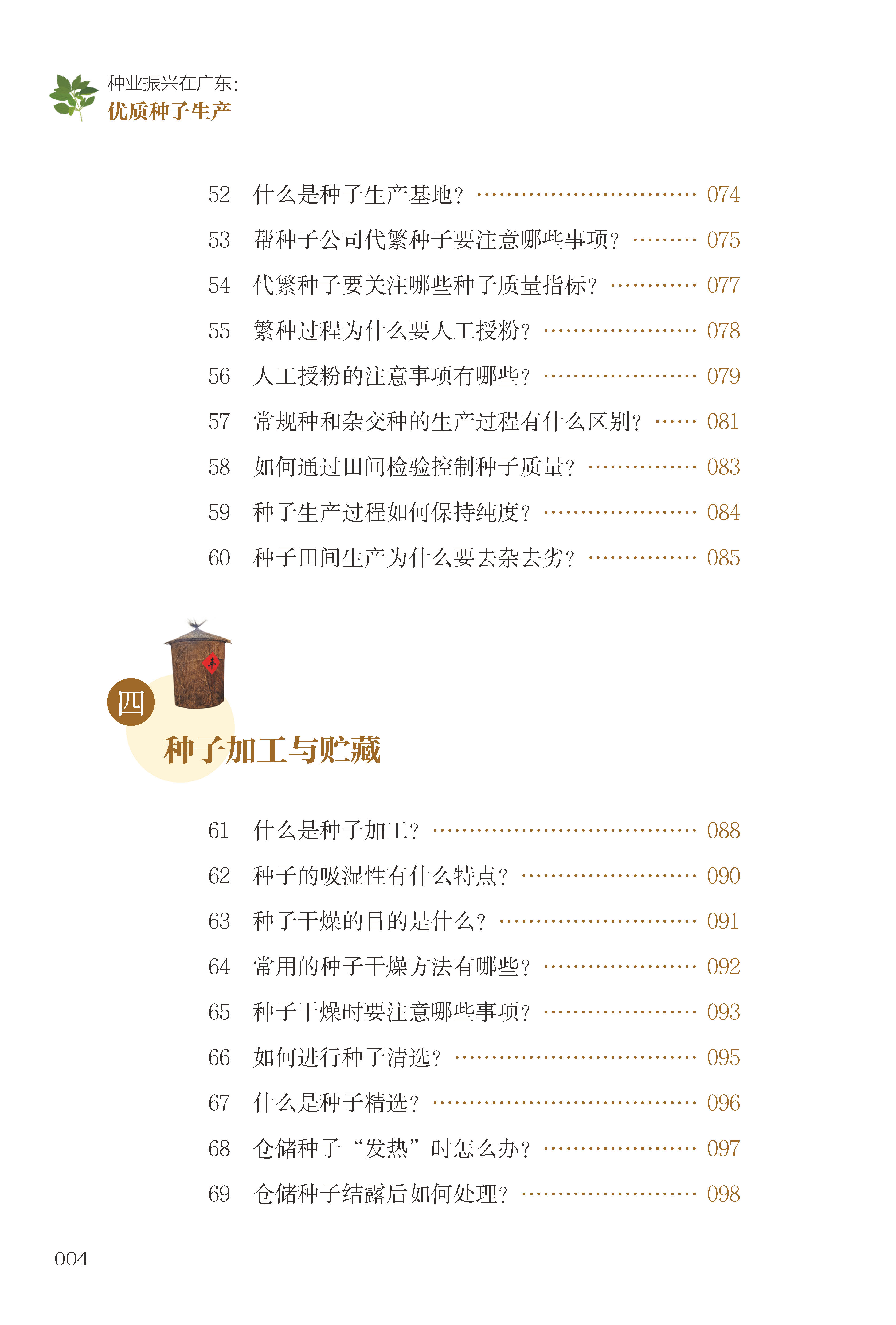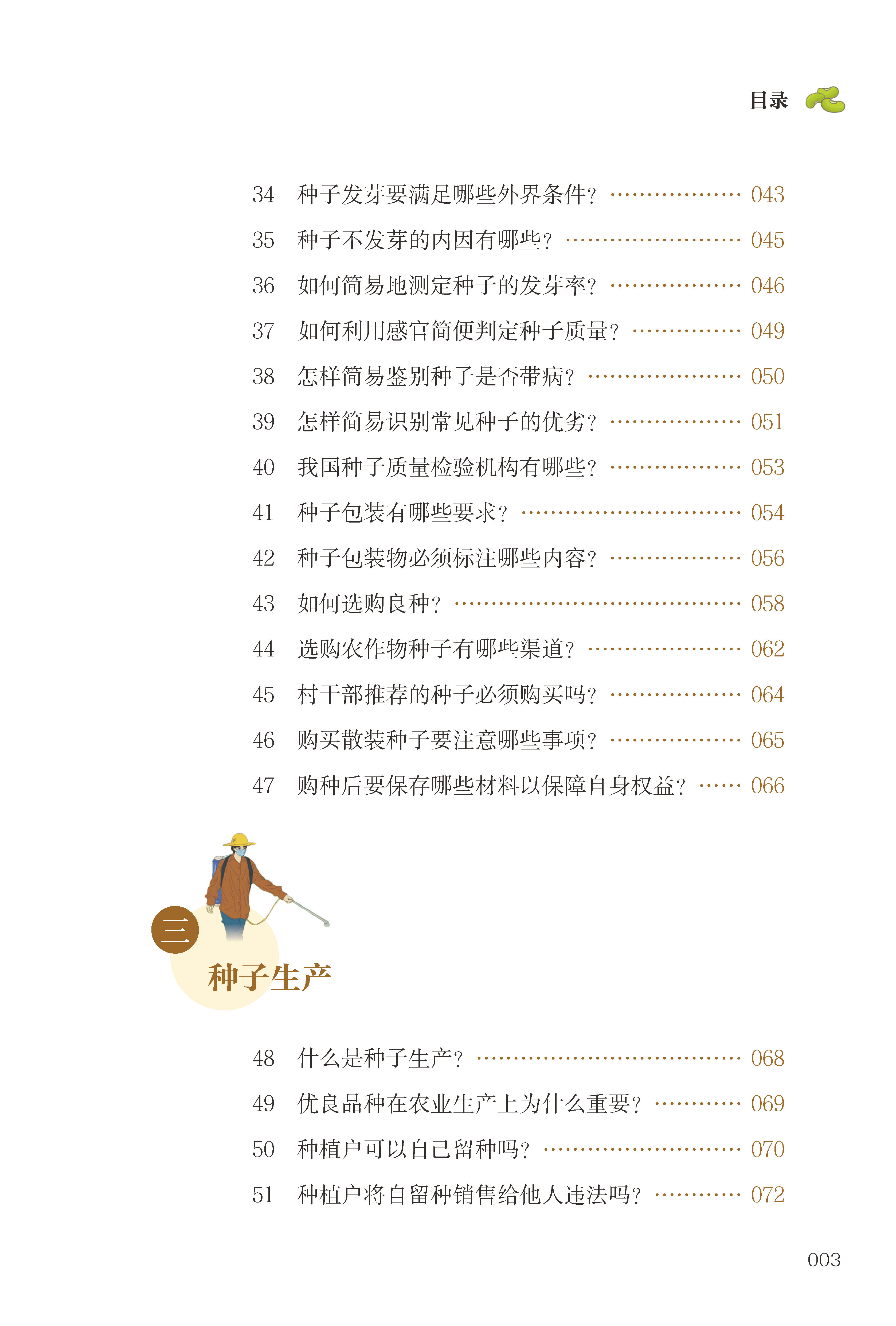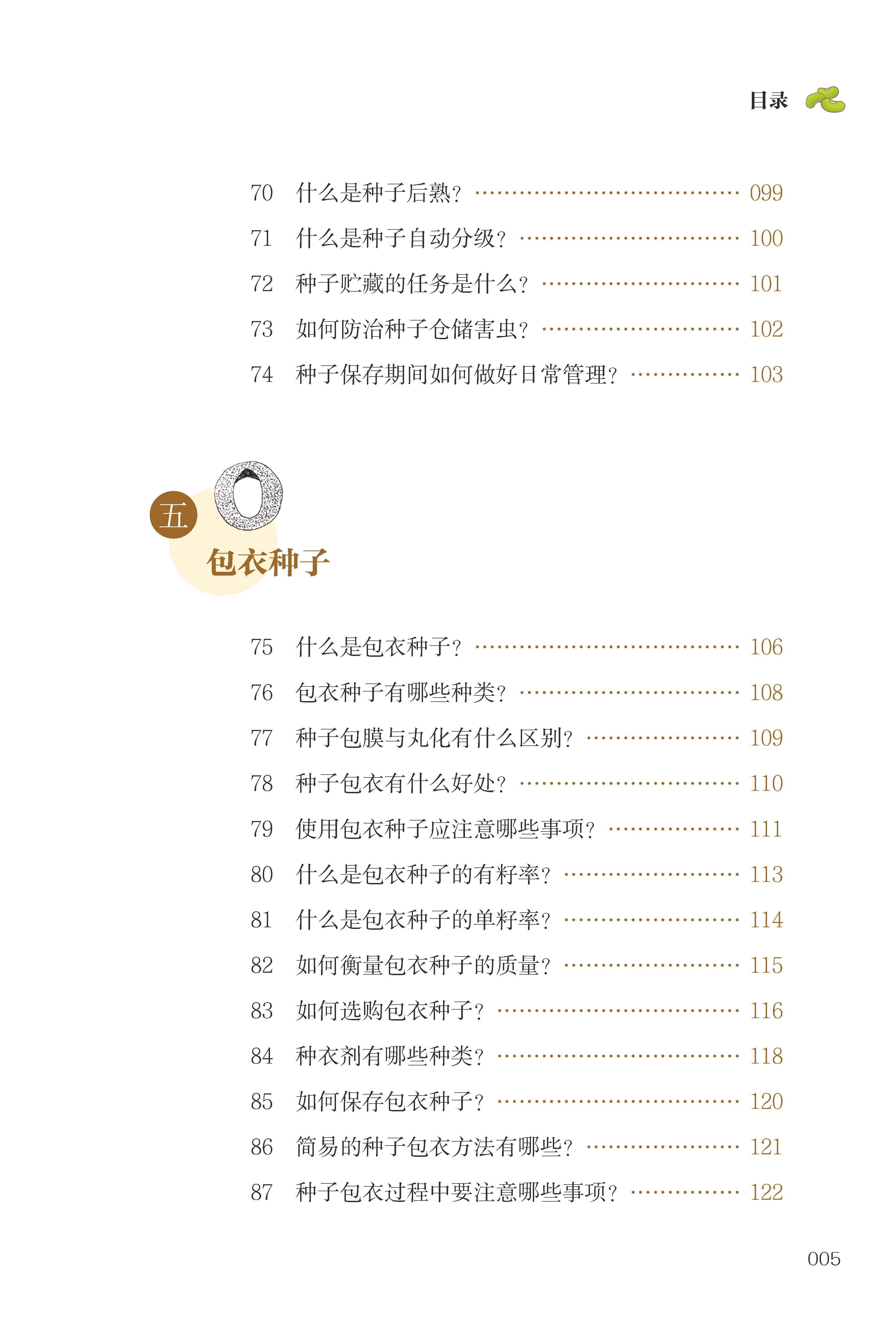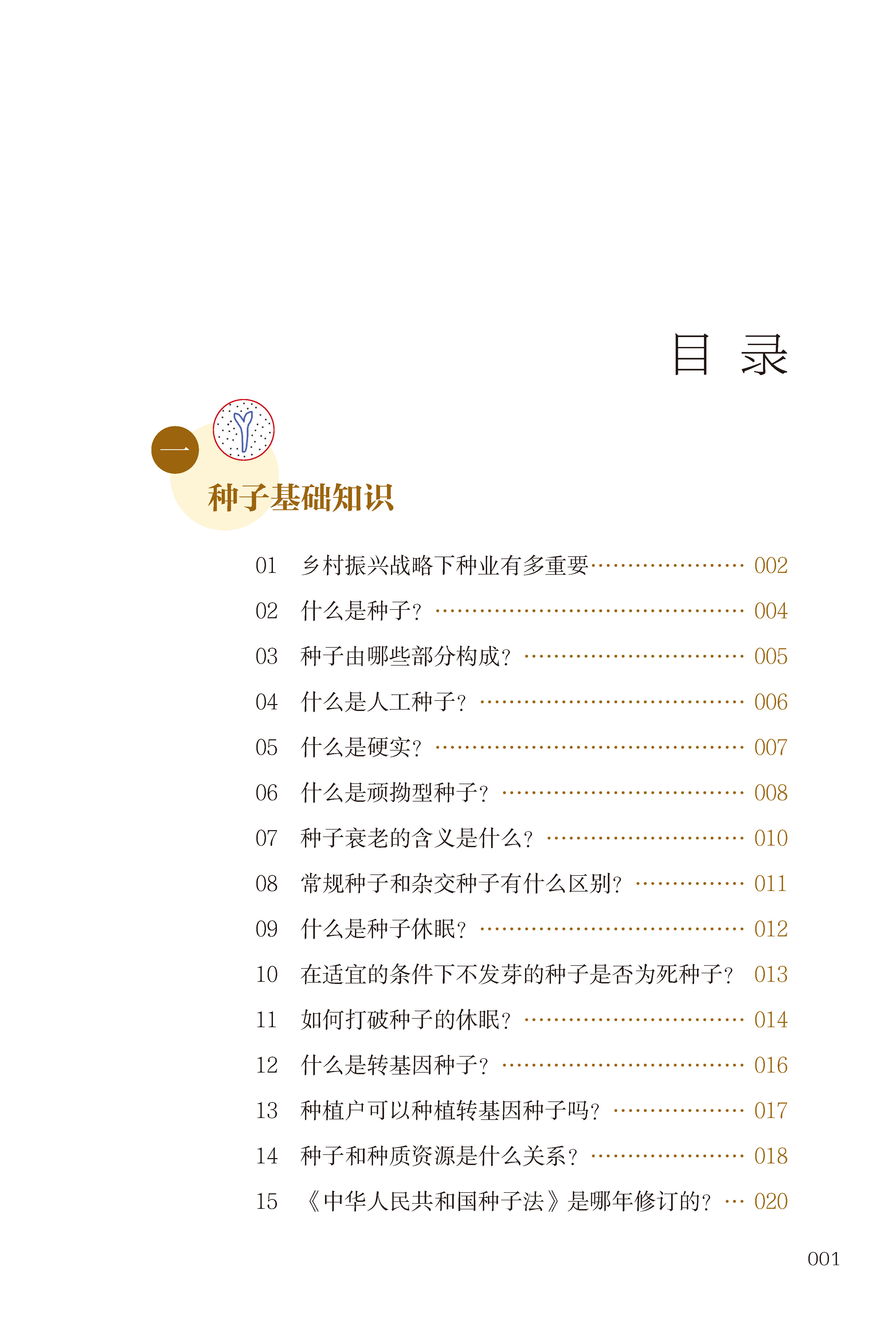 本书以百问百答的形式,明确而清晰地介绍了种子基础知识、种子质量、种子生产、种子加工与贮藏、种子纠纷与解决、包衣种子等种子相关概念、原理以及实用技巧与案例,帮助广大农业生产者、农技人员更好地认识种子、选购种子、使用种子,并提供科学、实用、易读的技术指导,为农业增产、农民增收、乡村振兴打下知识基础。