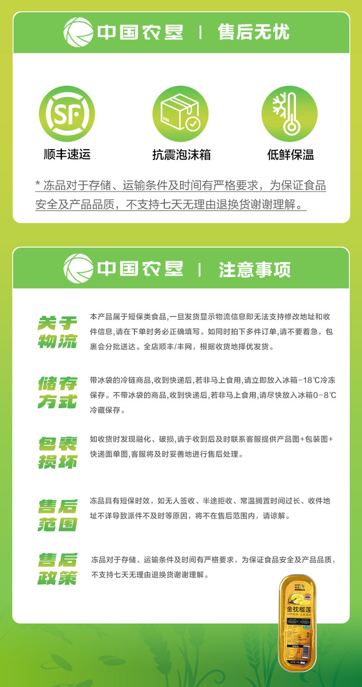 【品名】“泰国进口A级果 央企旗下品牌”多彩农垦 金枕榴莲无核果肉小金条/芝士烤榴莲 顺丰冷链发货 100g/盒 【规格】金枕榴莲无核果肉小金条/芝士烤榴莲 【产地】国内 【保质期】-18°冷冻保存18个月 【发货包装】独立包装 【发货地】山东 【发货快递】顺丰 【不发货区域】新疆、西藏、黑龙江、云南、海南、青海、甘肃、四川、港澳台 【发货时效】48-72小时,周末节假日顺延 |