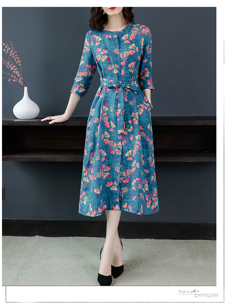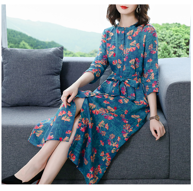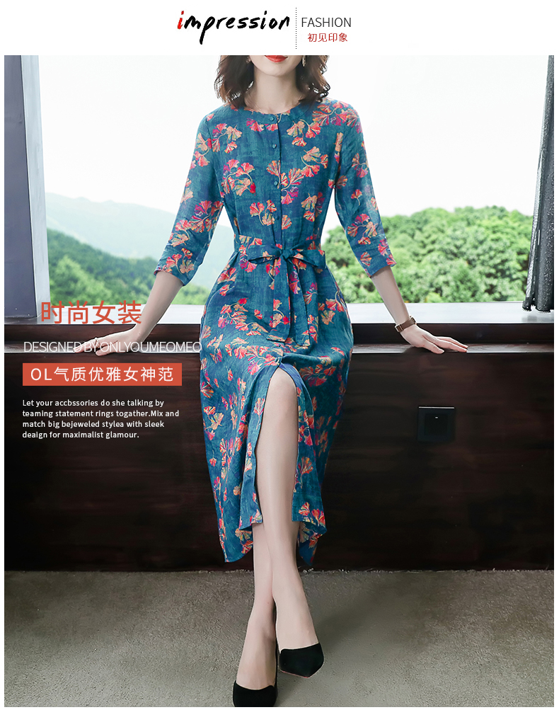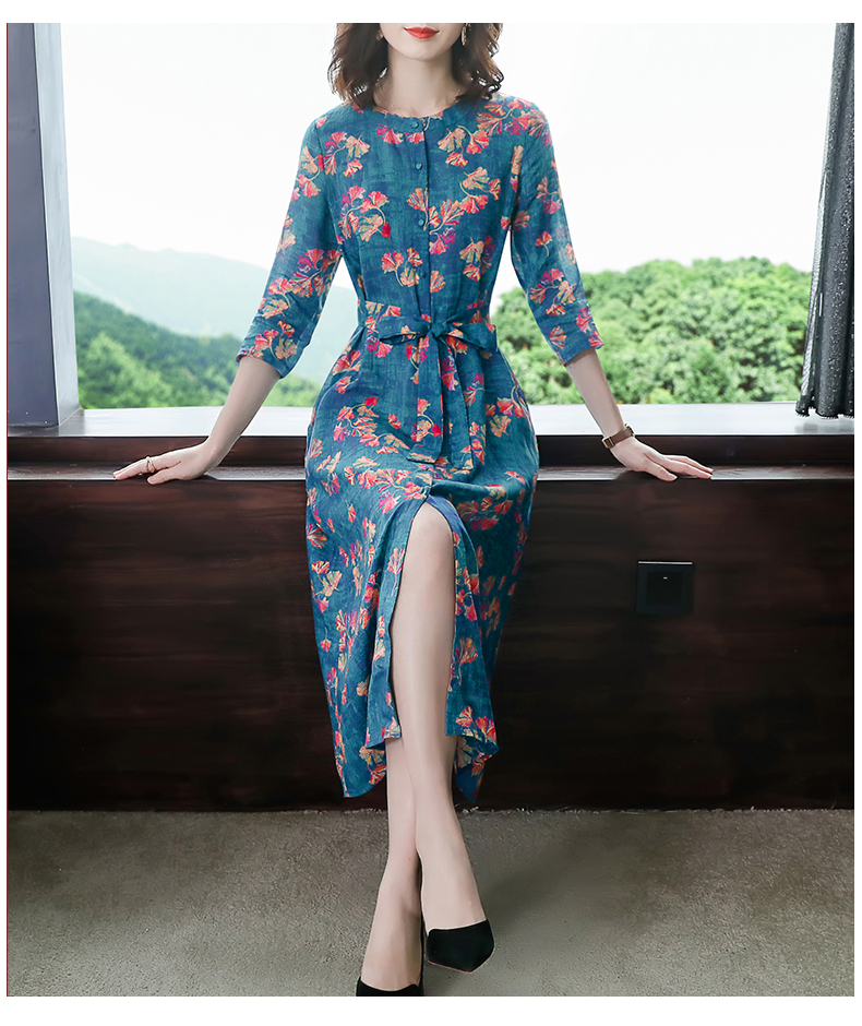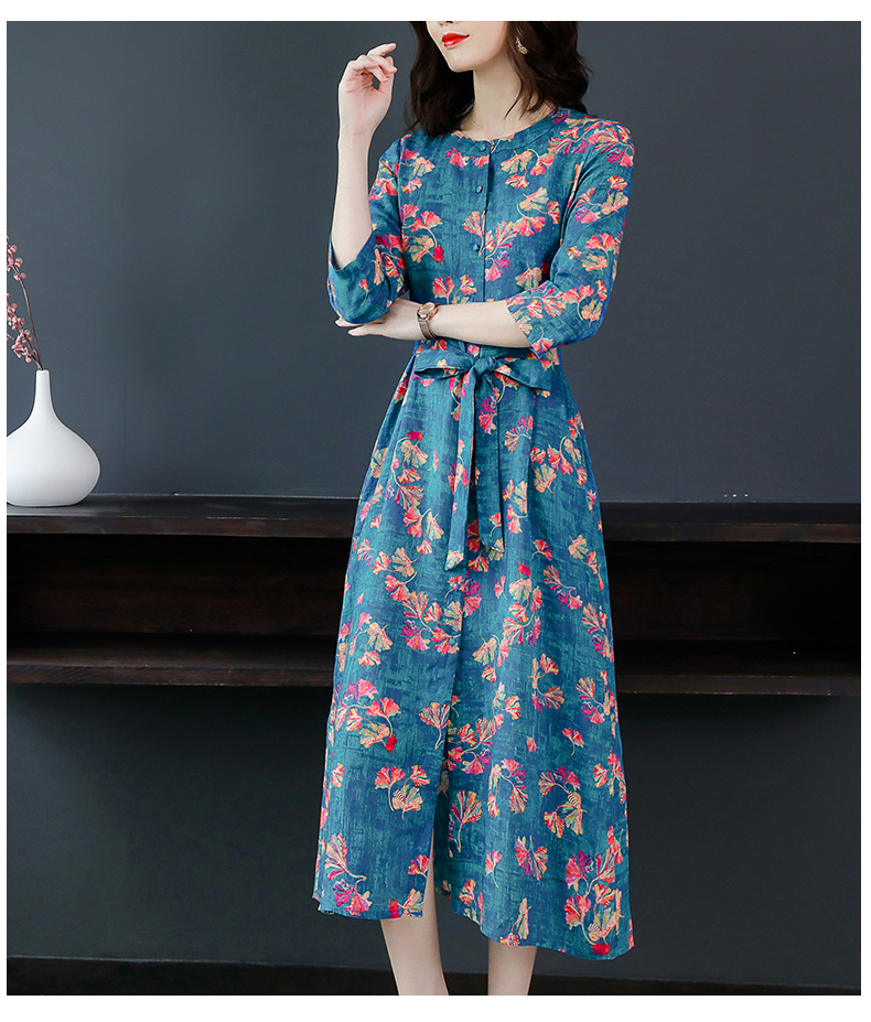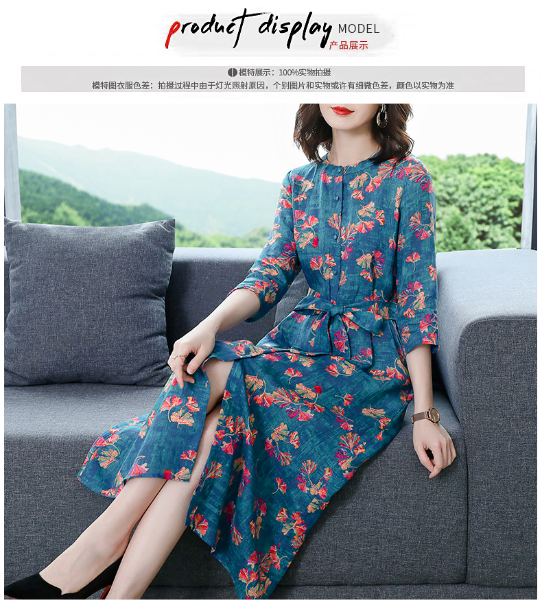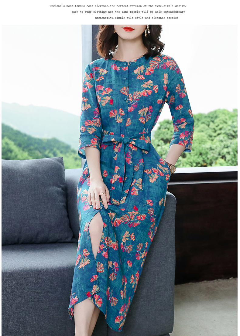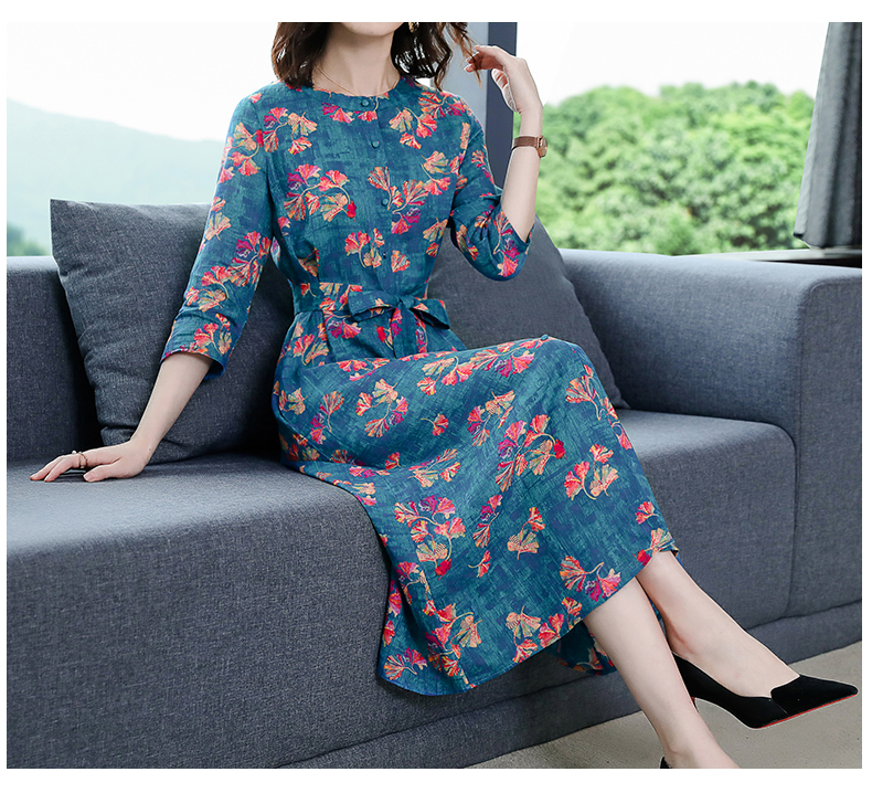W-874新款棉麻宽松大码女装中长款收腰苎麻碎花显瘦长裙