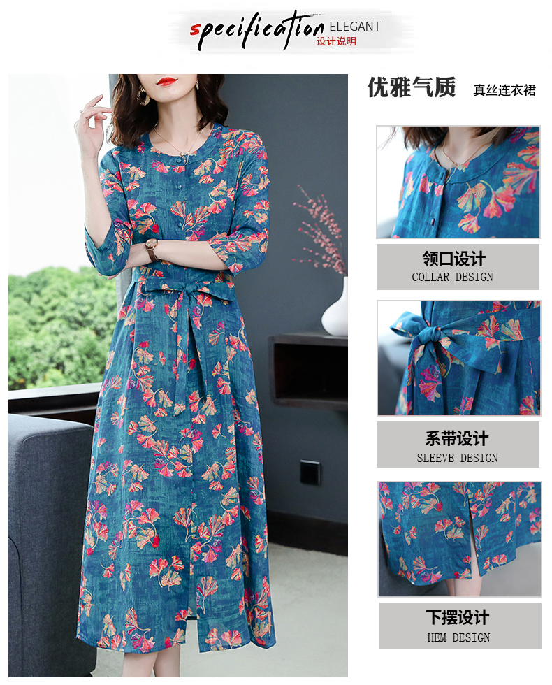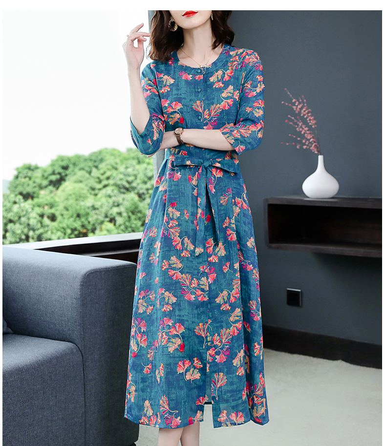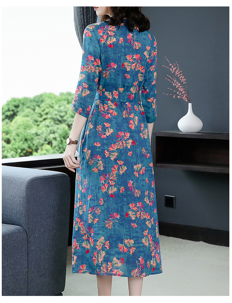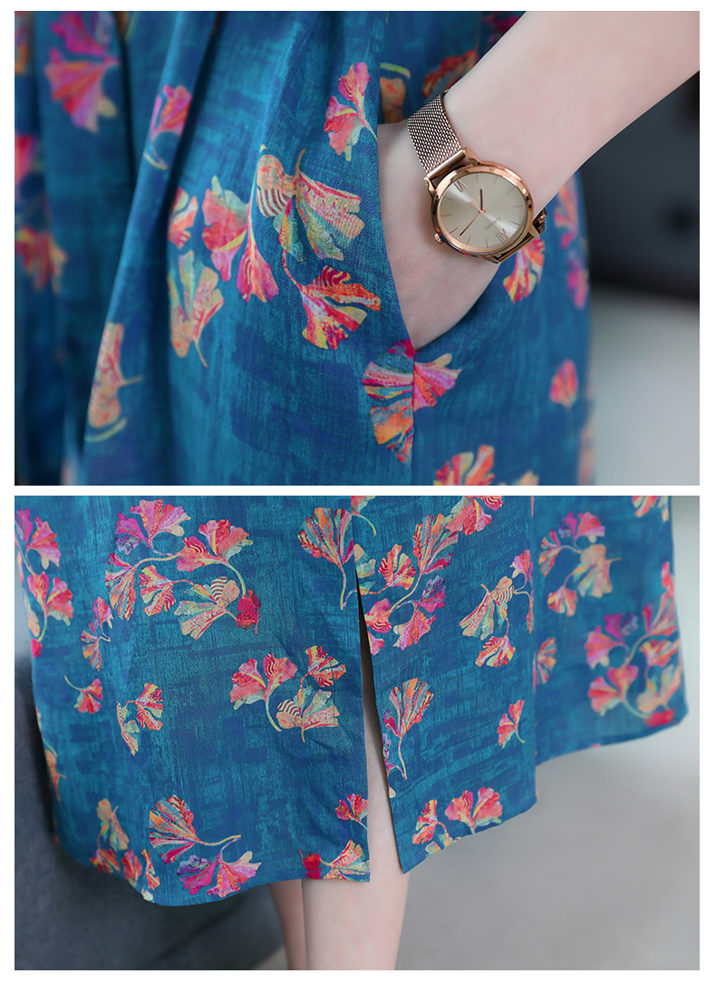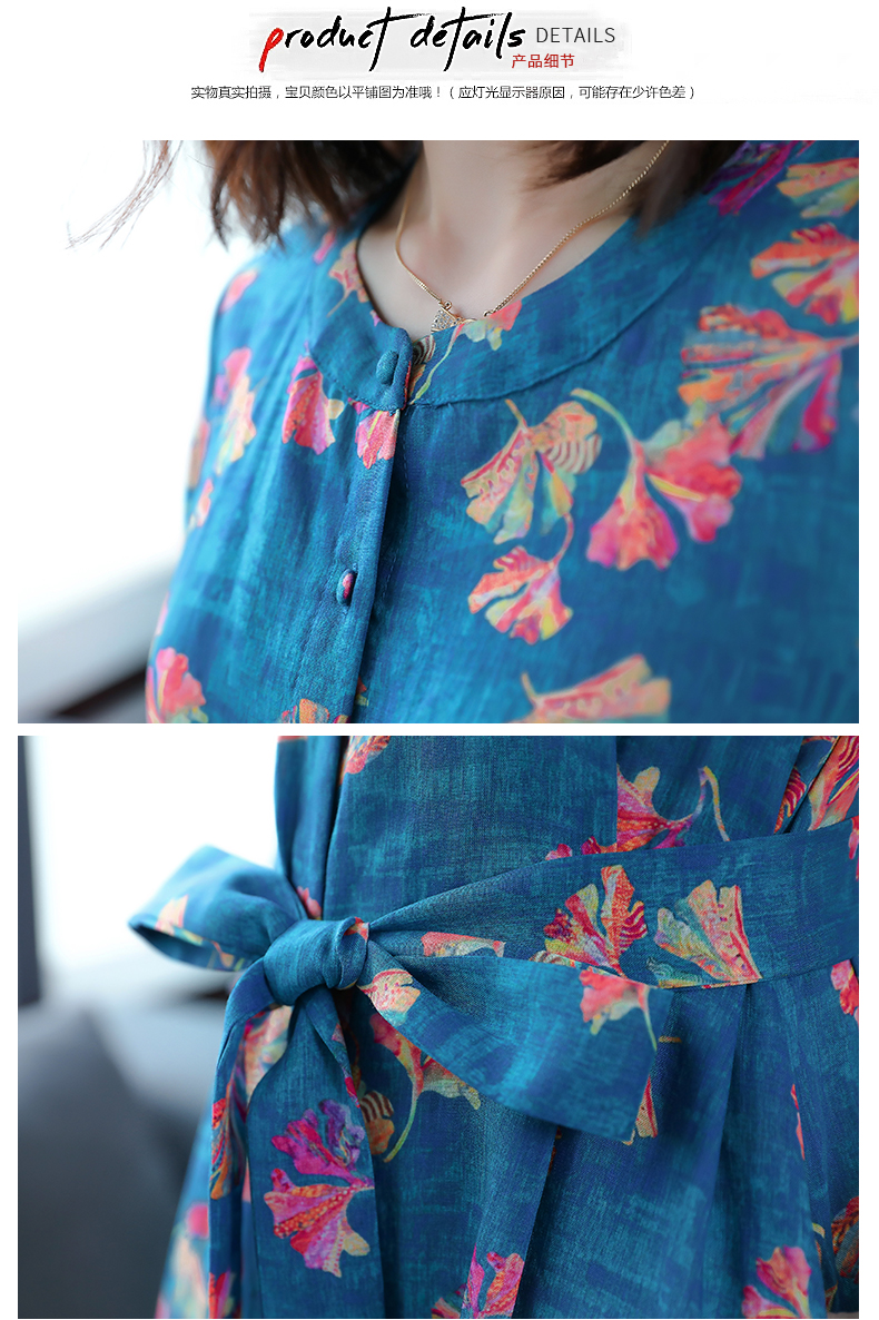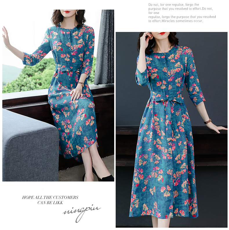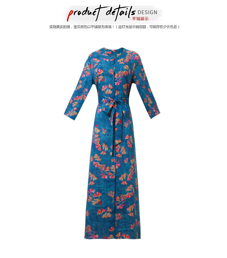W-874新款棉麻宽松大码女装中长款收腰苎麻碎花显瘦长裙