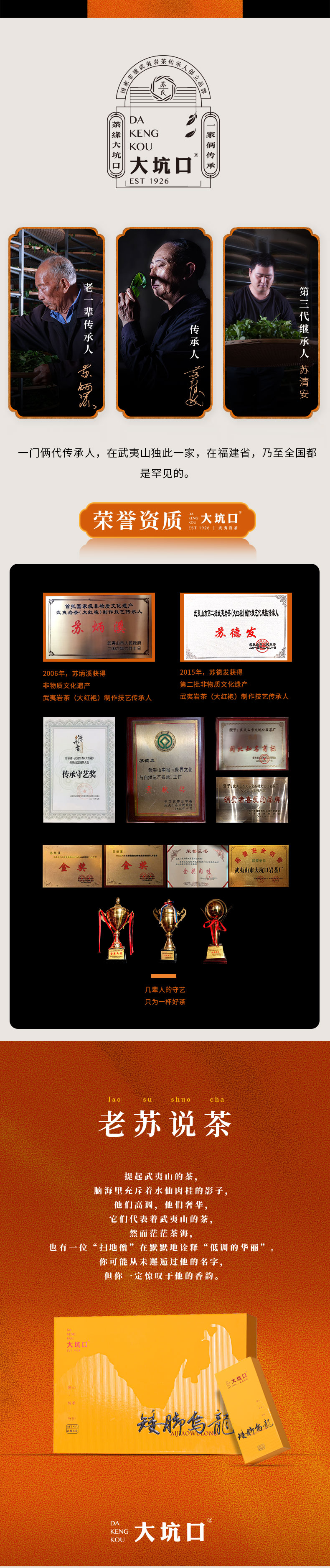 大坑口岩茶有限公司,位于武夷山市-天心村,茶山分布于正岩产区的“三坑、两涧”,由首批非物质文化遗产武夷岩茶制作技艺传承人:苏炳溪和第二批传承人:苏德发先生的精心手工制作,造就了大坑口岩茶的独特品质