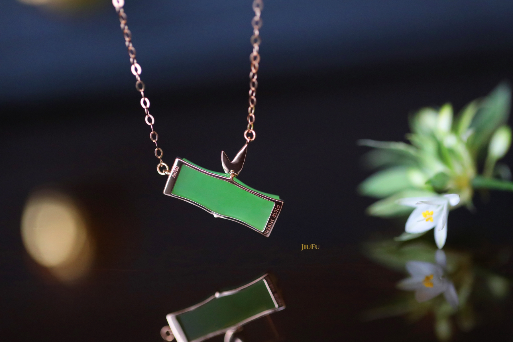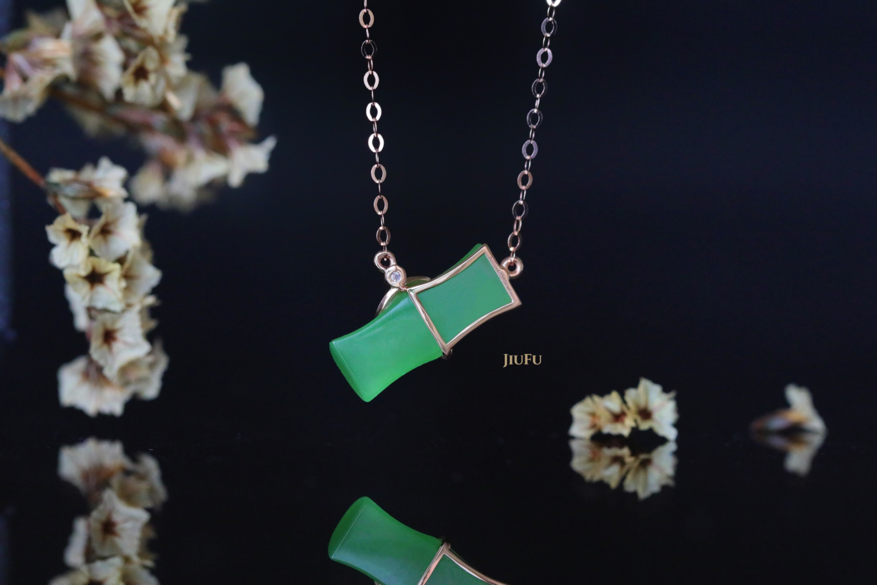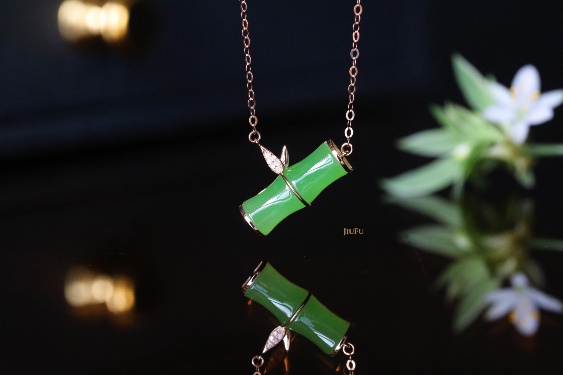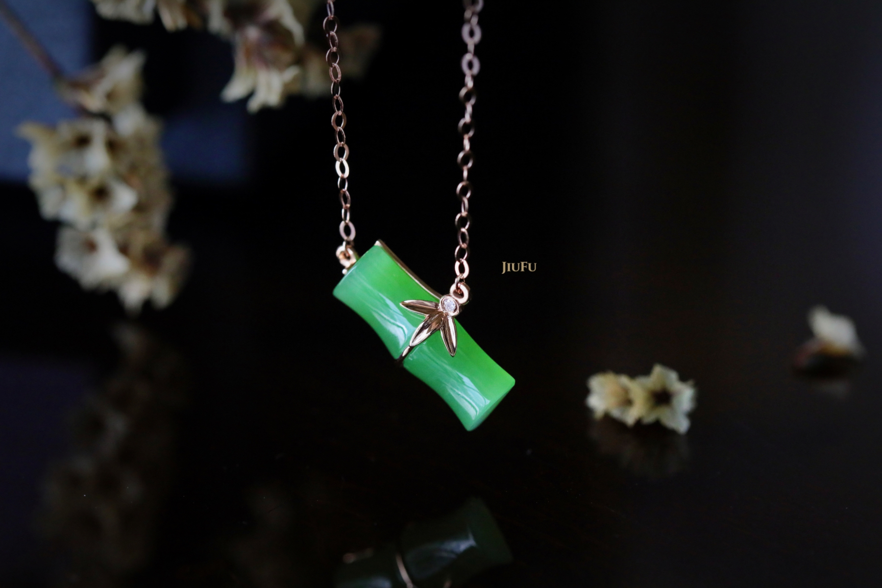 18K玫瑰金和田玉(碧玉)镶钻项链--风摇青玉枝/竹节6*15mm/链长40+2cm