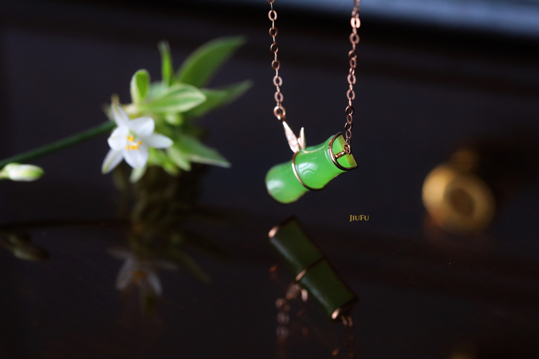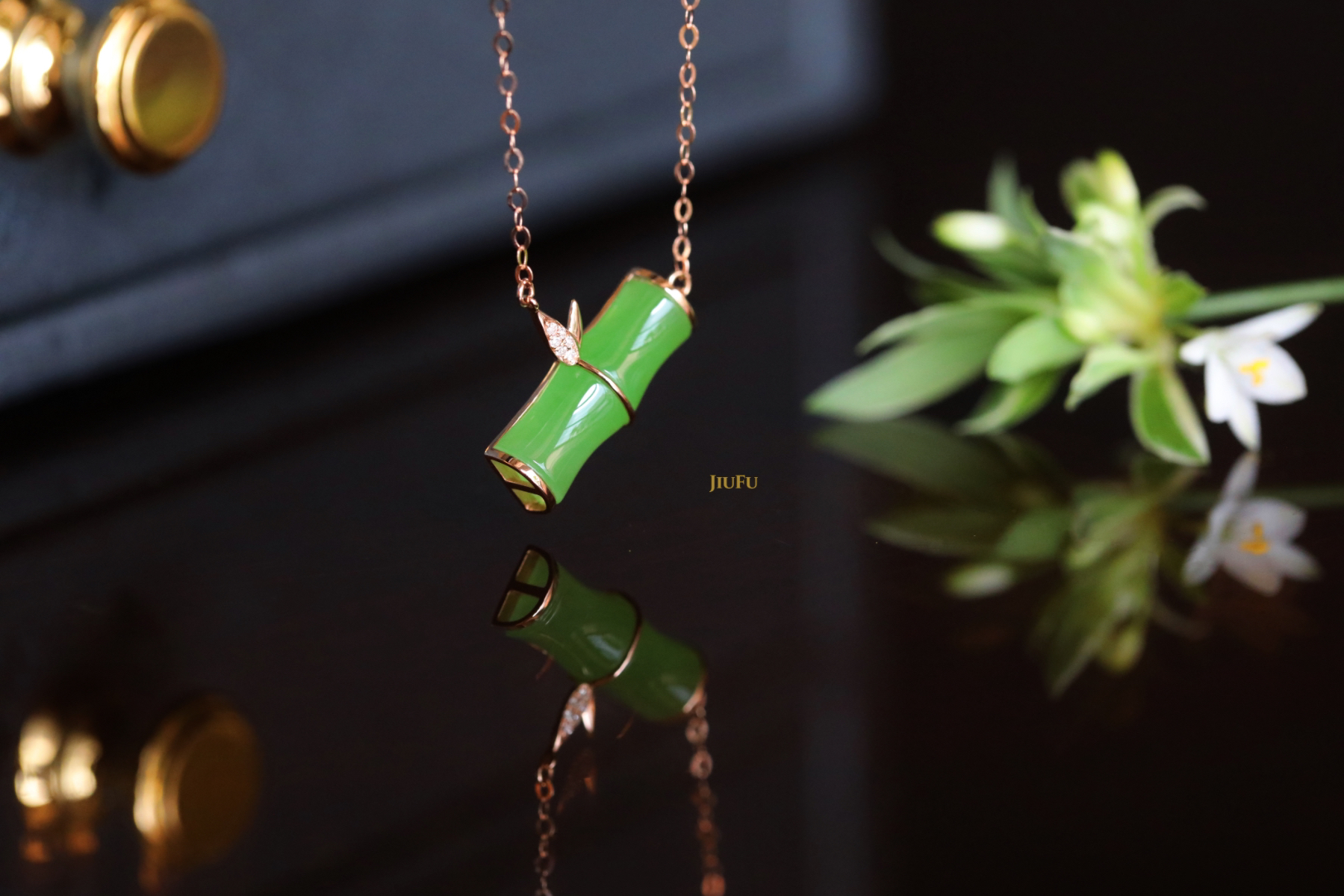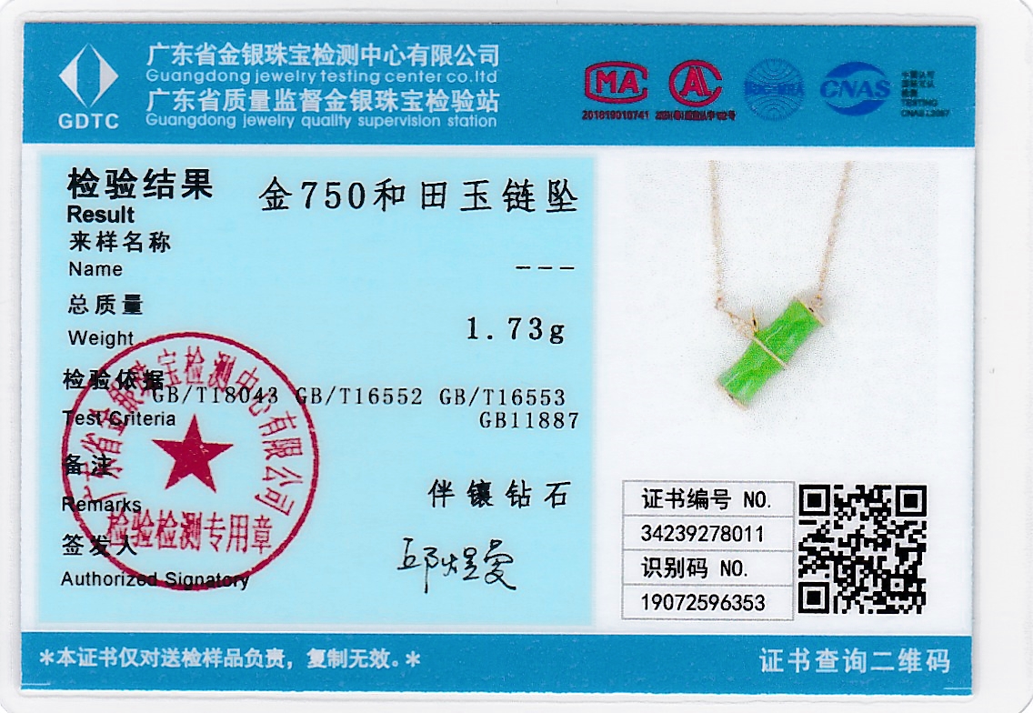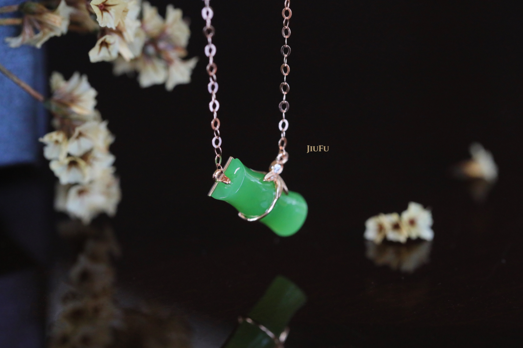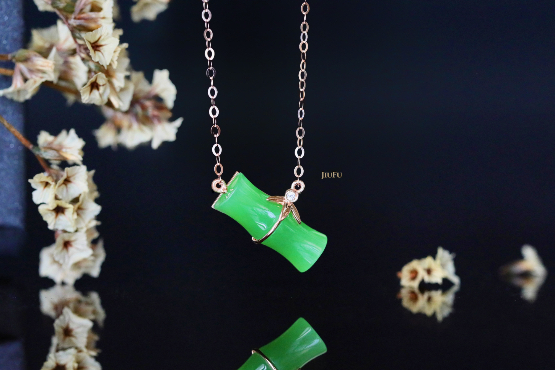18K玫瑰金和田玉(碧玉)镶钻项链--风摇青玉枝/竹节6*15mm/链长40+2cm