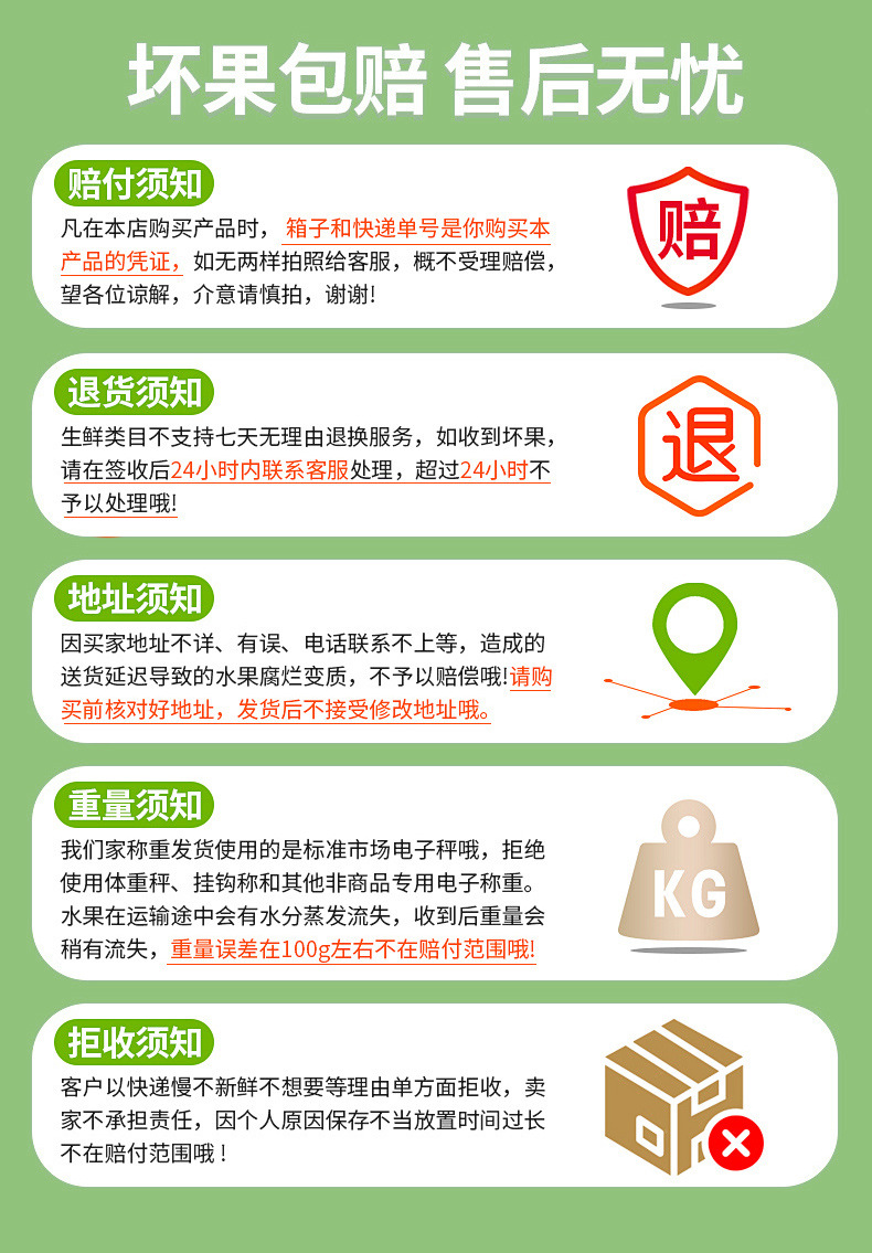 如收到坏果,请在签收后24小时内联系客服处理,超过24小时不予以处理
