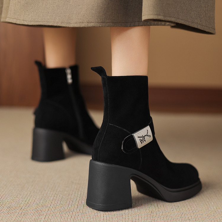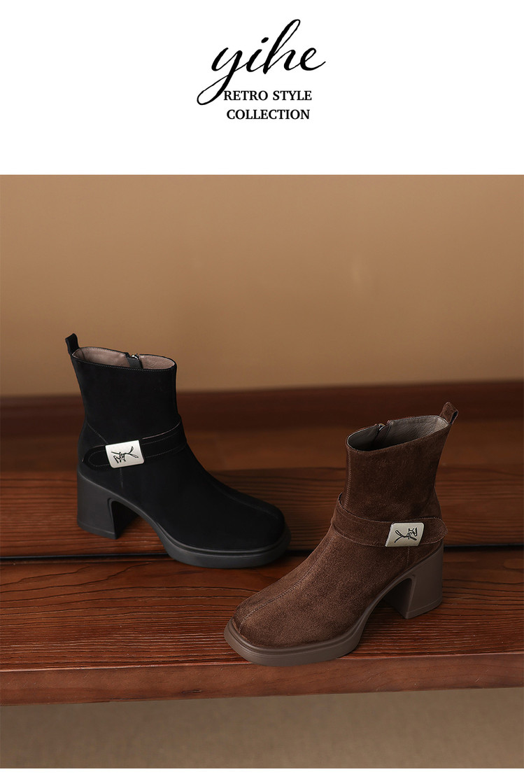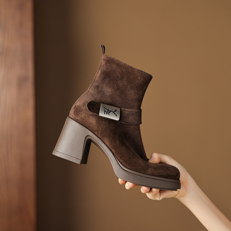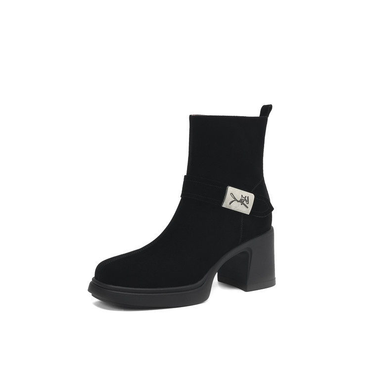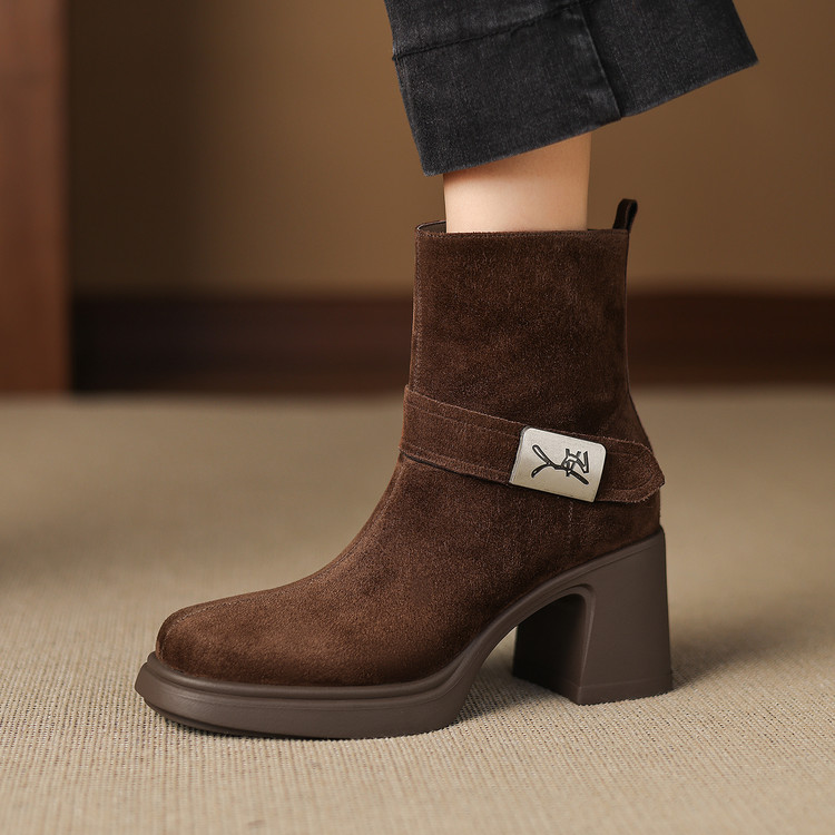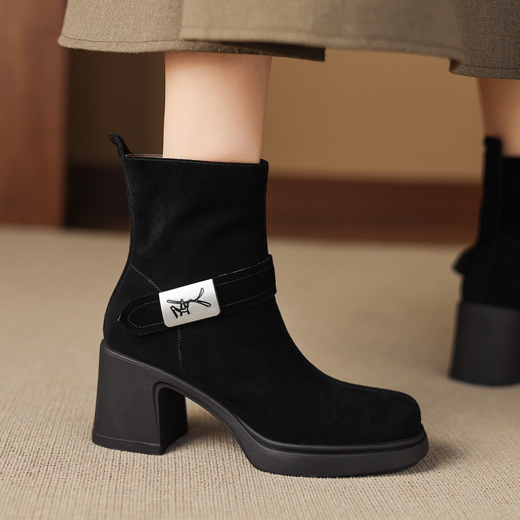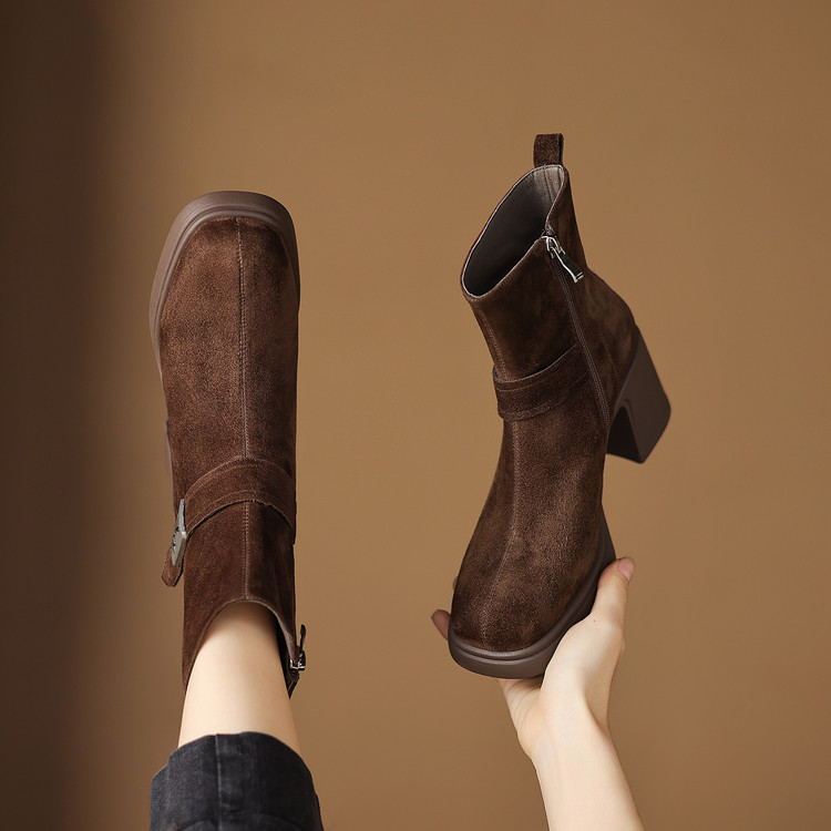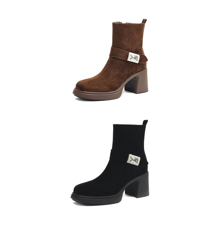 【预售5天】磨砂皮粗跟圆头高跟短靴女秋冬新款复古皮带扣厚底切尔西靴ZYY&A1528