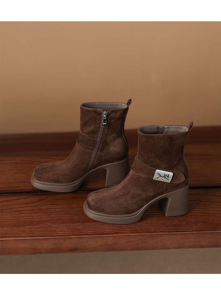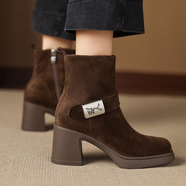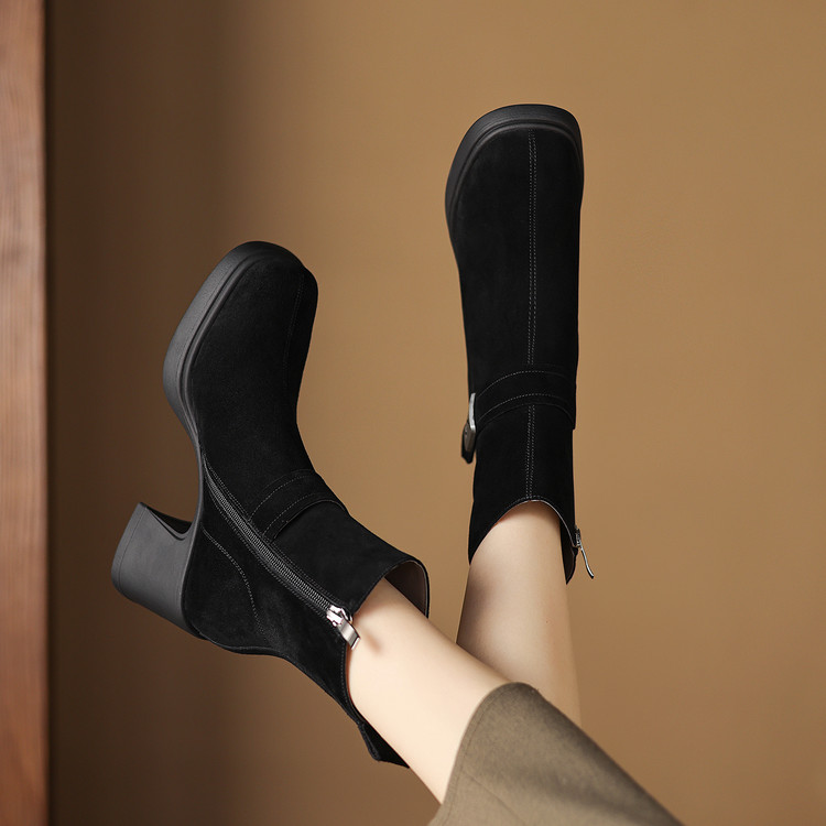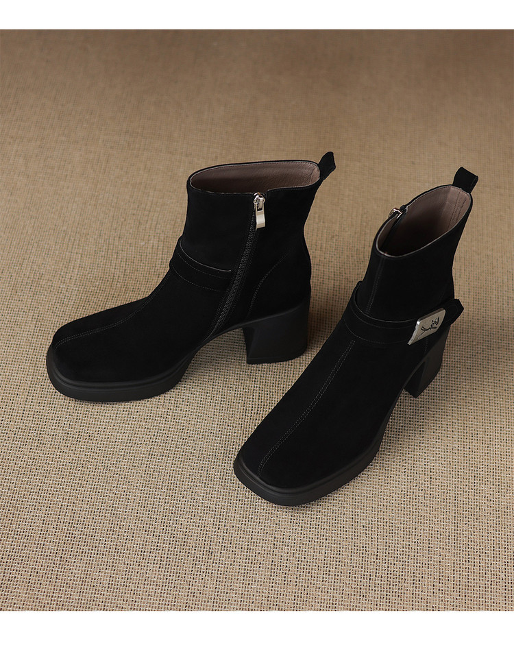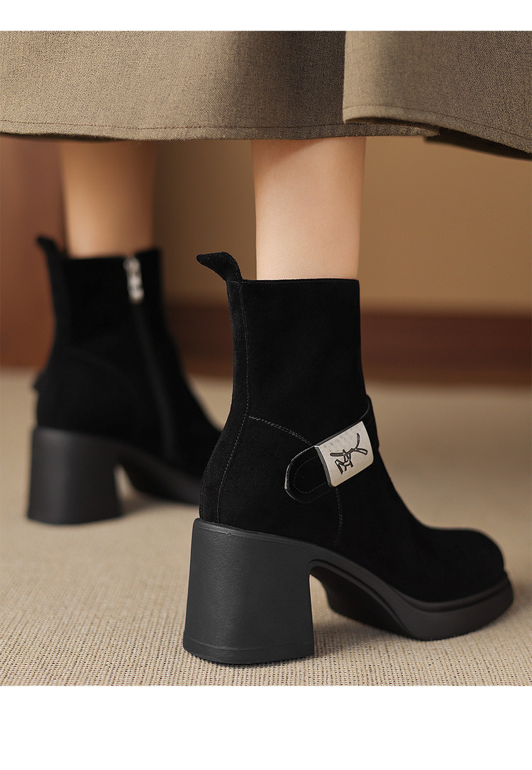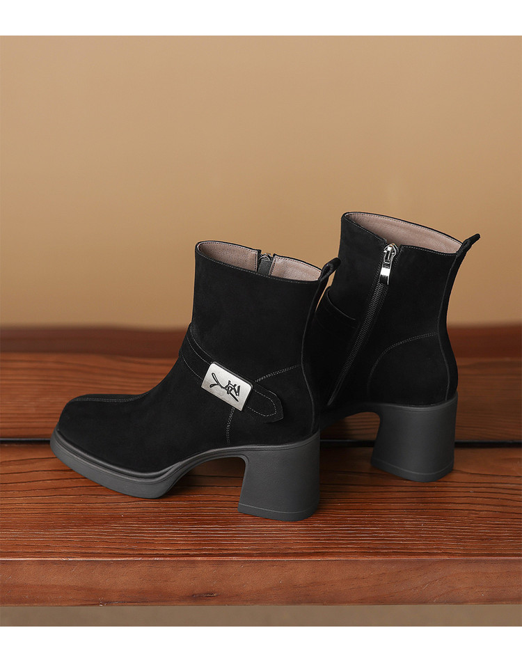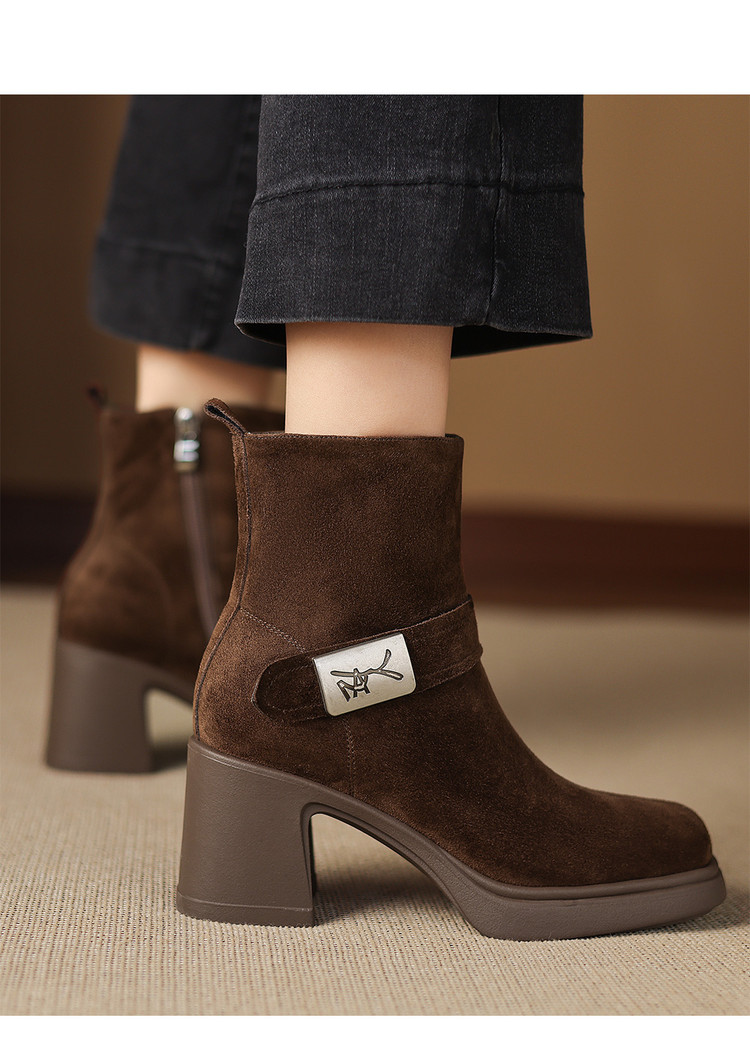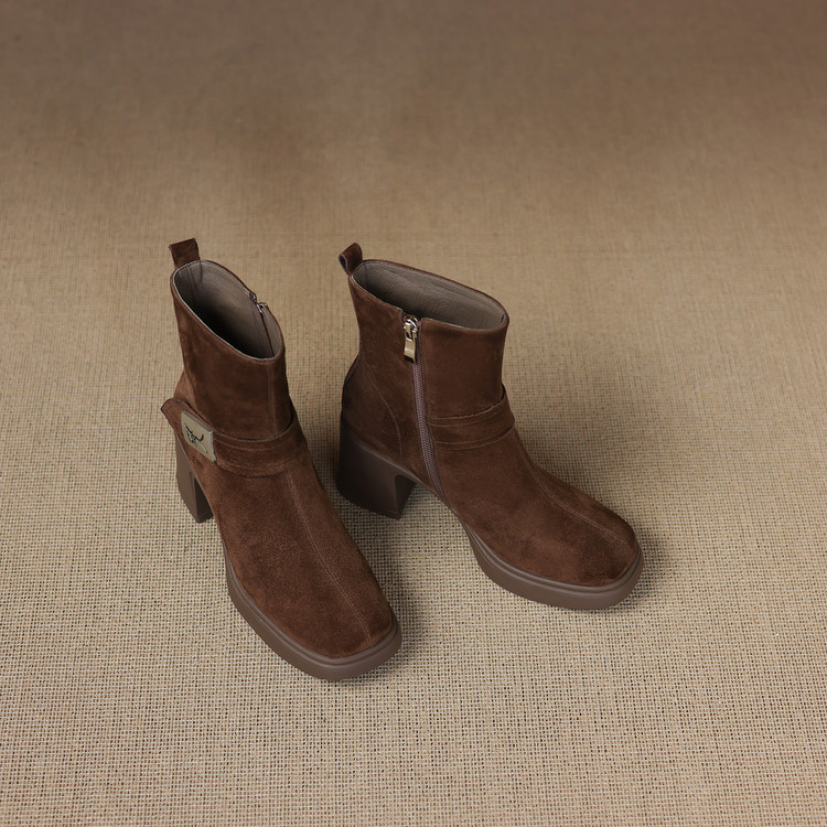 【预售5天】磨砂皮粗跟圆头高跟短靴女秋冬新款复古皮带扣厚底切尔西靴ZYY&A1528