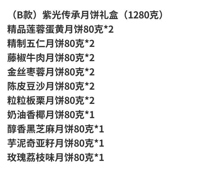 (B款)紫光传承月饼礼盒(1280克) 精品莲蓉蛋黄月饼80克*2 精制五仁月饼80克*2 藤椒牛肉月饼80克*2 金丝枣蓉月饼80克*2 陈皮豆沙月饼80克*2 粒粒板栗月饼80克*2 奶油香椰月饼80克*1 醇香黑芝麻月饼80克*1 芋泥奇亚籽月饼80克*1 玫瑰荔枝味月饼80克*1 精选优质原料 遵循古法工艺 每一枚月饼都饱含匠心