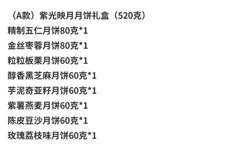 (A款)紫光映月月饼礼盒(520克) 精制五仁月饼80克*1 金丝枣蓉月饼80克*1 粒粒板栗月饼60克*1 醇香黑芝麻月饼60克*1 芋泥奇亚籽月饼60克*1 紫薯燕麦月饼60克*1 陈皮豆沙月饼60克*1 玫瑰荔枝味月饼60克*1