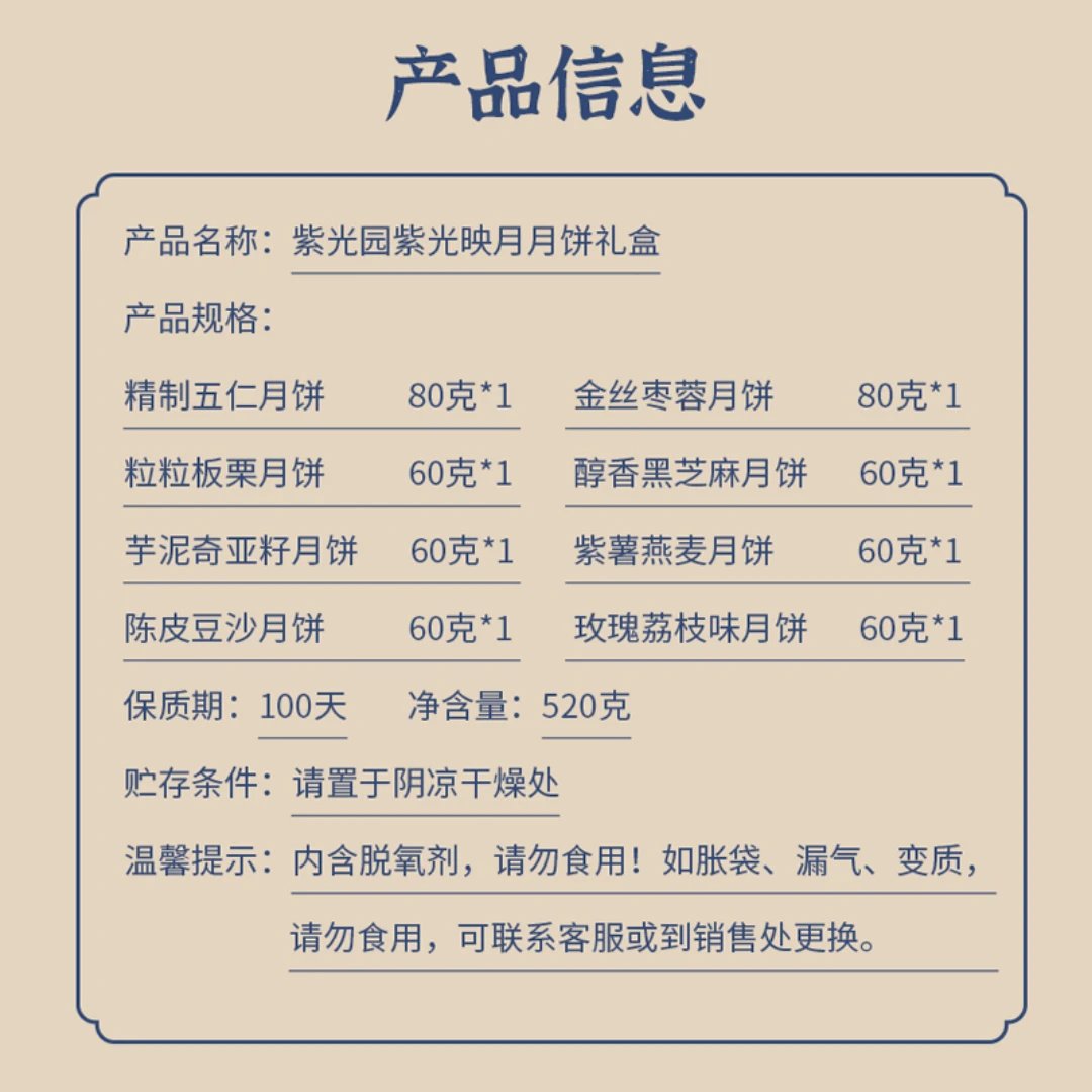 【品牌】紫光园 【产品名称】 (A款)紫光映月月饼礼盒(520克) (B款)紫光传承月饼礼盒(1280克) 【保质期】100天 【生产日期】8月1日 【贮藏】常温保存,置于阴凉通风干燥处 【快递】顺丰 【不发货】新疆、西藏、海南、青海、云南 【发货时效】48小时内 【温馨提示】内含脱氧剂,请勿食用!如胀袋、漏气、变质,请勿食用,可联系客服或到销售处更换。 【售后说明】 1.产品发出不支持无理由拒收拦截撤单改地址 2.如出现异常情况,请带面单+产品拍照+产品包装照片与我们联系,我们会第一时间处理,如产品有质量问题可在收货24小时之内,联系客服进行售后或者补发
