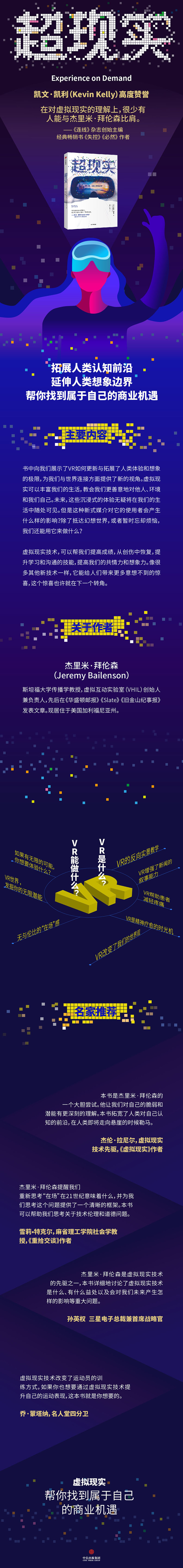 杰里米?拜伦森是虚拟现实技术的先驱之一,本书全景式地展现了虚拟现实将如何改变世界和未来。