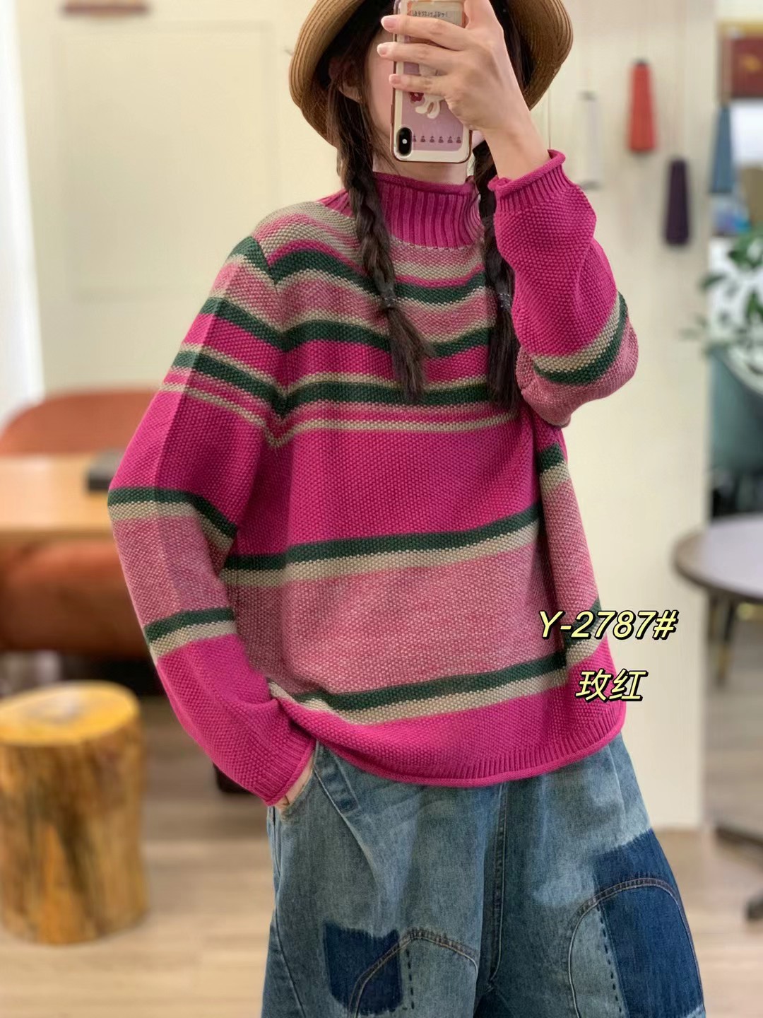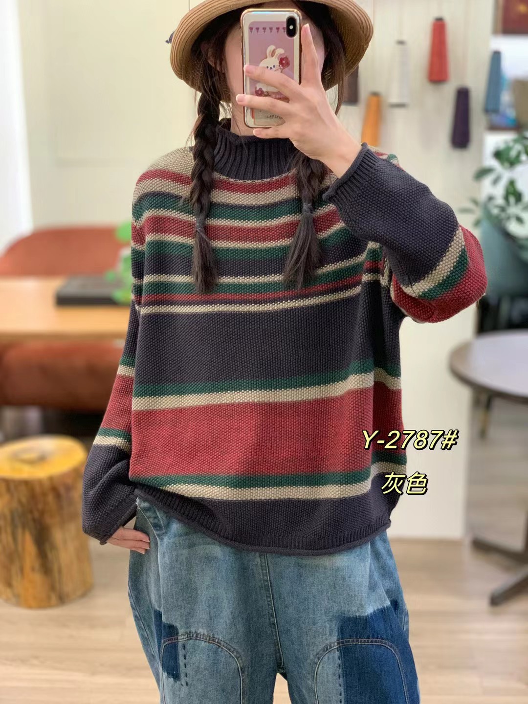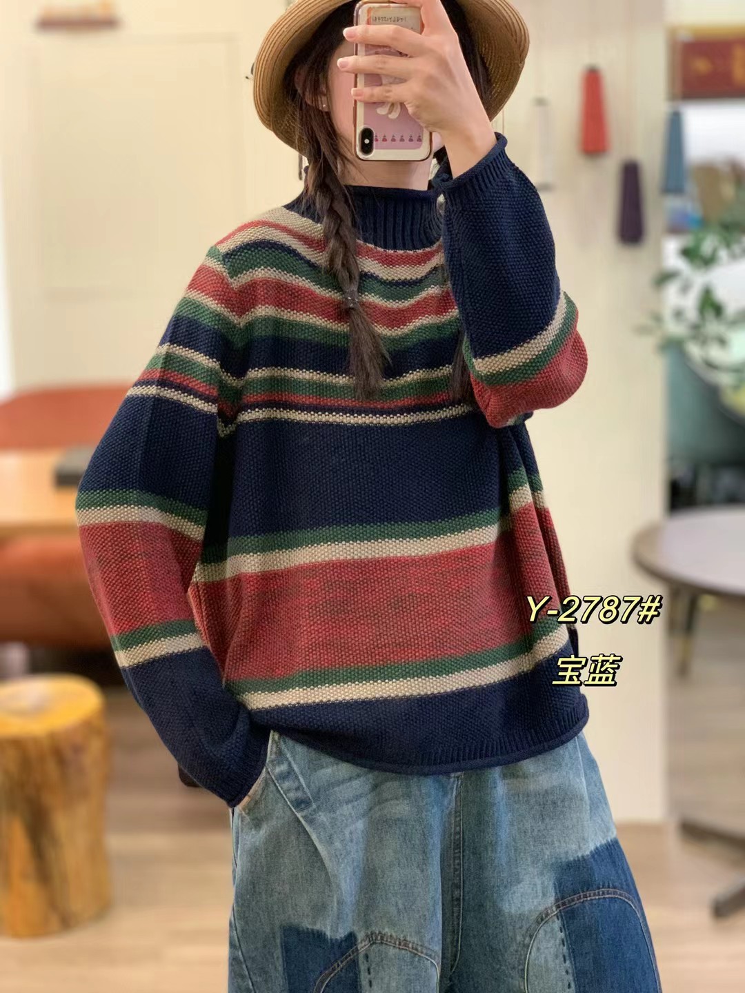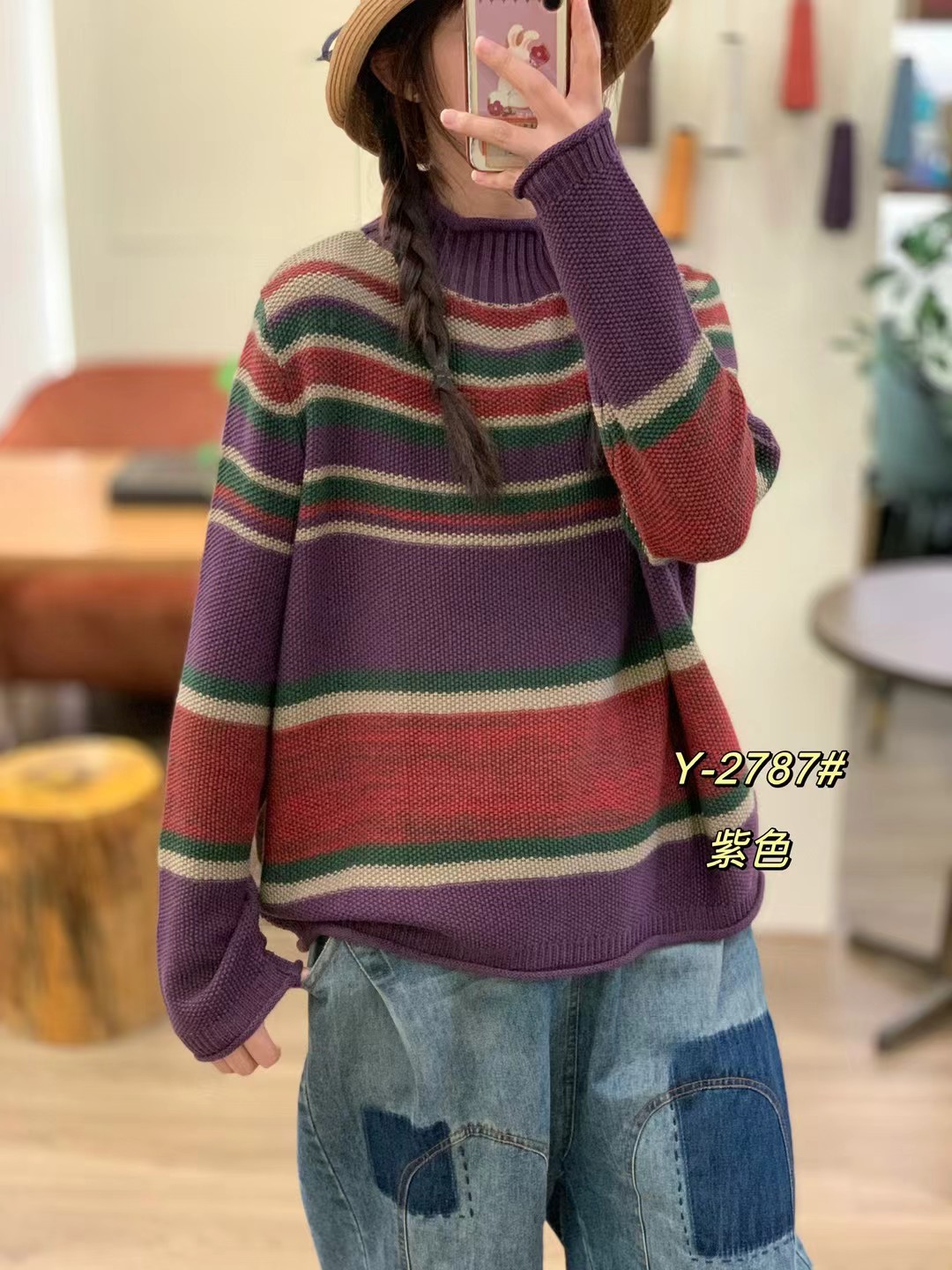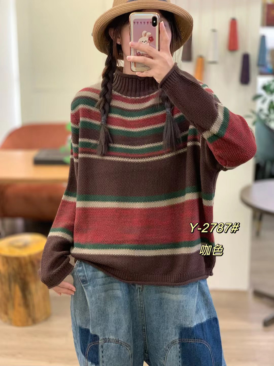2025秋季新款 复古条纹撞色做旧针织毛衣 宽松高领套头内搭上衣女