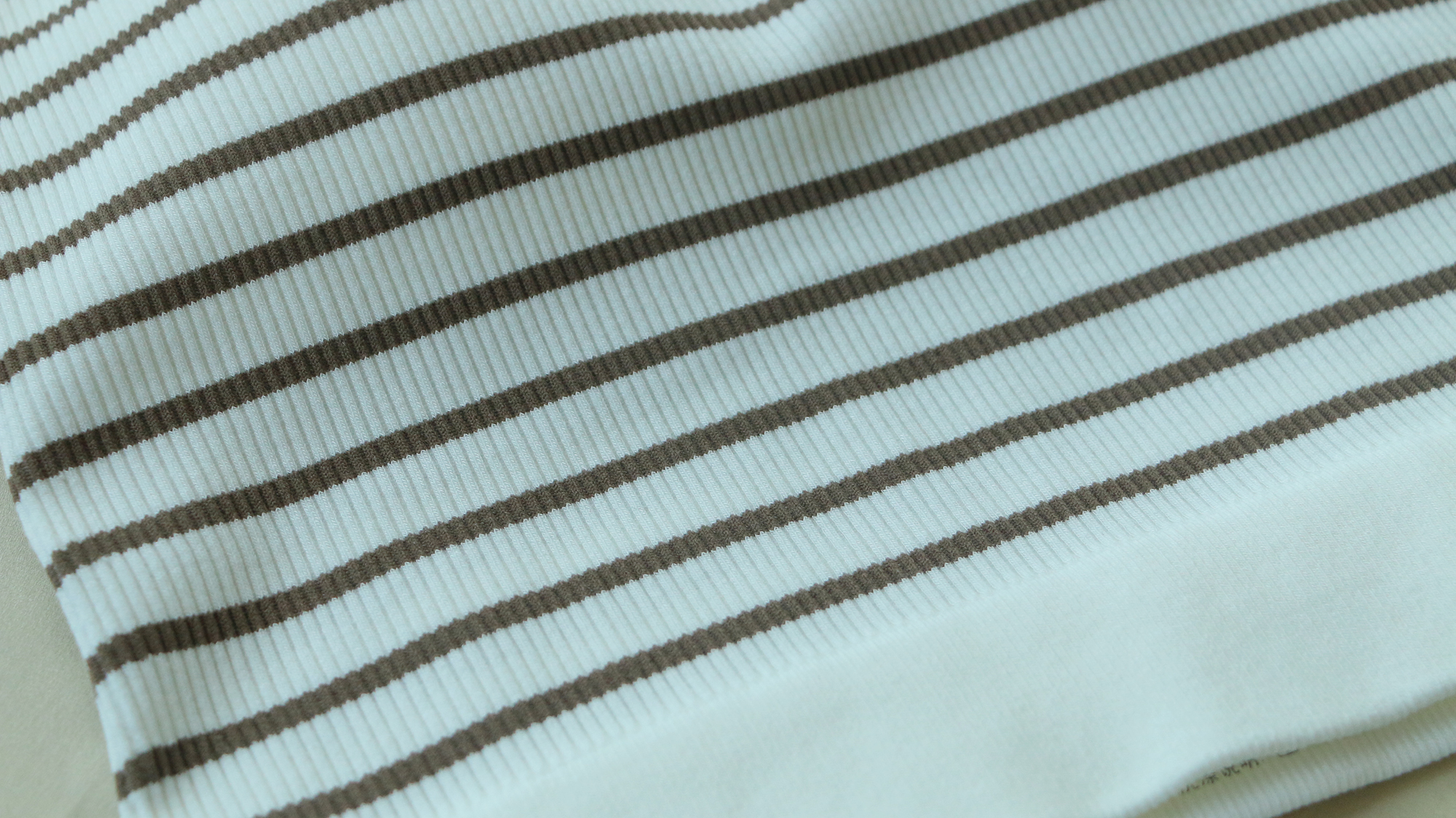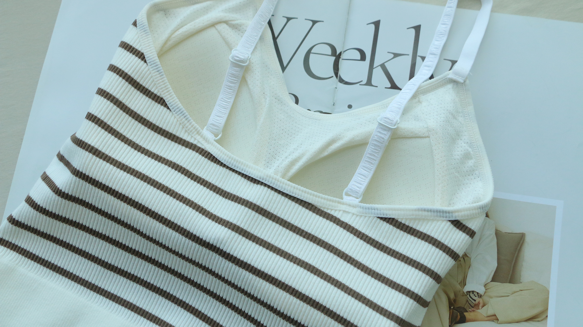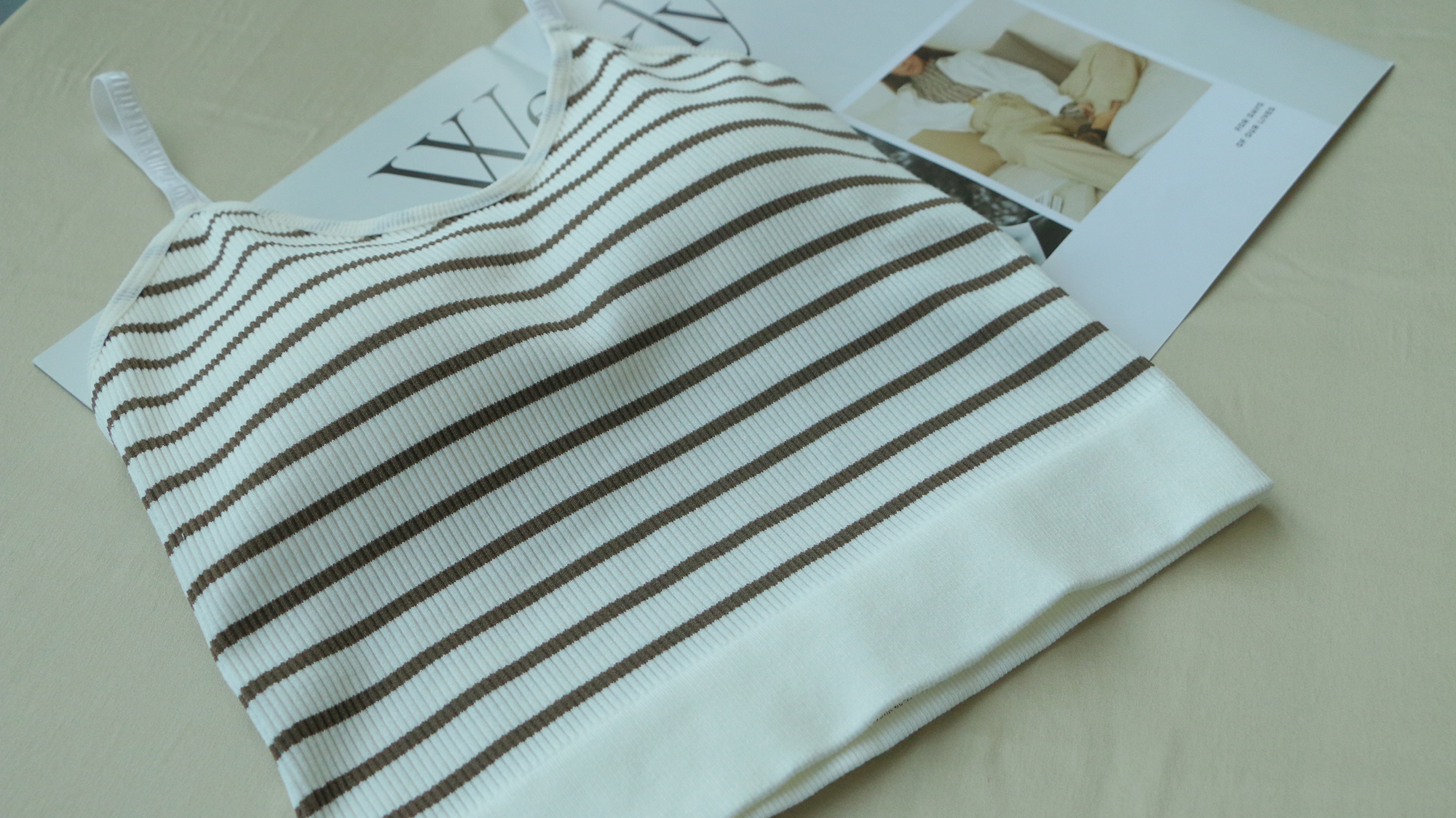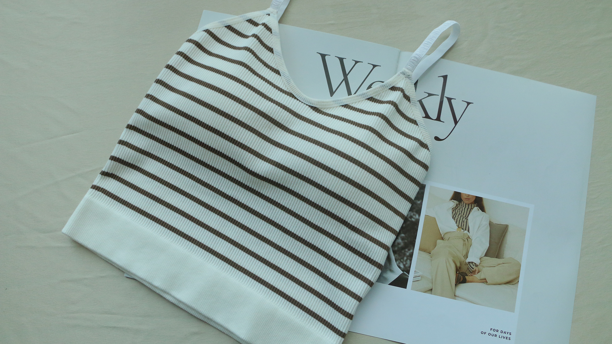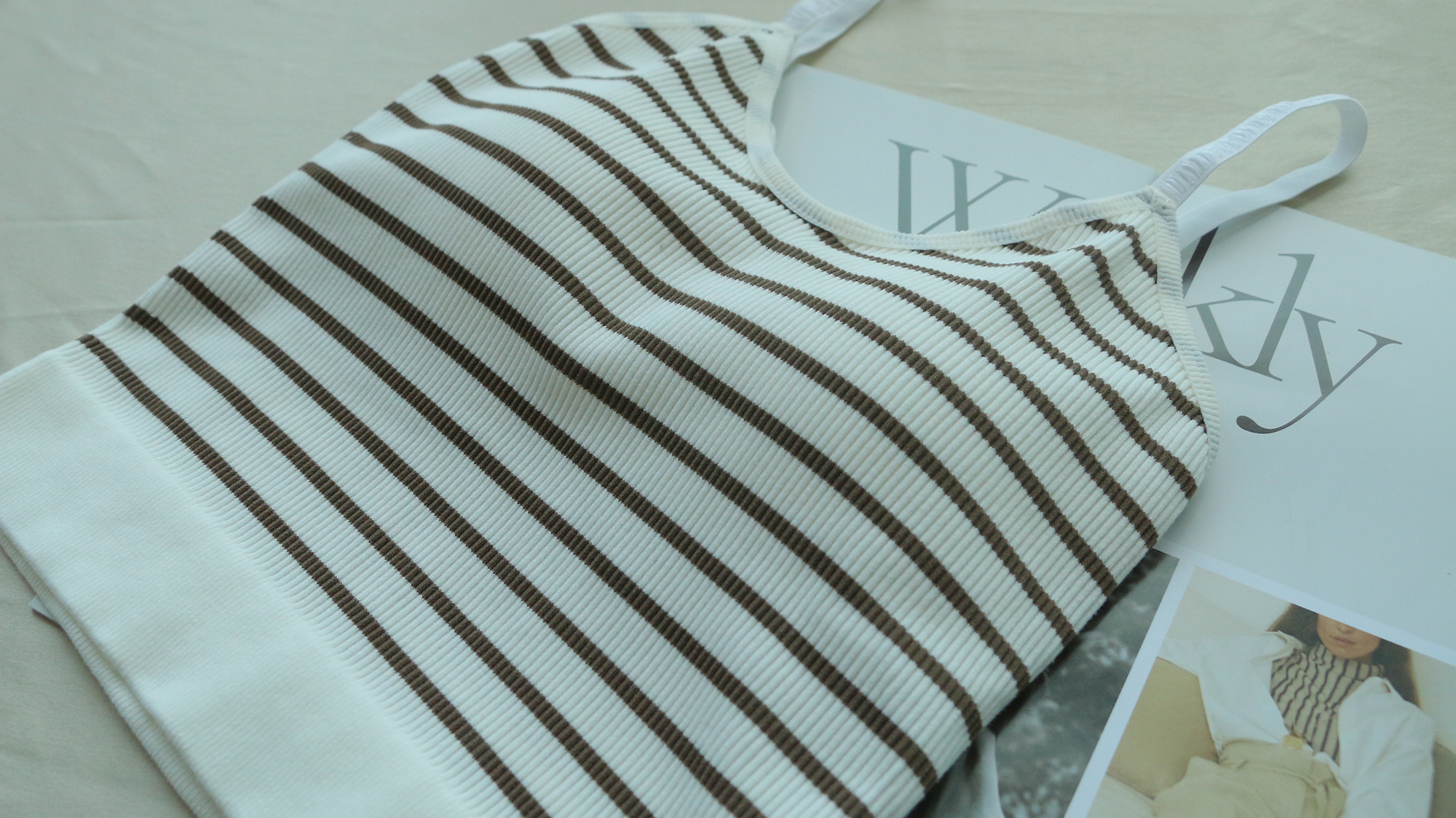 一件是条纹的吊带裹胸款,面料是螺纹针织,比背心款要厚一些,不透的,然后弹性非常好,可以作为内搭露出穿,外面搭配一件衬衫,很元气休闲的基础款。吊带可以调节长短。喜欢这种穿衣风格的亲入。