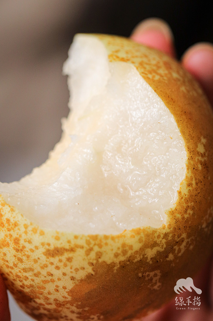 桂花梨的缺点是个头比较小,因此常规种植通常会在果柄使用激素来催果,可以让果重达到300克以上。而桂花梨自然生长,普遍只有150-300克,我们试吃了不同大小的梨,口感并没有明显差异。梨子虽然有套袋,但生态种植的梨子不使用农药来杀虫,果子表皮依旧会有锈斑,虽丑一些,但可以放心吃。