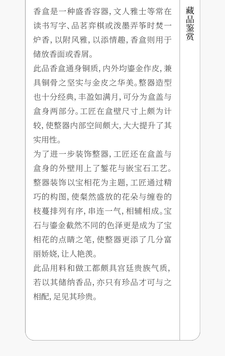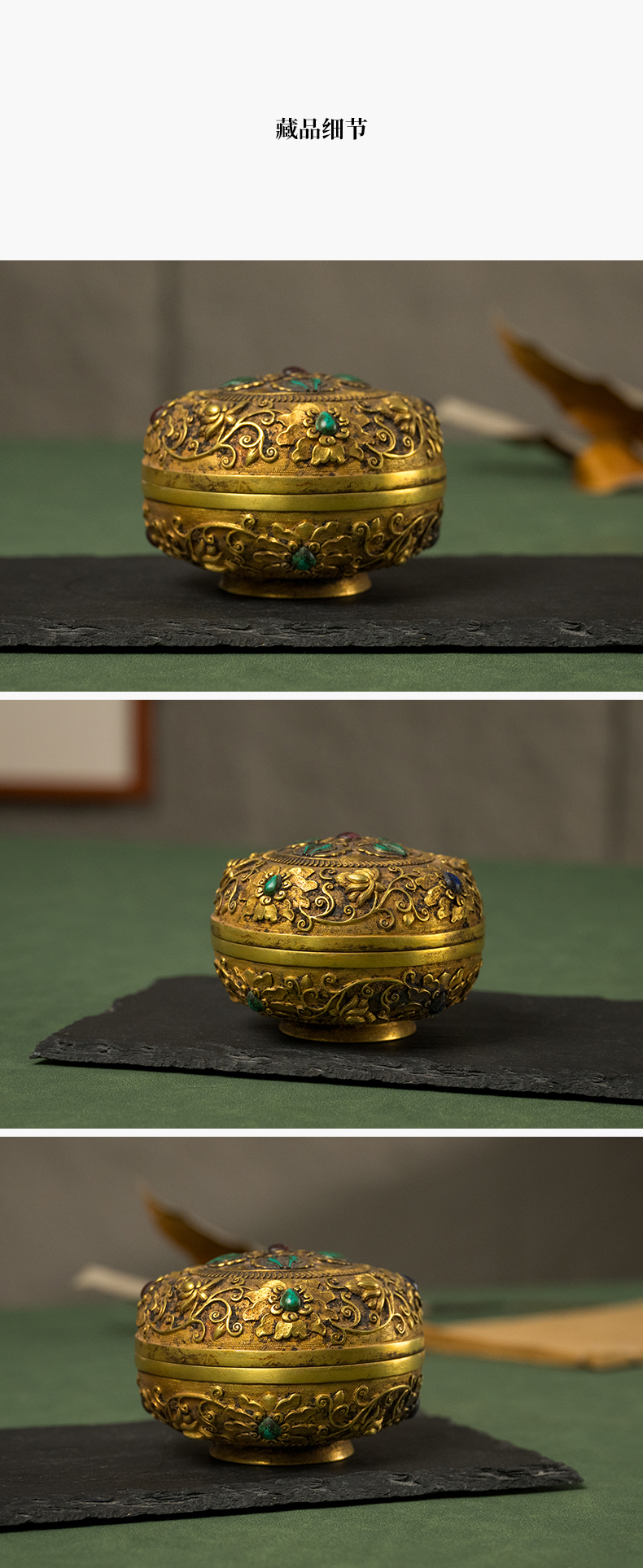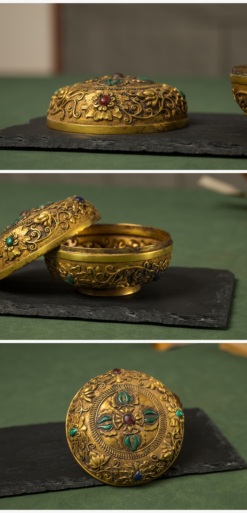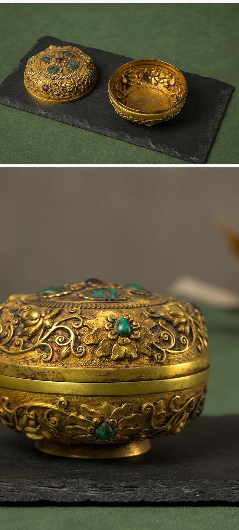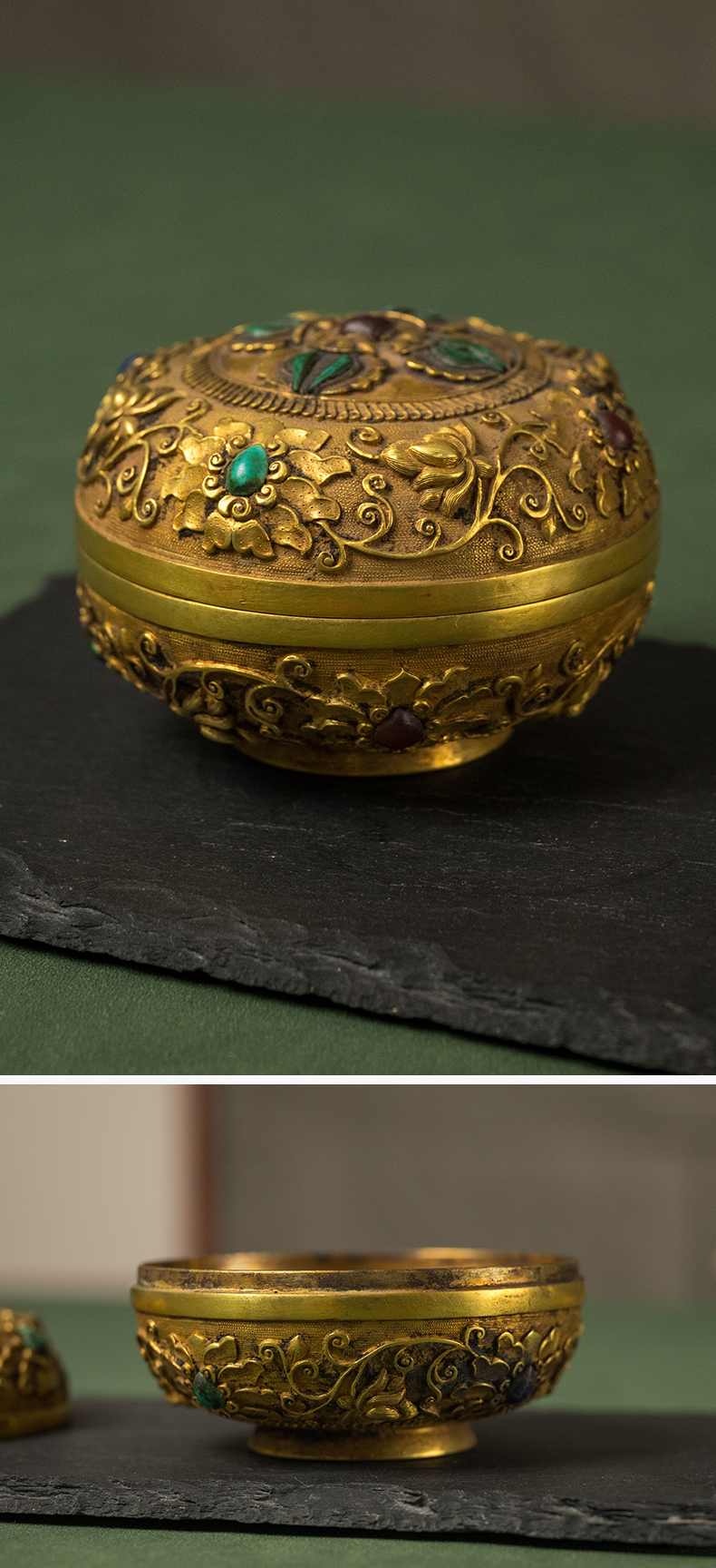 清 铜鎏金嵌宝石宝相花卉纹圆形香盒