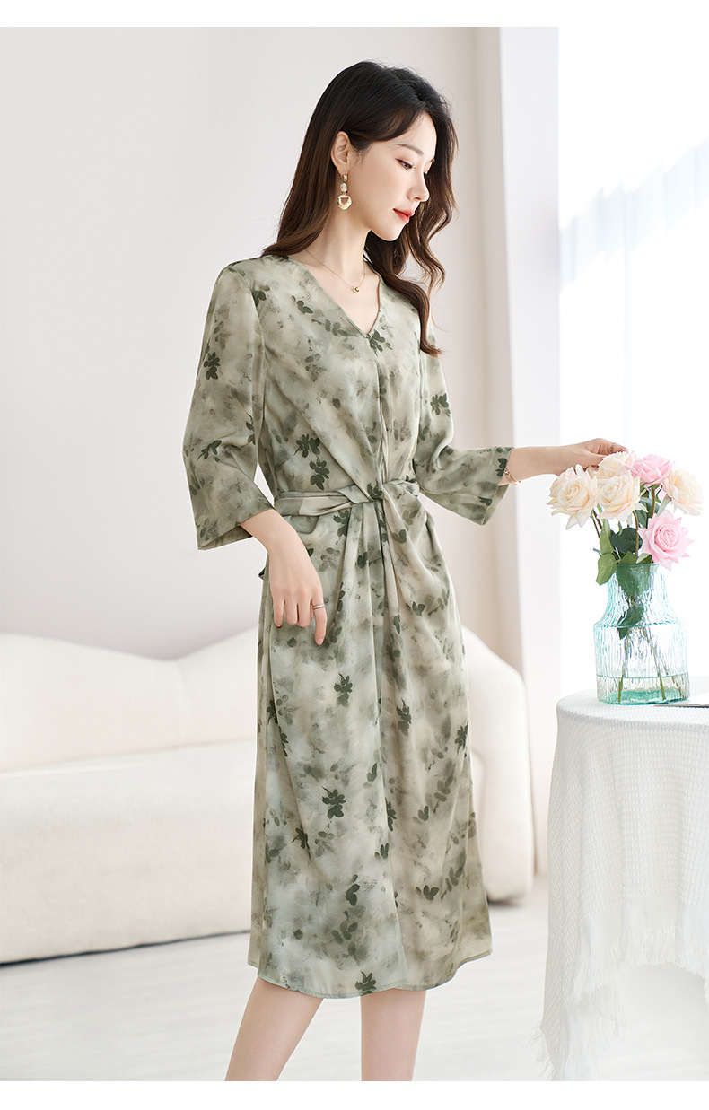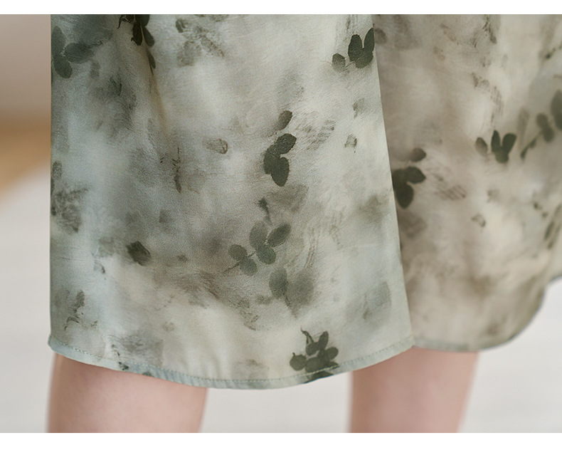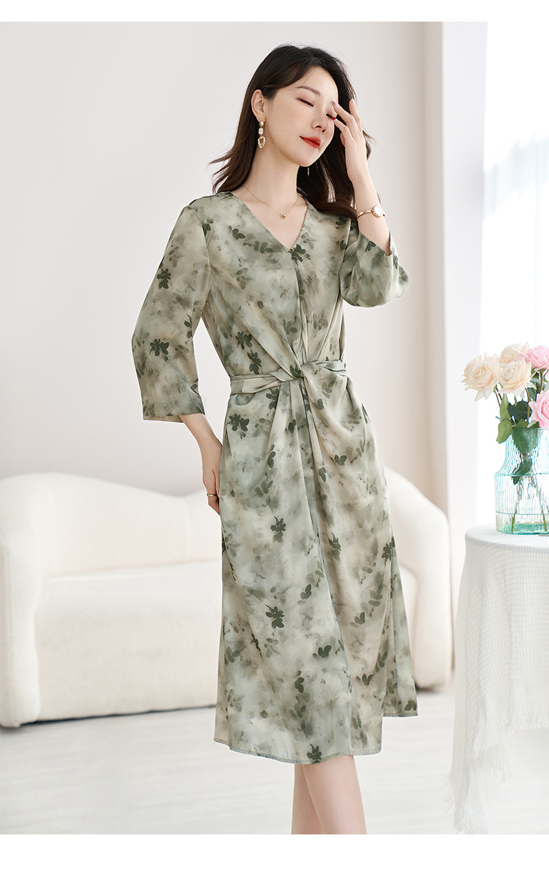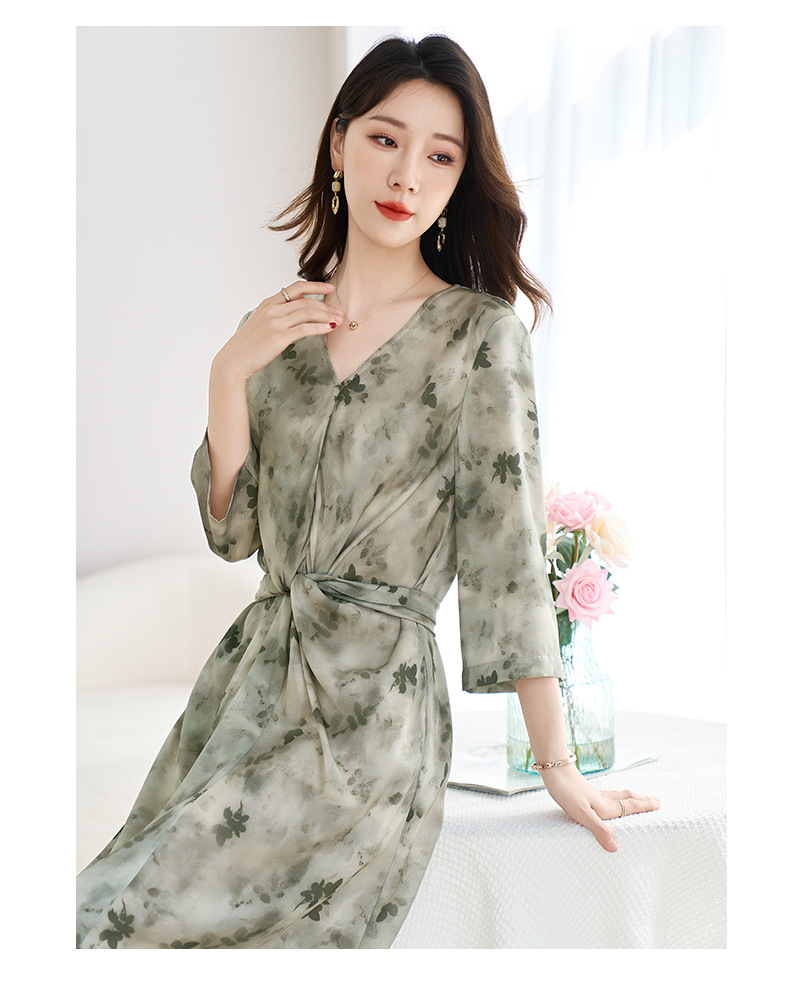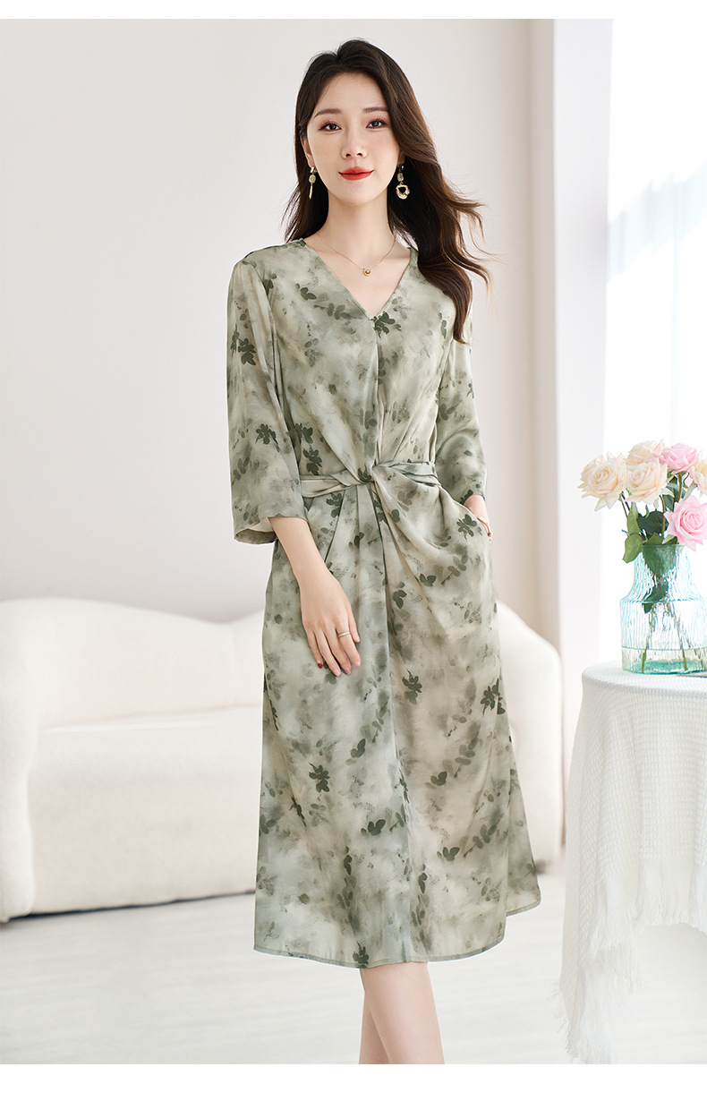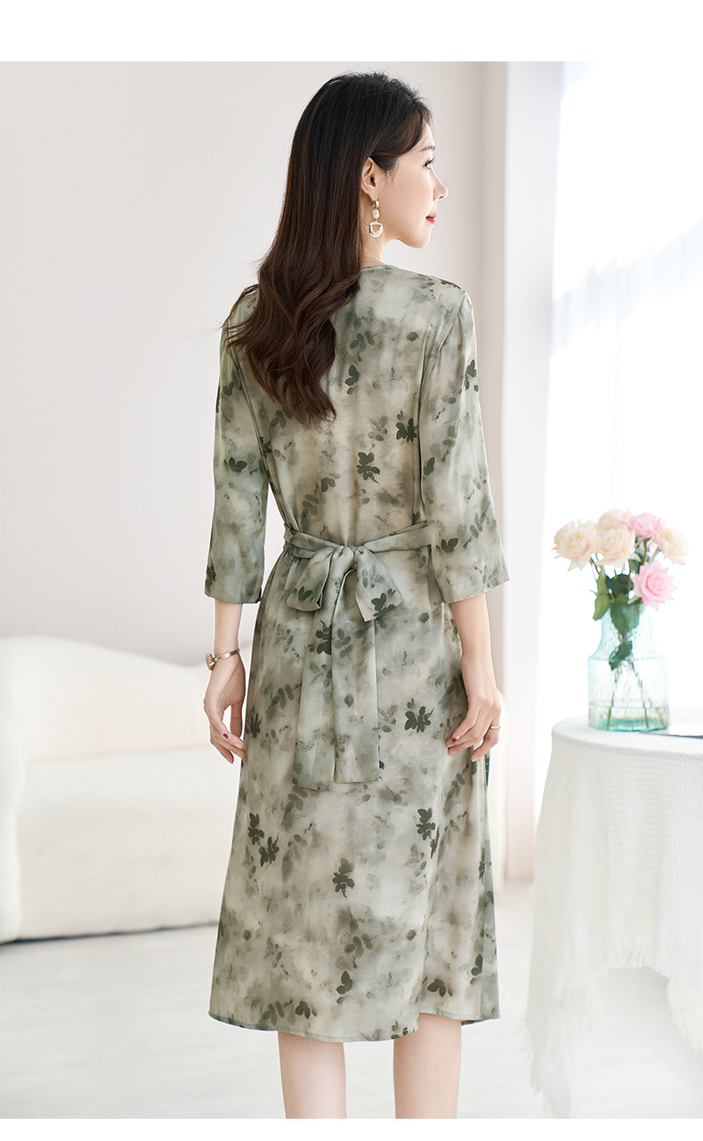QS-82598850【细腻柔滑】夏季丝粘弹力缎印花中长裙21.9%桑蚕丝连衣裙女8850