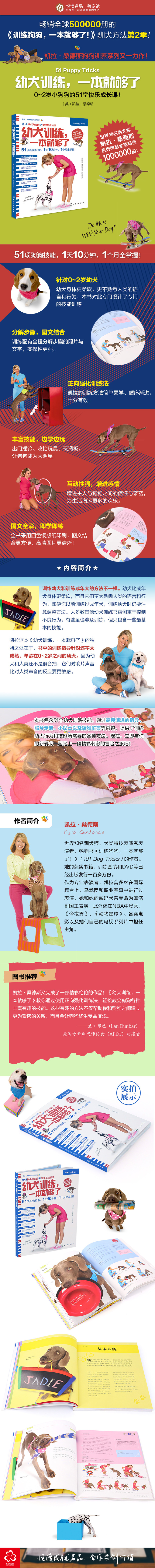 凯拉·桑德斯(Kyra Sundance):世界知名的驯犬师、犬类特技表演秀表演者,畅销书《训练狗狗,一本就够了》(101 Dog Tricks)的作者。她的获奖书籍、训练套装和DVD等已经出版发行100多万份,激励着全世界的狗主人与他们的爱犬建立起兴味盎然、收获满满的亲密关系。 作为专业表演者,她曾多次在国际舞台上、马戏团和职业赛事中进行过表演,她和她的威玛犬曾受命为摩洛哥国王表演,主演迪士尼的好莱坞舞台剧,此外还在NBA中场秀、《今夜秀》、《动物星球》、各类电影以及她们自己的电视系列片中担任主角。 经过几十年专业经验的磨练,她的方法简单易学、循序渐进,是十分有效且人性化的驯犬方法。她的正向训练法培养出的狗狗充满自信,它们会动力十足地去完成每个指示,也带给主人无限欢乐。