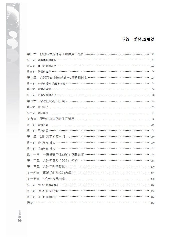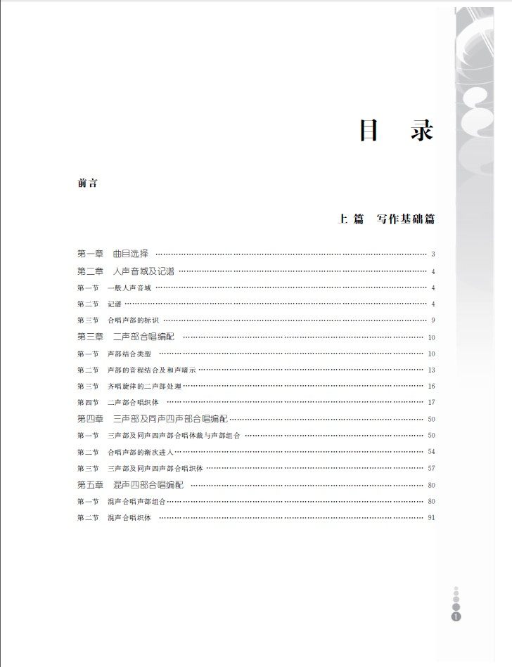 本书是一本实用的合唱编配教材,可帮助读者将歌曲、民歌、小型器乐曲改编成合唱。本书分为上下篇。上篇是写作的基础知识部分,合唱织体的了解占了大量篇幅;下篇是整体运用部分,还有完整的合唱曲分析,而且分析文字就写在需要说明的谱例位置上方,有点同眉批类似,使读者能在实例中掌握合唱编配的知识。本书还为第十二章“合唱变奏与合唱全曲分析”,第十三章“将器乐曲改编为合唱”附上九首合唱录音光碟以供读者进行音、谱对照研究之用。