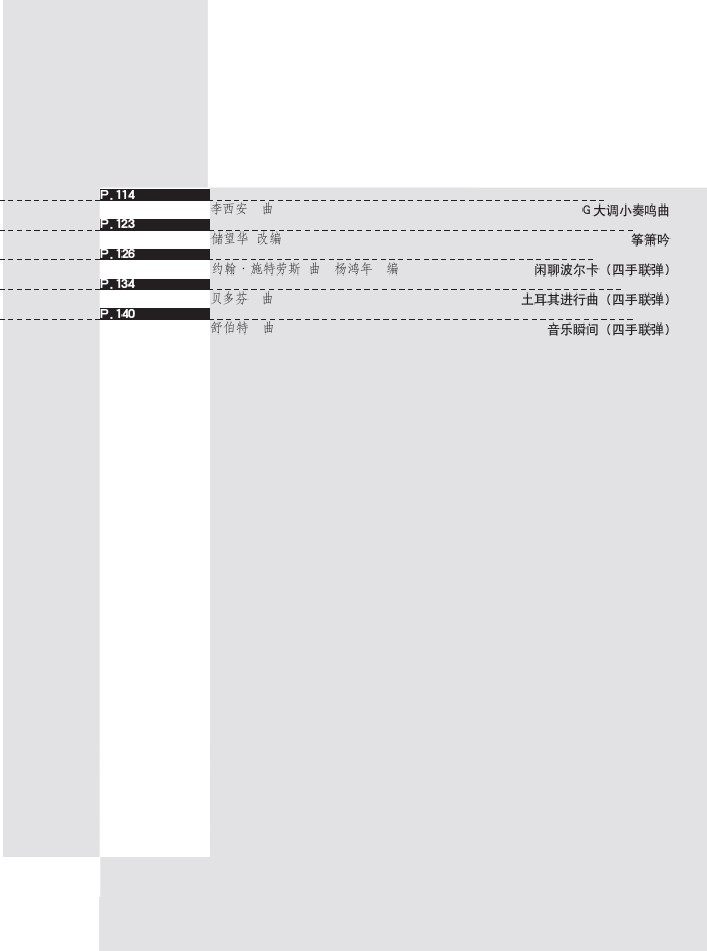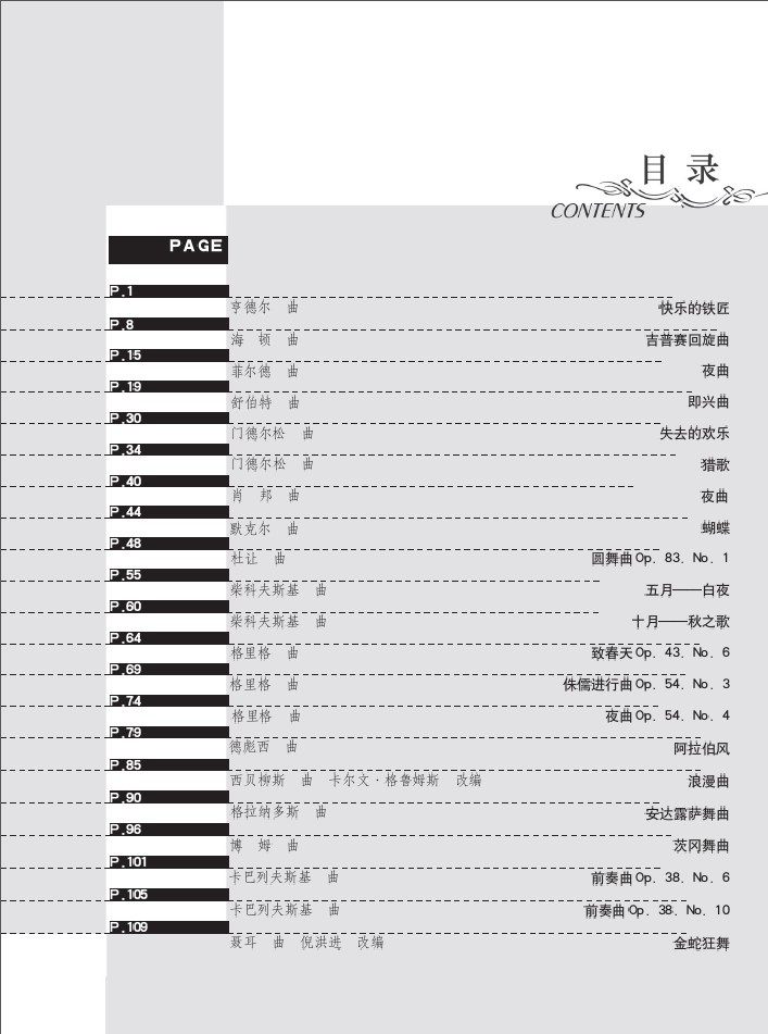 中外钢琴名曲(教学版)共三册,本册是第三册,内容适用于钢琴学习的中、高级阶段,相当于车尔尼299以上的程度。曲目包含了古典时期、浪漫时期以及近、现代部分作曲家的钢琴作品。每首曲子均附有作者简介、音乐情绪提示、调性与曲式、演奏提示等简要介绍,供学习者进一步了解、掌握、学习乐曲。曲目包括《吉普赛回旋曲》《失去的欢乐》《威土耳其进行曲》《音乐瞬间》《侏儒进行曲》等。