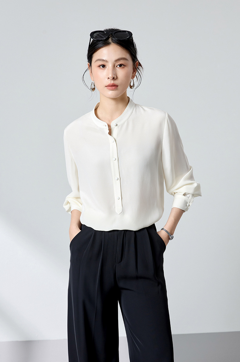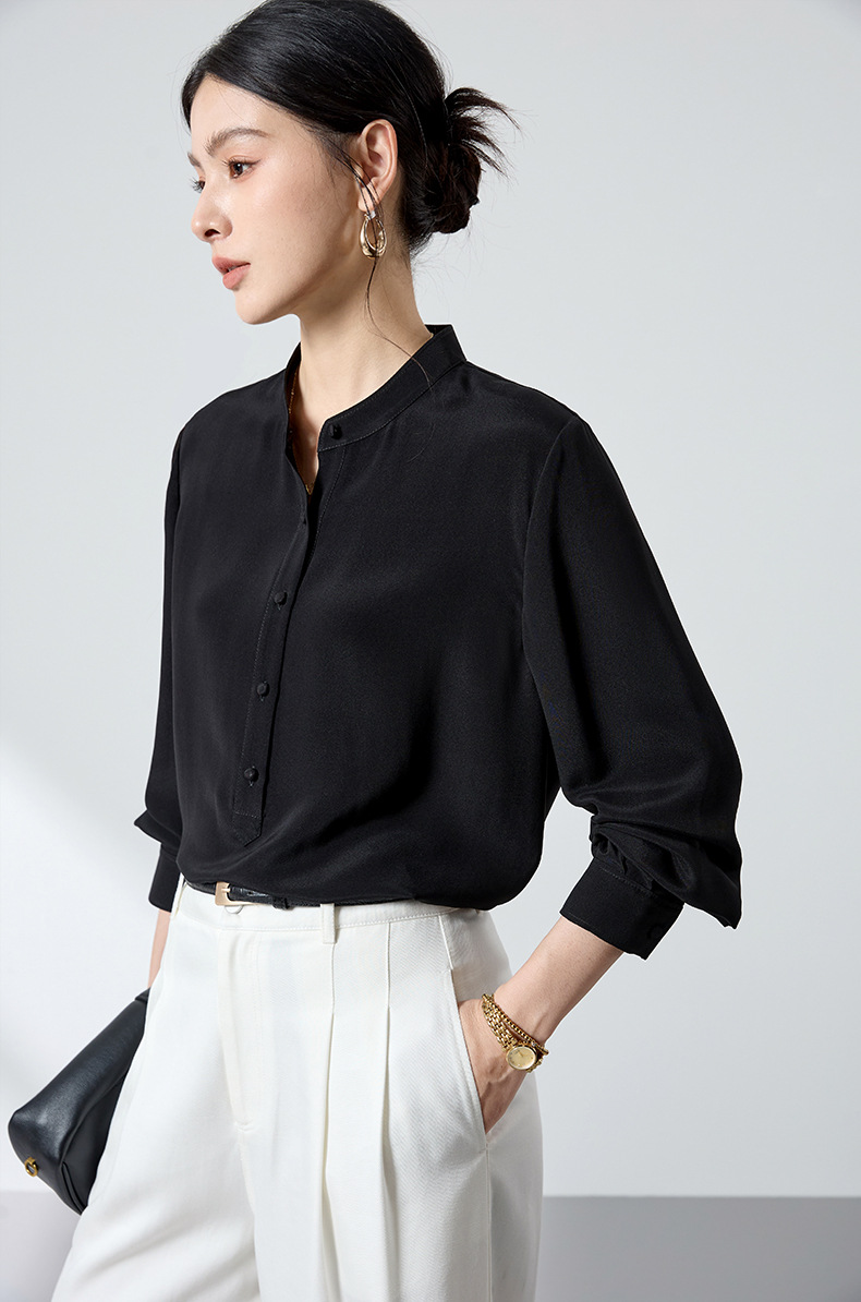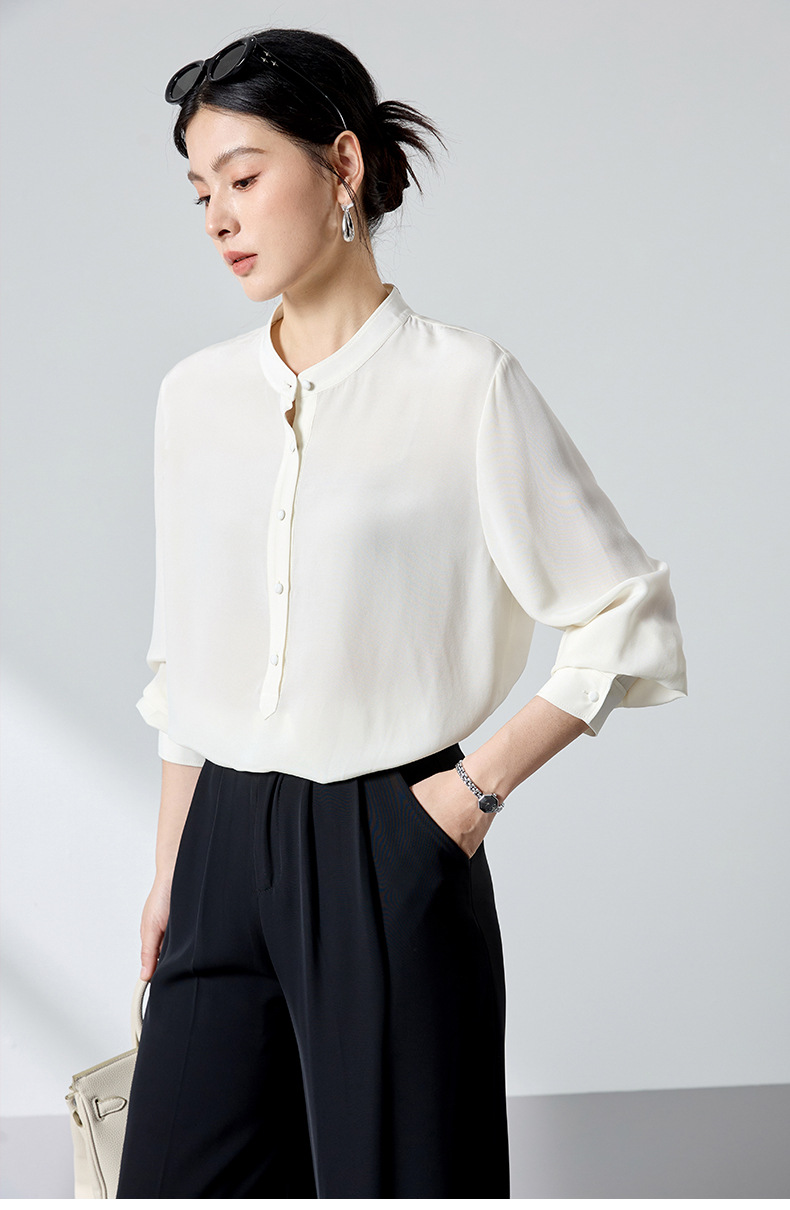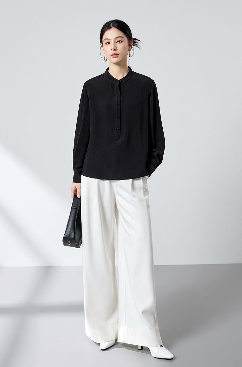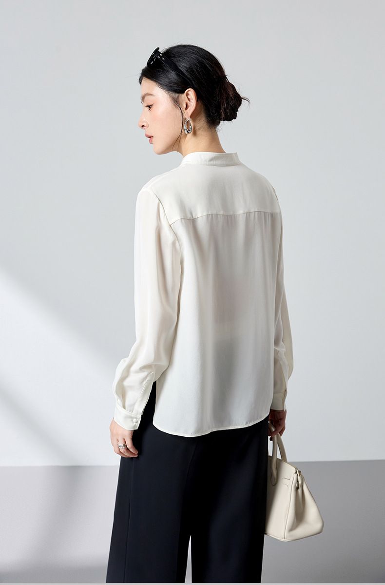 QS春简约通勤衬衫23姆米丝粘重绉立领垂坠显瘦蚕丝上衣2167