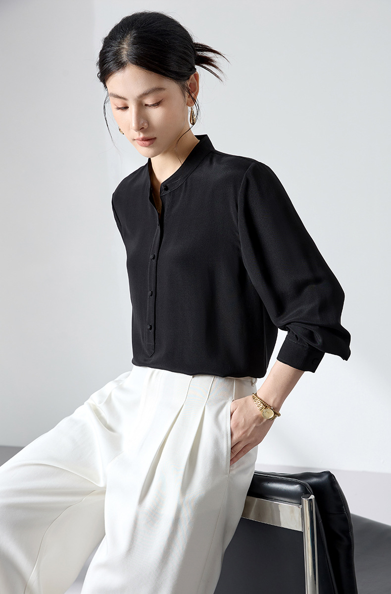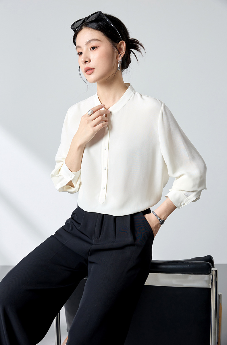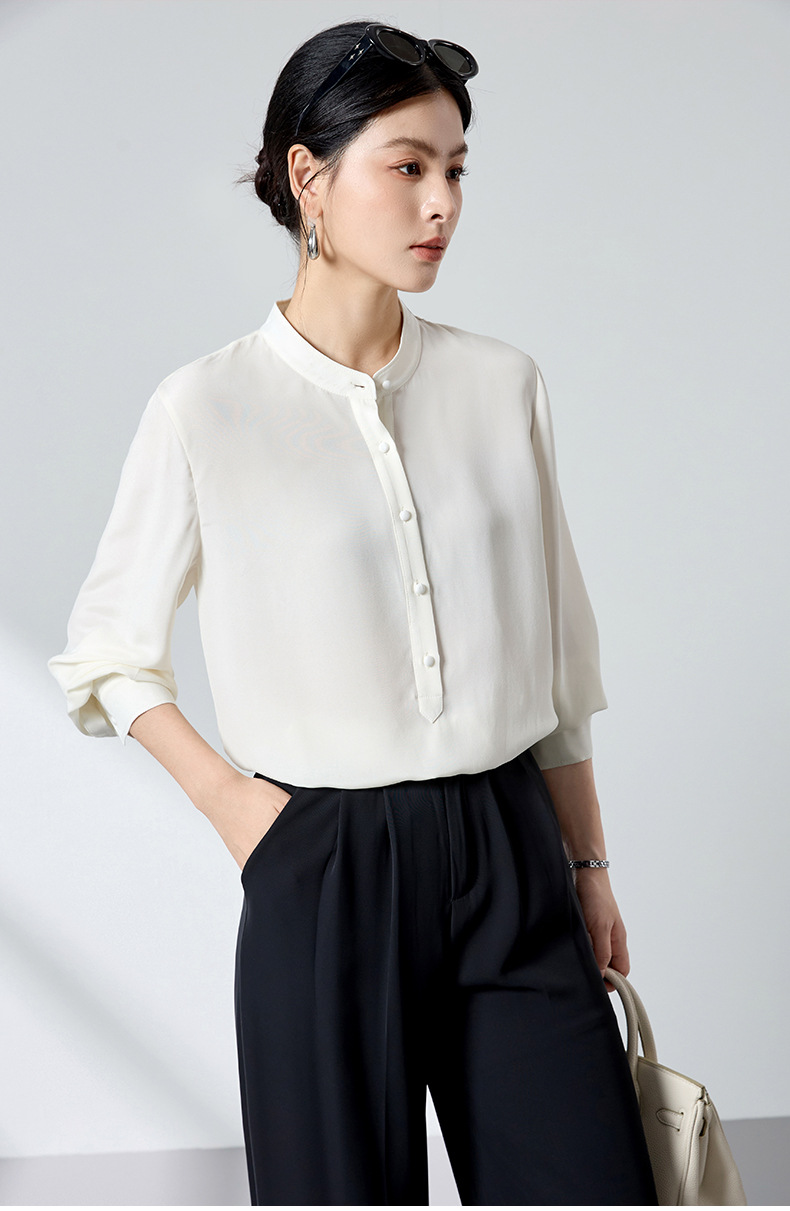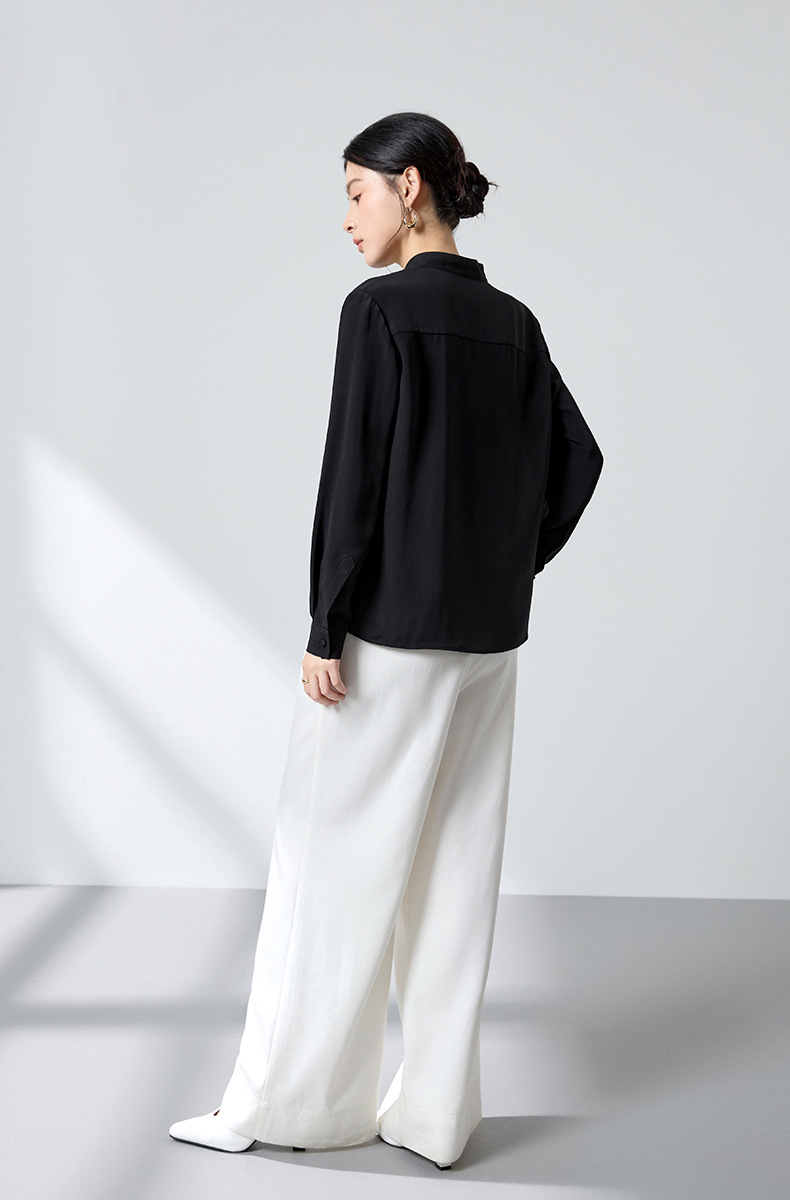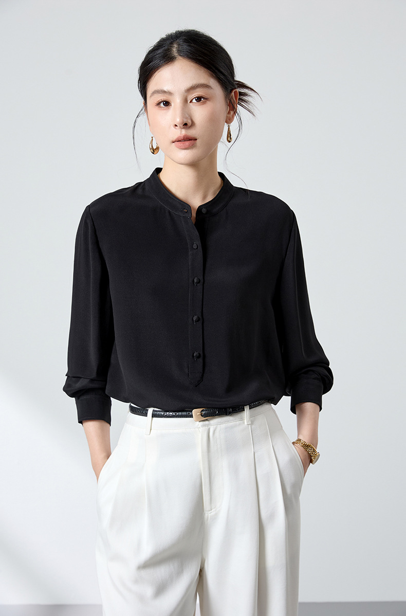 QS春简约通勤衬衫23姆米丝粘重绉立领垂坠显瘦蚕丝上衣2167