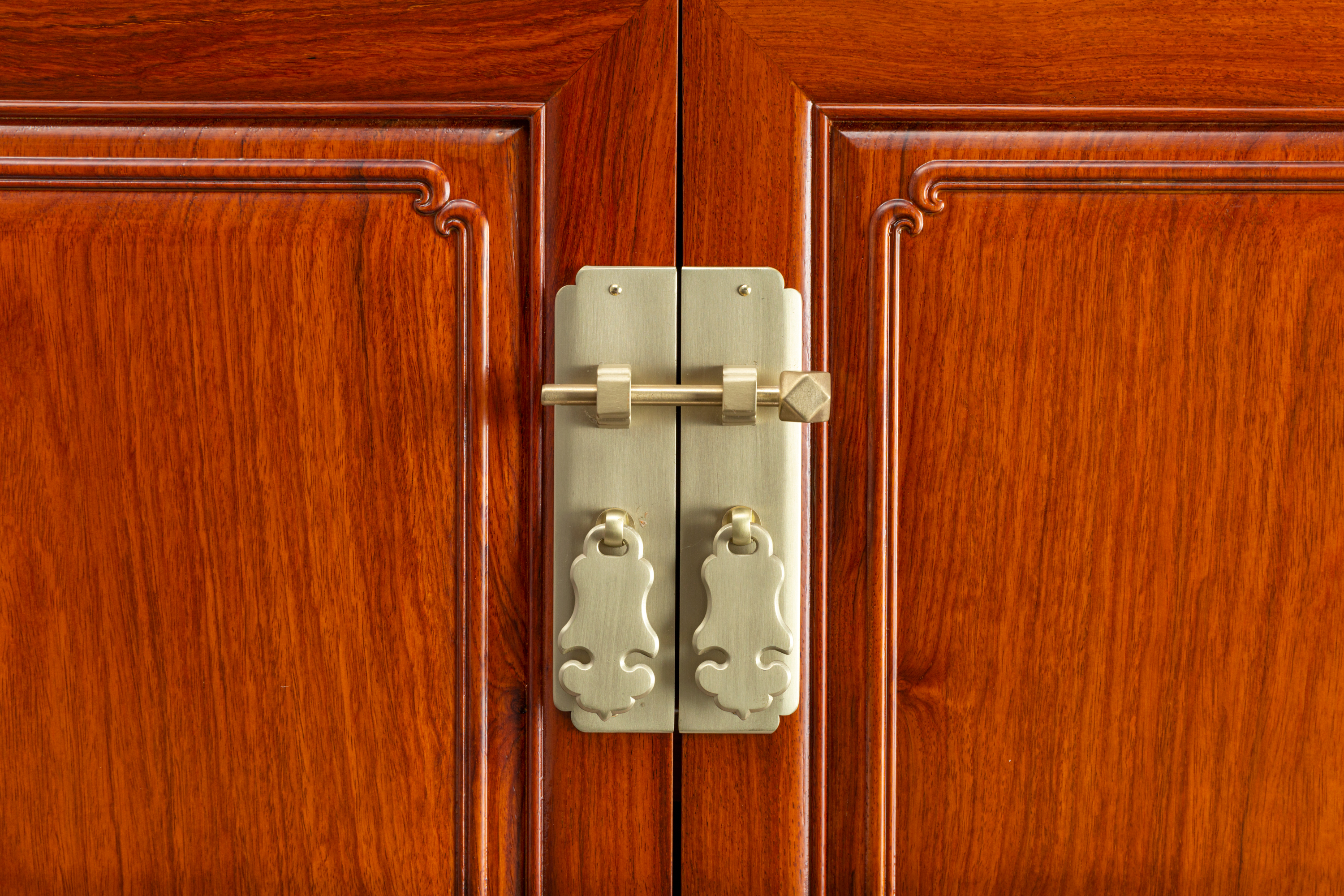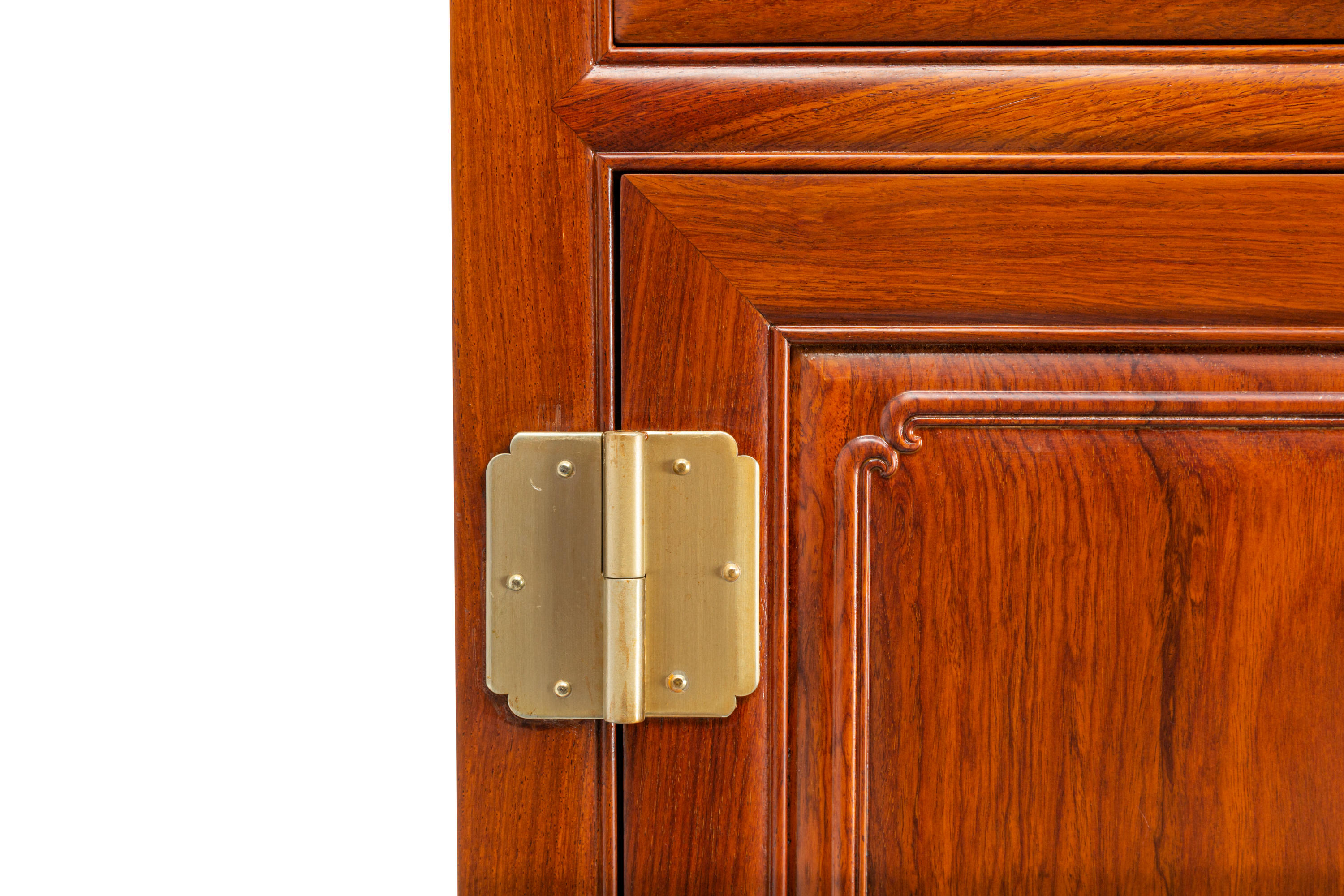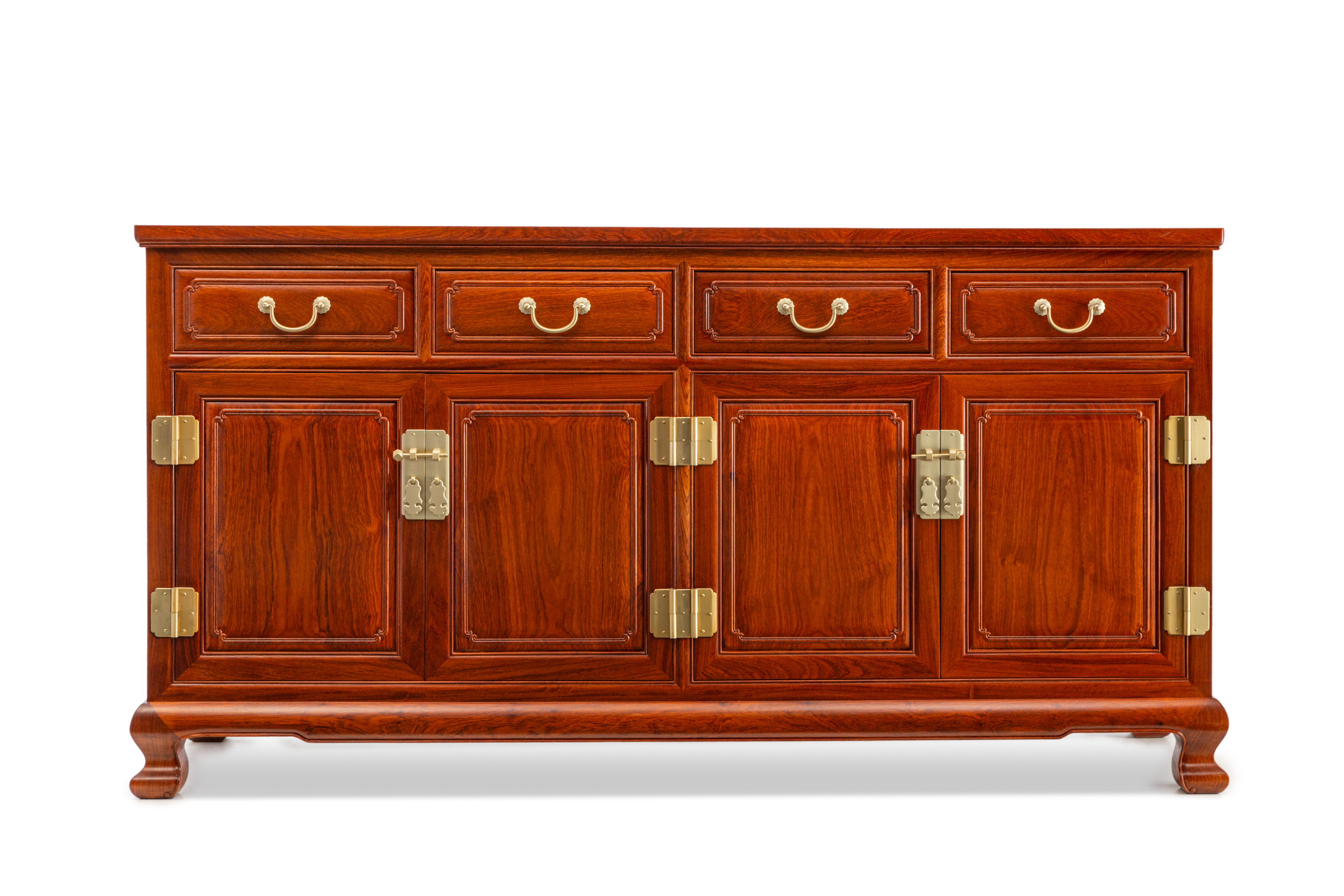 此款餐边柜长度刚好,高度适中,全器独板制,柜面四边攒框中部镶独板面心,面下设抽屉四具,一字并列,用于分类存放物件;抽屉面铲底起委角线,装有铜拉手,抽拉方便;下安双柜门,空间较大,柜门同料对开板,用同样的起线法铲底起委角线。柜内一侧空敞,可存放较大物件;另一侧加装一层屉板,分层收纳,归置有序。整体储物空间大,容量大,适合当代生活实用性。腿足作鼓腿彭牙状,用料甚厚,稳重而不失雅致,器形古雅清逸,收纳强大,宜用宜藏。