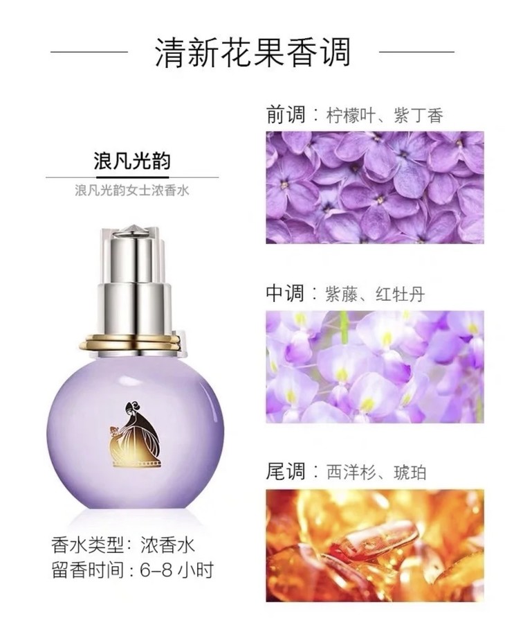 浪凡光韵女士浓香水#50ml/100ml(EDP)👍紫色浪漫💜,传说中的斩男香,从颜值到香味到性价比都无可挑剔的香水。以清新的柠檬口开场🍋,渐渐的加入粉粉的桃花香🌸、娇艳的杜丹香,甜味渐浓时又有茶香沁入🍵,使味道闻起来甜而不腻。尾调又以木质调结束,像是潺潺雨帘下怒放的鲜花。温柔又活泼,推荐20-30年龄段的仙女。